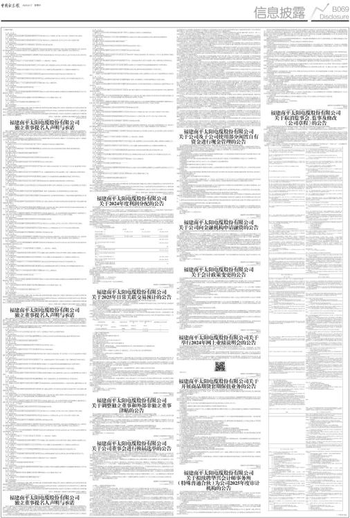 √ 是 □ 否 如否,请详细说明:______________________________ 十八、被提名人及其直系亲属不是直接或间接持有公司已发行股份1%以上的股东,也不是上市公司前十名股东中自然人股东。 √ 是 □ 否 如否,请详细说明:______________________________ 十九、被提名人及其直系亲属不在直接或间接持有公司已发行股份5%以上的股东任职,也不在上市公司前五名股东任职。 √ 是 □ 否 如否,请详细说明:______________________________ 二十、被提名人及其直系亲属不在公司控股股东、实际控制人的附属企业任职。 √ 是 □ 否 如否,请详细说明:______________________________ 二十一、被提名人不是为公司及其控股股东、实际控制人或者其各自的附属企业提供财务、法律、咨询、保荐等服务的人员,包括但不限于提供服务的中介机构的项目组全体人员、各级复核人员、在报告上签字的人员、合伙人、董事、高级管理人员及主要负责人。 √ 是 □ 否 如否,请详细说明:______________________________ 二十二、被提名人与上市公司及其控股股东、实际控制人或者其各自的附属企业不存在重大业务往来,也不在有重大业务往来的单位及其控股股东、实际控制人任职。 √ 是 □ 否 如否,请详细说明:______________________________ 二十三、被提名人在最近十二个月内不具有第十七项至第二十二项所列任一种情形。 √ 是 □ 否 如否,请详细说明:______________________________ 二十四、被提名人不是被中国证监会采取不得担任上市公司董事、监事、高级管理人员的证券市场禁入措施,且期限尚未届满的人员。 √ 是 □ 否 如否,请详细说明:______________________________ 二十五、被提名人不是被证券交易场所公开认定不适合担任上市公司董事、监事和高级管理人员,且期限尚未届满的人员。 √ 是 □ 否 如否,请详细说明:______________________________ 二十六、被提名人不是最近三十六个月内因证券期货犯罪,受到司法机关刑事处罚或者中国证监会行政处罚的人员。 √ 是 □ 否 如否,请详细说明:______________________________ 二十七、被提名人不是因涉嫌证券期货违法犯罪,被中国证监会立案调查或者被司法机关立案侦查,尚未有明确结论意见的人员。 √ 是 □ 否 如否,请详细说明:______________________________ 二十八、被提名人最近三十六月未受到证券交易所公开谴责或者三次以上通报批评。 √ 是 □ 否 如否,请详细说明:______________________________ 二十九、被提名人不存在重大失信等不良记录。 √ 是 □ 否 如否,请详细说明:______________________________ 三十、被提名人不是过往任职独立董事期间因连续两次未能亲自出席也不委托其他董事出席董事会会议被董事会提请股东大会予以解除职务,未满十二个月的人员。 √ 是 □ 否 如否,请详细说明:______________________________ 三十一、包括本次提名的公司在内,被提名人担任独立董事的境内上市公司数量不超过三家。 √ 是 □ 否 如否,请详细说明:______________________________ 三十二、被提名人在公司连续担任独立董事未超过六年。 √ 是 □ 否 如否,请详细说明:______________________________ 提名人郑重承诺: 一、本提名人保证上述声明真实、准确、完整,没有虚假记载、误导性陈述或重大遗漏;否则,本提名人愿意承担由此引起的法律责任和接受深圳证券交易所的自律监管措施或纪律处分。 二、本提名人授权公司董事会秘书将本声明的内容通过深圳证券交易所业务专区录入、报送给深圳证券交易所或对外公告,董事会秘书的上述行为视同为本提名人行为,由本提名人承担相应的法律责任。 三、被提名人担任独立董事期间,如出现不符合独立性要求及独立董事任职资格情形的,本提名人将及时向公司董事会报告并督促被提名人立即辞去独立董事职务。 提名人(签署/盖章):福建南平太阳电缆股份有限公司董事会 2025年04月15日 证券代码:002300 证券简称:太阳电缆 公告编号:2025-025 福建南平太阳电缆股份有限公司 独立董事提名人声明与承诺 提名人福建南平太阳电缆股份有限公司董事会现就提名江平开为福建南平太阳电缆股份有限公司第十一届董事会独立董事候选人发表公开声明。被提名人已书面同意作为福建南平太阳电缆股份有限公司第十一届董事会独立董事候选人(参见该独立董事候选人声明)。本次提名是在充分了解被提名人职业、学历、职称、详细的工作经历、全部兼职、有无重大失信等不良记录等情况后作出的,本提名人认为被提名人符合相关法律、行政法规、部门规章、规范性文件和深圳证券交易所业务规则对独立董事候选人任职资格及独立性的要求,具体声明并承诺如下事项: 一、被提名人已经通过福建南平太阳电缆股份有限公司第十届董事会提名委员会或者独立董事专门会议资格审查,提名人与被提名人不存在利害关系或者其他可能影响独立履职情形的密切关系。 √ 是 □ 否 如否,请详细说明:______________________________ 二、被提名人不存在《中华人民共和国公司法》第一百四十六条等规定不得担任公司董事的情形。 √ 是 □ 否 如否,请详细说明:______________________________ 三、被提名人符合中国证监会《上市公司独立董事管理办法》和深圳证券交易所业务规则规定的独立董事任职资格和条件。 √√ 是 □ 否 如否,请详细说明:______________________________ 四、被提名人符合公司章程规定的独立