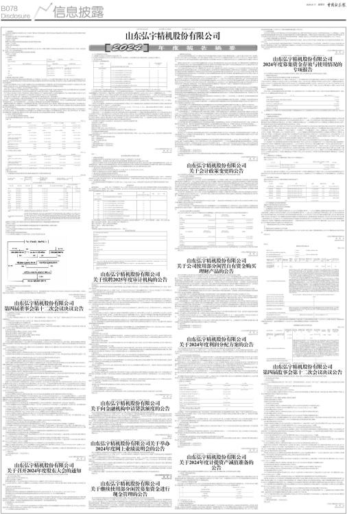证券代码:002890 证券简称:弘宇股份 公告编号:2025-014 一、重要提示 本年度报告摘要来自年度报告全文,为全面了解本公司的经营成果、财务状况及未来发展规划,投资者应当到证监会指定媒体仔细阅读年度报告全文。 所有董事均已出席了审议本报告的董事会会议。 非标准审计意见提示 □适用√不适用 董事会审议的报告期利润分配预案或公积金转增股本预案 √适用 □不适用 是否以公积金转增股本 □是√否 公司经本次董事会审议通过的利润分配预案为:以169,875,160股为基数,向全体股东每10股派发现金红利0.26元(含税),送红股0股(含税),不以公积金转增股本。 董事会决议通过的本报告期优先股利润分配预案 □适用 □不适用 二、公司基本情况 1、公司简介 ■ 2、报告期主要业务或产品简介 公司的主营业务是农用拖拉机提升器的研发、生产和销售,产品包括大、中马力提升器及其配件,提升器产品作为农用拖拉机的工作装置系统,主要发挥着连接农具、控制农具并保证拖拉机能够实现多种田间作业的功能,其与发动机、底盘、变速箱等同属于农用拖拉机的核心组成部件。 公司作为农用拖拉机主机生产组装厂商的配套企业,其业绩及发展与下游拖拉机主机的市场及发展状况高度相关;尤其是公司作为提升器细分市场的龙头企业,业务拓展及发展与下游拖拉机主机的市场及发展状况有着更高的相关度。 公司采取了研发、生产和销售一体化的经营模式,具体为: 研发方面,公司拥有自己的研发技术团队,主要负责适配于各拖拉机类型所需要产品的开发和技术改进,经过长期积累沉淀以及对国外先进技术的消化吸收和再创新,公司多年来持续保持着产品领先和技术领先,并拥有多项发明专利; 生产方面,公司采取了自主生产和委外加工相结合的模式,对于产品的核心部件,公司绝对掌握其生产加工的技术和能力并进行自主生产,对于部分非核心部件以零星标准件,公司委托部分优质配套厂商予以加工或直接采购; 销售方面,作为拖拉机主机厂商配套单位,公司采取直接向下游拖拉机主机厂销售的模式。 公司属于专用设备制造业,为拖拉机配套零部件生产商,是国内首批获得中国农业机械工业协会零部件分会授予的行业龙头企业称号的企业之一,被国家工业和信息化部授予专精特新“小巨人”企业称号。通过追随拖拉机主机厂的变化,为其提供配套部件,间接满足终端市场的需求变化。但产品用途相对单一,公司业绩受下游拖拉机行业波动及景气度影响明显。 随着农业机械化水平不断提高,土地规模经营不断加快,市场对农机具的大型化、精准化、智能化等升级换代需求成为了拉动拖拉机行业发展的主要因素,中大型拖拉机功率上延趋势继续发展。下游拖拉机主机厂也在不断适应市场变化,持续推出满足市场需求的、更好性能、更高功率的拖拉机。 2024年,公司紧密围绕农业机械化“补短板、强智能”主线,以技术升级驱动产品高端化,以供应链韧性支撑成本优势,在行业结构性分化中巩固龙头地位。未来将继续聚焦大功率智能化方向,拓展新兴市场,构建全生命周期服务体系,实现从“核心部件供应商”向“智能作业方案服务商”的战略升级,紧抓技术升级与海外拓展机遇,优化应收账款管理,迎接新一轮发展周期。 3、主要会计数据和财务指标 (1)近三年主要会计数据和财务指标 公司是否需追溯调整或重述以前年度会计数据 □是√否 单位:元 ■ (2)分季度主要会计数据 单位:元 ■ 上述财务指标或其加总数是否与公司已披露季度报告、半年度报告相关财务指标存在重大差异 □是√否 4、股本及股东情况 (1)普通股股东和表决权恢复的优先股股东数量及前10名股东持股情况表 单位:股 ■ 持股5%以上股东、前10名股东及前10名无限售流通股股东参与转融通业务出借股份情况 □适用√不适用 前10名股东及前10名无限售流通股股东因转融通出借/归还原因导致较上期发生变化 □适用√不适用 (2)公司优先股股东总数及前10名优先股股东持股情况表 □适用√不适用 公司报告期无优先股股东持股情况。 (3)以方框图形式披露公司与实际控制人之间的产权及控制关系 ■ 5、在年度报告批准报出日存续的债券情况 □适用√不适用 三、重要事项 公司于2024年12月6日召开第四届董事会第十次会议、第四届监事会第十次会议以及于2024年12月23日召开2024年度第一次临时股东大会审议通过了《关于募集资金投资项目重新论证并变更的议案》。 山东弘宇精机股份有限公司 法定代表人:楸秋杰 2025年4月16日 证券代码:002890 证券简称:弘宇股份 公告编号:2025-012 山东弘宇精机股份有限公司 第四届董事会第十二次会议决议公告 本公司及董事会全体成员保证信息披露的内容真实、准确、完整,没有虚假记载、误导性陈述或重大遗漏。 一、董事会会议召开情况 1、会议召开情况 (1)山东弘宇精机股份有限公司(下称“公司”)第四届董事会第十二次会议(下称“会议”)通知以通讯方式于2025年4月5日向各位董事发出。 (2)本次会议于2025年4月16日14:00在公司三楼会议室以现场结合通讯方式召开。 (3)本次会议应到董事7名,实到董事7名。 (4)公司董事长柳秋杰先生主持了会议,公司全体监事、高管列席了本次会议。 (5)本次会议的通知、召集和召开符合《中华人民共和国公司法》、《深圳证券交易所