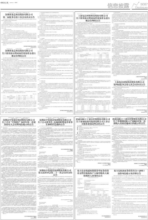 ■ 上海复洁环保科技股份有限公司 关于使用部分暂时闲置募集资金进行现金管理的公告 本公司董事会及全体董事保证本公告内容不存在任何虚假记载、误导性陈述或者重大遗漏,并对其内容的真实性、准确性和完整性依法承担法律责任。 上海复洁环保科技股份有限公司(以下简称“公司”)于2025年4月16日召开第四届董事会第七次会议、第四届监事会第七次会议,审议通过了《关于使用部分暂时闲置募集资金进行现金管理的议案》,同意公司使用不超过人民币1.8亿元(含本数)的部分暂时闲置募集资金进行现金管理,在确保募集资金安全及不影响公司日常经营业务开展的情况下,用于购买安全性高、流动性好的保本型投资产品(包括但不限于购买结构性存款、大额存单、定期存款、通知存款等),使用期限自第四届董事会第七次会议审议通过之日起12个月内有效。在上述额度和决议有效期限内,资金可循环滚动使用。公司董事会授权董事长在授权额度和决议有效期内行使该项投资决策权并签署相关法律文件,具体事项由公司财务部负责组织实施和管理。公司监事会对以上事项发表了明确同意的意见,公司保荐机构国泰海通证券股份有限公司(原海通证券股份有限公司,以下简称“保荐机构”)对本事项出具了明确无异议的核查意见。现将具体情况公告如下: 一、募集资金基本情况 经中国证券监督管理委员会《关于同意上海复洁环保科技股份有限公司首次公开发行股票注册的批复》(证监许可〔2020〕1532号)同意注册,并经上海证券交易所同意,公司首次公开发行人民币普通股(A股)1,820.00万股,每股面值1.00元,每股发行价格为人民币46.22元。本次公开发行募集资金总额为人民币84,120.40万元,扣除本次发行费用人民币7,749.21万元(不含增值税),募集资金净额为人民币76,371.19万元。本次募集资金已于2020年8月11日全部到位,天健会计师事务所(特殊普通合伙)于2020年8月11日对资金到位情况进行了审验,并出具了《验资报告》(天健验[2020]6-56号)。 为规范公司募集资金管理和使用,上述募集资金到账后,已全部存放于经公司董事会批准开设的募集资金专项账户内,公司及子公司已与保荐机构、存放募集资金的商业银行签署了募集资金三方/四方监管协议。 二、公司募集资金使用情况 根据公司《首次公开发行股票并在科创板上市招股说明书》《关于变更部分募投项目实施主体、实施地点、实施方式及延期并向全资子公司增资以实施募投项目的公告》(公告编号:2021-011)、《关于变更部分募投项目实施地点的公告》(公告编号:2021-035)中披露的内容,本次公开发行股票募集资金投资项目情况如下: ■ 2023年12月27日,公司召开第三届董事会第十八次会议、第三届监事会第十六次会议,审议通过了《关于首次公开发行股票募投项目结项并将部分节余募集资金永久补充流动资金的议案》,同意公司将首次公开发行股票募集资金投资项目“低温真空脱水干化成套技术装备扩建项目”“环保技术与设备研发新建项目”结项,并将部分节余募集资金6,000万元用于永久补充公司流动资金,具体内容详见公司于2023年12月28日在上海证券交易所网站(www.sse.com.cn)披露的《关于首次公开发行股票募投项目结项并将部分节余募集资金永久补充流动资金的公告》(公告编号:2023-081)。 截至2024年12月31日,公司首次公开发行股票募集资金投资项目的募集资金存放与使用情况,详见公司于2025年3月29日在上海证券交易所网站(www.sse.com.cn)披露的《2024年度募集资金存放与使用情况的专项报告》(公告编号:2025-012)。 三、本次使用部分暂时闲置募集资金进行现金管理的具体情况 (一)投资目的 为进一步规范公司募集资金的使用与管理,在不影响募集资金投资项目及使用计划和公司正常经营的前提下,合理利用部分暂时闲置募集资金进行现金管理,可以提高募集资金使用效率,增加公司现金资产收益,实现股东利益最大化。 (二)投资额度及期限 公司计划使用额度不超过人民币1.8亿元(含本数)的部分暂时闲置募集资金进行现金管理,使用期限自第四届董事会第七次会议审议通过之日起不超过12个月,在前述额度和期限范围内,资金可循环滚动使用。 (三)投资产品品种 公司将按照相关规定严格控制风险,拟使用部分暂时闲置募集资金购买期限不超过12个月,安全性高、流动性好的保本型投资产品(包括但不限于购买结构性存款、大额存单、定期存款、通知存款等),且该等现金管理产品不得用于质押,不用于以证券投资为目的的投资行为。 (四)决议有效期 自公司董事会审议通过之日起12个月内有效。 (五)实施方式 公司董事会授权公司董事长全权在额度范围内行使该项投资决策权并签署相关法律文件,包括但不限于选择合格的专业金融机构、选择产品/业务品种、明确现金管理金额、期间、签署合同及协议等,具体事项由公司财务部负责组织实施。 (六)信息披露 公司将按照《上市公司监管指引第2号一一上市公司募集资金管理和使用的监管要求》《上海证券交易所科创板股票上市规则》《上海证券交易所科创板上市公司自律监管指引第1号一一规范运作》等相关法律、法规及规范性文件的要求,及时履行信息披露义务,不会变相改变募集资金用途。 (七)现金管理收益分配 公司使用部分暂时闲置募集资金进行现金管理所获得