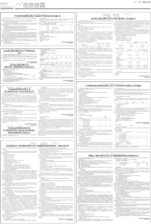 证券代码:601169 证券简称:北京银行 公告编号:2025-025 北京银行股份有限公司关于董事辞任的 公告 本公司董事会及全体董事保证本公告内容不存在任何虚假记载、误导性陈述或者重大遗漏,并对其内容的真实性、准确性和完整性承担个别及连带责任。 北京银行股份有限公司(简称“本行”)董事会于近日收到成苏宁先生提交的书面辞呈。因工作原因,成苏宁先生辞去本行董事及董事会相关专门委员会职务。成苏宁先生的辞任自辞呈送达本行董事会之日起生效。 经成苏宁先生确认,其与本行董事会无不同意见,亦无任何与其辞任有关的事项需要通知本行股东。 本行董事会谨此对成苏宁先生为本行做出的贡献表示衷心感谢。 特此公告。 北京银行股份有限公司董事会 2025年4月17日 证券代码:601169 证券简称:北京银行 公告编号:2025-024 北京银行股份有限公司 2025年第二次临时股东大会决议公告 本公司董事会及全体董事保证本公告内容不存在任何虚假记载、误导性陈述或者重大遗漏,并对其内容的真实性、准确性和完整性承担法律责任。 重要内容提示: ● 本次会议是否有否决议案:无 一、会议召开和出席情况 (一)股东大会召开的时间:2025年4月16日 (二)股东大会召开的地点:北京银行总行三层新闻发布厅 (三)出席会议的普通股股东和恢复表决权的优先股股东及其持有股份情况: ■ (四)表决方式是否符合《公司法》及《公司章程》的规定,大会主持情况等 本次大会由董事会召集,采用现场投票和网络投票相结合的表决方式。会议的召开符合《中华人民共和国公司法》和《北京银行股份有限公司章程》的规定。 (五)公司董事、监事和董事会秘书的出席情况 1、公司在任董事9人,出席9人; 2、公司在任监事5人,出席5人; 3、董事会秘书出席会议;高级管理人员列席会议。 二、议案审议情况 (一)非累积投票议案 1、议案名称:关于选举戴炜先生为董事的议案 审议结果:通过 表决情况: ■ 2、议案名称:关于选举王雪松女士为独立董事的议案 审议结果:通过 表决情况: ■ (二)涉及重大事项,5%以下股东的表决情况 ■ (三)关于议案表决的有关情况说明 上述议案均为普通决议议案,经出席会议的有表决权的普通股股东所持表决权二分之一以上同意,获得通过。 三、律师见证情况 1、本次股东大会见证的律师事务所:北京天达共和律师事务所 律师:傅卓婷、程静 2、律师见证结论意见: 公司本次股东大会的召集及召开程序,出席本次股东大会人员、召集人的资格符合相关法律、法规及《公司章程》的规定,本次股东大会表决程序、表决结果符合相关法律、法规及《公司章程》的规定,决议合法有效。 特此公告。 北京银行股份有限公司董事会 2025年4月17日