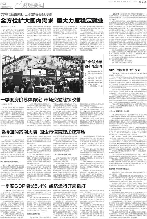 一季度,经济增长稳中有升。数据显示,一季度GDP同比增长5.4%,增速高于去年全年5%的增速,也高于去年一季度5.3%的增速,在全球主要经济体中名列前茅,延续了去年以来持续回升向好的态势。生产需求指标加快回升,全部工业增加值增长6.3%,比去年全年回升0.6个百分点;服务业增加值增长5.3%,回升0.3个百分点;固定资产投资增长4.2%,比去年全年回升1个百分点;社会消费品零售总额增长4.6%,回升1.1个百分点。
