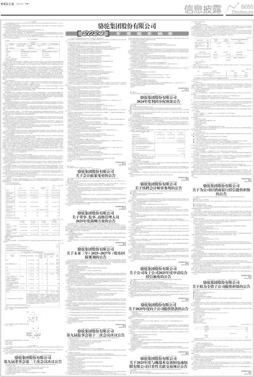 公司代码:601311 公司简称:骆驼股份 骆驼集团股份有限公司 第一节 重要提示 1、本年度报告摘要来自年度报告全文,为全面了解本公司的经营成果、财务状况及未来发展规划,投资者应当到http://www.sse.com.cn/网站仔细阅读年度报告全文。 2、本公司董事会、监事会及董事、监事、高级管理人员保证年度报告内容的真实性、准确性、完整性,不存在虚假记载、误导性陈述或重大遗漏,并承担个别和连带的法律责任。 3、公司全体董事出席董事会会议。 4、中审众环会计师事务所(特殊普通合伙)为本公司出具了标准无保留意见的审计报告。 5、董事会决议通过的本报告期利润分配预案或公积金转增股本预案 经中审众环会计师事务所(特殊普通合伙)审计,骆驼集团股份有限公司2024年度归属于上市公司股东的净利润为613,972,161.65元,截至2024年12月31日,母公司未分配利润为5,579,869,577.66元。公司拟以2024年度利润分配实施方案确定的股权登记日的总股本为基数,向全体股东每10股派发现金红利2.90元(含税),剩余未分配利润结转以后年度分配。 截至2025年3月31日,公司总股本为1,173,146,118股,以此为基数计算,合计拟派发现金红利340,212,374.22元(含税),占本年度归属于上市公司股东的净利润的55.41%。 第二节 公司基本情况 1、公司简介 ■ ■ 2、报告期公司主要业务简介 1、汽车低压铅酸电池行业 2024年,中国新车市场产销分别完成3128.2万辆和3143.6万辆,同比分别增长3.7%和4.5%,连续16年领先全球市场;促消费等政策和市场自发驱动力成为今年车市的主要推动力。多部委在7月印发的《关于加力支持大规模设备更新和消费品以旧换新的若干措施》中指出,要提高汽车报废更新补贴标准。据相关数据统计,全年汽车以旧换新补贴申请量合计突破500万份,其中,汽车报废更新超过290万辆,置换更新超过370万辆。 乘用车产销量在保持2600万辆以上规模的基础上再创新高,有效的拉动了新车市场的整体增长。其中,中国品牌乘用车销量高达1797万辆,同比增幅达23.1%,市场份额为65.2%,较上一年同期增长9.2个百分点。商用车出口表现强劲,有效的支撑了全年产销量。 维护替换市场方面,全球汽车产业快速发展,汽车电子化程度显著提升,各个国家和地区的消费者对低压电池维护和更换的需求日益多样化与精细化,对产品品质与服务响应提出了更高的要求。行业内企业针对市场变化,积极推行了一系列优化创新举措,引入新技术、新工艺、新材料,提升产品的耐用性、性能及智能化水平;借助新技术新科技,通过加强品牌宣传与产品推广,优化“线上线下相结合”的销售网络,更精准地捕捉市场需求,实现了销售渠道的多元化与信息化,更好地满足了全球各大市场的需求,提升了客户整体满意度。 与此同时,乘用车启停电池进入集中更换周期,乘用车和商用车加装车载电源和驻车空调电池成为越来越多车主的选择。近年来,政策不断地完善,行业发展愈发成熟,整体经营环境更加有序。随着消费者对产品品质和售后服务需求的提升,具有渠道竞争力的企业有望赢得更多的市场青睐和份额。在汽车产业新趋势新生态的推进下,低压电池企业在产品体验端、服务端不断的优化升级,更好地迎接未来的挑战。 2、汽车低压锂电池行业 新能源汽车市场继续保持较高增速。2024年,新能源汽车年产销首次突破1200万辆,产销量分别完成1288.8万辆和1286.6万辆,同比增幅高达34.4%和35.5%。市场占有率也达到了40.9%,较上一年同期提升9.3个百分点。中国已经连续十年成为全球新能源汽车销量第一名。市场对新能源汽车的接受度越来越高,中国新能源汽车产业继续扩大领先优势。 2024年度国内汽车出口量也创下了新高,全年实现出口销量585.9万辆,同比增长19.3%。其中,新能源汽车成为重要增长点,出口量为128.4万辆,同比增长6.7%。中国汽车产业在国际市场上的竞争力正在不断提升。 目前,全球已有部分新能源车型采用12V锂电作为辅助电池。随着整车客户使用需求的调整,低压电池应用场景不断变化,24V锂电驻车空调电池、48V锂电池越来越多地应用于中大型商用车和乘用车领域。 3、铅回收行业 铅酸电池因其技术成熟、产品性能稳定、安全性高等优点,在汽车、电动车、工商业等领域得到了广泛应用,铅酸电池产销量整体上稳中有升。每年市场上出现大量的废旧铅酸电池。废旧电池作为再生铅的主要原料,其供应量整体上呈逐年小幅增长态势,但不规范回收、非法转运和处置废旧电池的现象时有发生,导致规范型再生铅企业的原料供应持续偏紧。随着国内多数省份再生铅企业新项目的陆续投产,市场对废旧电池的需求量持续增加。废旧电池供需缺口扩大,回收竞价模式较为普遍,废旧电池回收价格高企。原生铅和再生铅的新增产能不断释放,对再生铅市场施加了一定的压力,再生铅企业面临了更多的市场竞争和成本控制压力。 在新供需格局下,再生铅的高价原料压缩了行业整体的利润空间,行业毛利率居于低位水平。 4、锂电回收行业 2024年锂电回收市场继续快速增长,主要得益于新能源汽车市场的蓬勃发展和锂电池技术的持续进步。随着新能源汽车保有量的不断增加,锂电池退役量也在迅速增长,从而推动了锂电回收市场的快速发展。据相关数据显示,全球锂电池回收总量突破120万吨,同比增长58%;中国锂电池回收量达65万吨,占全球总量的54%