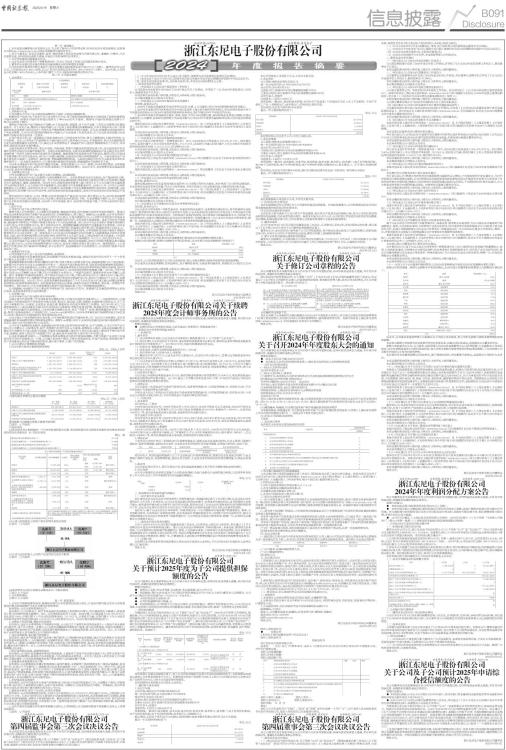 公司代码:603595 公司简称:东尼电子 浙江东尼电子股份有限公司 第一节 重要提示 1、本年度报告摘要来自年度报告全文,为全面了解本公司的经营成果、财务状况及未来发展规划,投资者应当到http://www.sse.com.cn网站仔细阅读年度报告全文。 2、本公司董事会、监事会及董事、监事、高级管理人员保证年度报告内容的真实性、准确性、完整性,不存在虚假记载、误导性陈述或重大遗漏,并承担个别和连带的法律责任。 3、公司全体董事出席董事会会议。 4、公证天业会计师事务所(特殊普通合伙)为本公司出具了标准无保留意见的审计报告。 5、董事会决议通过的本报告期利润分配预案或公积金转增股本预案 公司2024年年度利润分配方案如下:拟向全体股东每股派发现金红利0.015元(含税)。截至2024年12月31日,公司总股本232,442,326股,以此计算合计拟派发现金红利3,486,634.89元(含税)。2024年度,公司现金分红总额3,486,634.89元,占本年度归属于上市公司股东净利润的比例30.27%。 第二节 公司基本情况 1、公司简介 ■ ■ 2、报告期公司主要业务简介 1、消费电子行业 公司消费电子行业产品主要包括超微细电子线材、无线充电隔磁材料。 根据信息产业部《电子信息产品分类注释》的分类,电子线材按线径规格划分为普通电子线材和微细电子线材两类。普通电子线材是指线径规格大于Φ0.6mm的电子线材,微细电子线材是指线径规格小于Φ0.6mm的电子线材。 微细电子线材生产属于精益生产范畴,由于其线径细、漆膜薄,对于生产设备、工艺及公司管理均有着较高要求。自上世纪以来,微细电子线材的核心生产技术主要由德国益利素勒精线、日本大黑线材和日本三铃等国际知名企业掌握,国内企业在工艺技术及产能规模等方面均存在较大差距。近年来,伴随着全球范围内的生产和技术转移,以公司为代表的国内微细电子线材生产企业取得了长足的进步,在产品品质及供应能力方面能够与国际知名企业形成一定竞争。 公司自成立之初,就一直紧跟电子线材发展方向,以市场需求为导向,致力于超微细电子线材的研发、生产及销售。目前,公司所生产的超微细电子线材线径已可以低至Φ0.016mm,在传输效率、抗冲击和耐腐蚀等方面的品质都有着较大的优势,可以满足近年来消费类电子、新能源汽车以及医疗器械领域对于小型化、传导效率、稳定性等诸多方面的要求。 无线充电是未来智能手机、笔记本电脑、平板电脑、智能可穿戴设备的重要发展方向,而无线充电材料及器件是制造无线充电设备的基础材料。无线充电场景的形成,无线充电标准的逐渐融合以及无线充电技术的成熟将进一步提升无线充电材料及器件的市场规模。随着智能手机更新换代的不断加快,截至目前已有超过百余款智能手机支持无线充电,该行业产业链日趋成熟,无线充电功能应用范围逐渐扩大。目前无线充电产业链主要包括方案设计、电源芯片、磁性材料、传输线圈和模组制造。无线充电磁性材料作为无线充电技术的关键零部件之一,在无线充电系统中,可以提高感应磁场和充电效率,屏蔽线圈对其他部件的干扰。 2024年全球智能手机市场呈现回暖复苏迹象。据国际数据公司(IDC)数据,2024年第四季度,全球智能手机出货量同比增长2.4%,达到3.317亿部,连续第六个季度保持增长。2024年全年,全球智能手机出货量达到12.4亿部,较去年同期增长6.4%。 2、太阳能光伏行业 公司太阳能光伏行业产品主要为金刚石切割线、太阳能胶膜。 2024年,我国光伏行业在高速增长与深度调整中并行。全年新增装机再创历史新高,但产能结构性过剩、消纳瓶颈及价格剧烈波动等挑战凸显。针对当前光伏发展的趋势,国家和地方政府也不断出台新政策以保障光伏行业的绿色、健康、成熟发展。2024年10月,国家发展改革委等六部门发布《关于大力实施可再生能源替代行动的指导意见》,大力实施可再生能源替代,深化建筑可再生能源集成应用。2024年11月,《中华人民共和国能源法》正式通过,并将在2025年1月1日起施行,该法明确了可再生能源发展的目标和责任,推进风能、太阳能开发利用,坚持集中式与分布式并举,加快风电和光伏发电基地建设,支持分布式风电和光伏发电就近开发利用。 据中国光伏行业协会(CPIA)数据,2024年我国硅片产量达成735GW,同比增长12.7%;2024年我国新增光伏装机277.57GW,同比增长28.3%,但近两年来首次出现月度同比下降。行业规模虽不断扩大,但产业链主要产品价格呈现先降后平的趋势,2024年上半年多晶硅、硅片、电池等价格快速下降,下半年以来价格在低位区间企稳。 3、医疗行业 公司医疗行业产品主要为医疗线束。 随着全球人口自然增长、人口老龄化程度提高、健康意识增强,医疗健康行业的需求将持续提升。欧美日等发达国家和地区的医疗器械产业发展时间早,市场规模庞大,增长稳定。根据Statista数据,2023年全球医疗器械市场规模为5662亿美元,预计2029年达到7725亿美元,年复合增速为5.3%。以中国为代表的新兴市场是全球最具潜力的医疗器械市场,产品普及需求与升级换代需求并存,近年来增长速度较快。受益于经济水平的发展,健康需求不断增加,中国医疗器械市场迎来了巨大的发展机遇。预计2029年亚太市场医疗器械市场规模达1742亿美元,年复合增速为6.5%,高于全球平均水平。疫情期间暴露出我国医疗设备配备