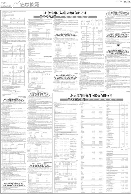 证券代码:002413 证券简称:雷科防务 公告编号:2025-005 北京雷科防务科技股份有限公司 一、重要提示 本年度报告摘要来自年度报告全文,为全面了解本公司的经营成果、财务状况及未来发展规划,投资者应当到证监会指定媒体仔细阅读年度报告全文。 所有董事均已出席了审议本报告的董事会会议。 非标准审计意见提示 □适用 √不适用 董事会审议的报告期利润分配预案或公积金转增股本预案 □适用 √不适用 公司计划不派发现金红利,不送红股,不以公积金转增股本。 董事会决议通过的本报告期优先股利润分配预案 □适用 □不适用 二、公司基本情况 1、公司简介 ■ 2、报告期主要业务或产品简介 报告期内,公司的主要业务包括雷达系统业务群、卫星应用业务群、智能控制业务群、安全存储业务群、智能网联业务群的相关产品研发、制造和销售。 1、雷达系统业务群 雷达系统业务通过多年积累已经形成了覆盖从系统设计、天线、射频、信息采集、信息处理、模拟仿真测试等方面的完整产业链能力,具有丰富的工程经验。自主掌握新体制雷达算法、毫米波雷达检测建模技术、全频段有源无源天饲馈、全频段高集成度低成本TR组件、国产化异构并行处理等关键核心技术。具备毫米波雷达、相控阵雷达、合成孔径雷达系统研发设计和生产能力,面向国防、交通、民航、矿山、气象、汽车等行业市场都拥有领先的相关技术和产品。 2、卫星应用业务群 卫星应用业务经过多年持续深耕,已构建起自主研发的天地一体化技术体系,形成涵盖遥感数据"星-地-应用"全产业链的解决方案服务能力。在星载端,公司突破星上智能处理核心技术,通过自主研发的星载高性能计算平台及智能处理算法,实现遥感数据在轨实时处理与智能分析,显著提升遥感信息获取效率及数据质量。在地面端,自主研发产品集成射频综合处理、多源数据融合、智能运维管理等核心技术,提供包括天线伺服系统、射频系统、数据处理系统以及运维管理软件在内的一系列产品和服务。基于天地协同的技术优势,公司已形成天地一体化服务能力,产品与服务深度应用于国防安全、应急管理、自然资源、智慧城市、气象海洋等十余个国民经济重点领域,为国家空间基础设施建设提供有力支撑。 3、智能控制业务群 智能控制业务专注于智能化、信息化设备领域发展。面向多军种、多域作战、各种异构平台组网管理、分布执行、联合控制、集中指挥的现代战场,依托于国产化计算机、图像处理与显示、组合导航和伺服控制等技术经验,推出了多种面向空、天、地协同一体化的智能控制系统和组件产品。 4、安全存储业务群 公司作为国内安全存储先行者,凭借十余年技术积淀,构建全产业链自主技术体系:自研存储控制芯片及固件算法,掌握存储介质全生命周期管理方案,集成端到端加密机制与高速存储架构。公司打造了全国产高可靠固态模组、军工级嵌入式存储芯片及高性能存储板卡三大产品矩阵,技术达到行业标杆。应用于政务云、国防军工、电力、智慧交通及工业自动化等领域,年服务超百家机构,提供国标级存储服务。通过持续技术迭代与场景创新,加速推进国产存储生态建设,为数字中国战略筑牢数据基座。 5、智能网联业务群 智能网联业务近些年拓展了智能网联仿真测试业务,公司在智能网联仿真测试领域自主研发了系列化车载毫米波雷达目标模拟器,并不断迭代升级完善,还推出了毫米波雷达仿真自动化测试系统、毫米波雷达产线自动化测试系统、整车ADAS在环仿真解决方案等智能网联相关仿真测试解决方案,目前该业务领域为国内主流汽车主机厂、毫米波雷达研发厂商、计量检测机构提供产品和解决方案服务。同时还响应国家发展战略,面向5G-Advanced/6G通感一体化基站测试需求,积极布局无线感知测试仪业务。 3、主要会计数据和财务指标 (1) 近三年主要会计数据和财务指标 公司是否需追溯调整或重述以前年度会计数据 □是 √否 单位:元 ■ (2) 分季度主要会计数据 单位:元 ■ 上述财务指标或其加总数是否与公司已披露季度报告、半年度报告相关财务指标存在重大差异 □是 √否 4、股本及股东情况 (1) 普通股股东和表决权恢复的优先股股东数量及前10名股东持股情况表 单位:股 ■ 持股5%以上股东、前10名股东及前10名无限售流通股股东参与转融通业务出借股份情况 □适用 √不适用 前10名股东及前10名无限售流通股股东因转融通出借/归还原因导致较上期发生变化 □适用 √不适用 (2) 公司优先股股东总数及前10名优先股股东持股情况表 □适用 √不适用 公司报告期无优先股股东持股情况。 (3) 以方框图形式披露公司与实际控制人之间的产权及控制关系 ■ 5、在年度报告批准报出日存续的债券情况 □适用 √不适用 三、重要事项 无。 北京雷科防务科技股份有限公司董事会 2025年4月18日 证券代码:002413 证券简称:雷科防务 公告编号:2025-003 债券代码:124012 债券简称:雷科定02 北京雷科防务科技股份有限公司 第八届董事会第二次会议决议公告 本公司及董事会全体成员保证本公告内容的真实、准确和完整,没有虚假记载、误导性陈述或重大遗漏。 北京雷科防务科技股份有限公司(以下简称“公司”)第八届董事会第二次会议(以下简称“会议”)于2025年4月8日以电话、即时