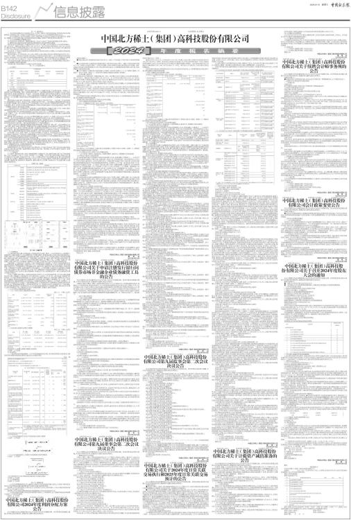 公司代码:600111 公司简称:北方稀土 第一节 重要提示 一、本年度报告摘要来自年度报告全文,为全面了解本公司的经营成果、财务状况及未来发展规划,投资者应当到上海证券交易所网站www.sse.com.cn仔细阅读年度报告全文。 二、本公司董事会、监事会及董事、监事、高级管理人员保证年度报告内容的真实性、准确性、完整性,不存在虚假记载、误导性陈述或重大遗漏,并承担个别和连带的法律责任。 三、公司全体董事出席董事会会议。 四、利安达会计师事务所(特殊普通合伙)为本公司出具了标准无保留意见的审计报告。 五、董事会决议通过的本报告期利润分配预案或公积金转增股本预案 经利安达会计师事务所(特殊普通合伙)审计,北方稀土2024年度母公司实现净利润865,225,278.06元,提取法定盈余公积86,522,527.81元,加上年初未分配利润14,952,187,400.95元,减2023年度已分配现金股利253,054,608.94元,截至报告期末,母公司实际可供分配利润15,477,835,542.26元,资本公积金11,459,705.56元。 2024年度,公司拟以实施权益分派股权登记日登记的总股本为基数,向全体股东每股派发现金红利0.035元(含税)。 截至报告期末,公司总股本3,615,065,842股,以此计算公司拟合计派发现金红利126,527,304.47元(含税),本年度公司现金分红总额占公司本年度实现归属于上市公司股东的净利润的12.60%;报告期内,公司无中期分红及股份回购注销情形。本次利润分配后母公司剩余未分配利润15,351,308,237.79元转入下一年度。本年度公司不送红股,不进行资本公积金转增股本。 如在实施本次权益分派的股权登记日前公司总股本发生变动,公司拟维持每股分配比例不变,相应调整拟分配的利润总额。 本利润分配方案尚需提交公司股东大会审议批准。 第二节 公司基本情况 一、公司简介 ■ ■ 二、报告期公司主要业务简介 稀土行业整体运行情况。报告期,随着国内稀土产业整合加速,行业集中度进一步提高,产业韧性与活力得到增强。稀土上游供应稳步增长,下游消费需求释放虽不及预期,但主流产品价格波动收窄,供需关系得到进一步改善。在需求端,新能源、高科技等领域对稀土产品需求持续增长,为产业发展提供强大动力。同时,国家持续加大政策支持力度,着力推动新型工业化、培育新质生产力,支持稀土新材料及应用等战略性新兴产业发展,我国稀土产业健康可持续发展前景广阔。 国务院发布实施《稀土管理条例》,对稀土资源实行保护性开采。一是完善了生态环境保护、资源储备的有关规定,更有利于稀土资源的保护性开发;二是明确提出国家鼓励科技创新和人才培养,支持稀土新产品新材料新工艺的研发和产业化,更有利于资源的高质化利用;三是建立起国家、地方、企业的分层负责的治理体系,并首次对违法违规行为设定处罚标准,有利于进一步整顿行业秩序,推动规范化管理。 工业和信息化部、自然资源部下达两批稀土总量控制指标,明确全年稀土开采、冶炼分离总量控制指标分别为27万吨、25.4万吨,增速同比放缓,中重稀土指标维持稳定。 国家发改委公布《西部地区鼓励类产业目录(2025年本)》,新增稀土领域涉及四川、云南、甘肃、内蒙古、广西。该目录旨在促进西部稀土资源高效利用与技术升级,推动稀土功能材料高端化、多元化发展。 商务部、海关总署发布《出口许可证管理货物目录(2024年)》,将稀土列入出口许可证管理范围。通过全链条追溯体系对接国际标准,增强海外市场信任度,减少贸易摩擦风险。 工业和信息化部、国家发展改革委、财政部等七部门联合印发《关于加快推动制造业绿色化发展的指导意见》,明确在新材料领域开展共伴生矿与尾矿集约化利用、工业固废规模化利用等技术研发和应用,提升稀土、稀有金属等战略性矿产资源保障能力。 内蒙古自治区作为国家重要能源和战略资源基地,持续打好“稀土牌”,重点围绕包头市“两个稀土基地”建设,聚焦稀土资源高效开发,延链补链强链,建设永磁电机产业园,吸引全国稀土企业落户包头,促进产业集聚,推进稀土高端材料的成果转化与产业化,不断开辟新质生产力发展空间。赣州通过集群培育提升行动,加强产业链协同,形成特色产业布局。这些措施有效提升了稀土资源利用效率和技术创新,推动稀土应用产业向高端、前沿领域拓展。 由中国稀土学会、包钢(集团)公司联合中国稀土行业协会、中国质量认证中心等行业组织、权威认证机构及上下游企业主导筹建的稀土EPD平台在北京首发。该平台将为我国稀土产业链企业积极融入绿色国际贸易提供可靠路径,实现我国稀土产品环境绩效国际互认,为我国稀土行业绿色低碳发展和绿色转型升级创造价值。 稀土产业链企业紧抓国家政策红利和发展机遇,发挥各自优势,在创新驱动、产业链延伸、绿色低碳等方面不断深化交流合作,促进产业链强链补链延链,提升产业和产能规模,加快产业高端、智能、绿色转型升级步伐,不断增强价值创造能力和市场竞争力,共同以发展新质生产力推动产业链转型升级,以绿色低碳发展引领产业高质量发展。 行业其他情况详见本报告其他内容。 根据国民经济行业分类和证监会行业分类结果,公司属于制造业门类下的有色金属冶炼及压延加工业大类,属于稀土金属冶炼及压延加工业小类。报告期,公司所从事的主要业务、经营模式未发生重大变