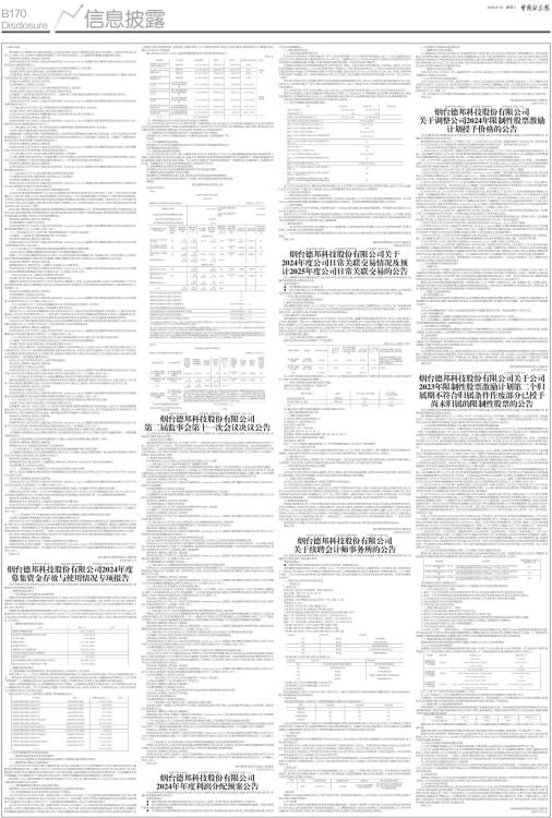 报告期内,公司董事会审计委员会根据《公司章程》等有关规定,对董事会负责,审议了财务报告、关联交易等议案,指导了公司审计工作,恪尽职守、勤勉尽责地履行了审计委员会的职责。公司董事会同意通过该履职情况报告。 表决结果:9票赞成,0票反对,0票弃权。 具体内容详见公司于同日在上海证券交易所网站(www.sse.com.cn)披露的《烟台德邦科技股份有限公司2024年度审计委员会履职情况报告》。 (五)审议通过《关于〈2024年财务决算和2025年度财务预算报告〉的议案》 本议案已经审计委员会审议通过,并同意提交董事会审议。 公司财务部门根据公司2024年度经营的财务情况,编写并向公司董事会提交了2024年财务决算报告,根据公司2025年度的经营计划,起草并向公司董事会提交了2025年度财务预算报告。 表决结果:9票赞成,0票反对,0票弃权。 本议案需提交公司股东大会审议。 (六)审议通过《关于公司〈2024年度内部控制评价报告〉的议案》 本议案已经审计委员会审议通过,并同意提交董事会审议。 公司编制了《2024年度内部控制评价报告》。永拓出具了《烟台德邦科技股份有限公司内部控制审计报告》。 表决结果:9票赞成,0票反对,0票弃权。 具体内容详见公司于同日在上海证券交易所网站(www.sse.com.cn)披露的《烟台德邦科技股份有限公司2024年度内部控制评价报告》。 (七)审议通过《关于审议〈会计师事务所2024年度履职情况评估报告〉的议案》 本议案已经审计委员会审议通过,并同意提交董事会审议。 公司对2024年会计师事务所的履职情况进行了相应的评估并出具了评估报告。 表决结果:9票赞成,0票反对,0票弃权。 具体内容详见公司于同日在上海证券交易所网站(www.sse.com.cn)披露的《烟台德邦科技股份有限公司关于会计师事务所2024年度履职情况评估报告》。 (八)审议通过《关于审议〈审计委员会对会计师事务所履行监督职责情况报告〉的议案》 本议案已经公司董事会审计委员会审议通过。 根据财政部、国务院国有资产监督管理委员会、中国证券监督管理委员会颁布的《国有企业、上市公司选聘会计师事务所管理办法》,公司董事会审计委员会切实对永拓在2024年度的审计工作情况履行了监督职责。并编制了《董事会审计委员会对会计师事务所履行监督职责情况报告》。 表决结果:9票赞成,0票反对,0票弃权。 具体内容详见公司于同日在上海证券交易所网站(www.sse.com.cn)披露的《烟台德邦科技股份有限公司关于董事会审计委员会对会计师事务所履行监督职责情况的报告》。 (九)审议通过《关于〈2024年度独立董事述职报告〉的议案》 公司独立董事分别从基本情况、年度履职概况、重点关注事项、总体评价和建议等方面对2024年度履职情况做了说明,以各自名义单独编制了《2024年度独立董事述职报告》。公司董事会同意通过该述职报告。 表决结果:9票赞成,0票反对,0票弃权。 具体内容详见公司于同日在上海证券交易所网站(www.sse.com.cn)披露的《烟台德邦科技股份有限公司2024年度独立董事述职报告》。 (十)审议通过《关于公司独立董事独立性情况评估的议案》 公司董事会对所有独立董事的独立性情况出具了专项意见。 表决结果:9票赞成,0票反对,0票弃权。 具体内容详见公司于同日在上海证券交易所网站(www.sse.com.cn)披露的《烟台德邦科技股份有限公司董事会对在任独立董事独立性情况评估的专项意见》。 (十一)审议通过《关于2024年度利润分配预案的议案》 公司2024年度利润分配预案如下:公司拟向全体股东每10股派发现金红利人民币2.50元(含税),不进行资本公积转增股本,不送红股。根据《上市公司股份回购规则》等有关规定,上市公司回购专用账户中的股份,不享有利润分配的权利。公司拟以实施权益分派股权登记日登记的总股本扣减公司回购专用证券账户中股份为基数。截至3月31日,公司总股本为14,224.00万股,以此为基数,扣除回购专用证券账户中股数1,327,158股后的股本140,912,842股,拟派发现金红利总额人民币35,228,210.50元(含税)。 如在分配方案披露之日起至实施权益分派股权登记日期间因新增股份上市、股份回购等事项导致公司总股本发生变化的,则以未来实施分配方案的股权登记日的总股本扣减回购专用证券账户中股份为基数,按照每股分配比例不变的原则对分配总额进行调整,并将另行公告具体调整情况。 表决结果:9票赞成,0票反对,0票弃权。 本议案需提交公司股东大会审议。 具体内容详见公司于同日在上海证券交易所网站(www.sse.com.cn)披露的《烟台德邦科技股份有限公司2024年年度利润分配预案公告》(公告编号:2025-015)。 (十二)审议通过《关于〈2025年度“提质增效重回报"行动方案〉的议案》 公司编制了《2025年度“提质增效重回报”行动方案》。 表决结果:9票赞成,0票反对,0票弃权。 具体内容详见公司于同日在上海证券交易所网站(www.sse.com.cn)披露的《烟台德邦科技股份有限公司2025年度“提质增效重回报”行动方案》。 (十三)审议通过《关于调整2024年限制性股票激励计划授予价格的议案》 本议案已经公司董事会薪酬委员会审议通过,并同意提交董事会审议。 根据《上市公司股权激励管理办法》以及公司《2024年限制性股票激励计划(草案修订稿)》的相关规定,公司拟对2024年限制性股票激励计划首次授予价格进