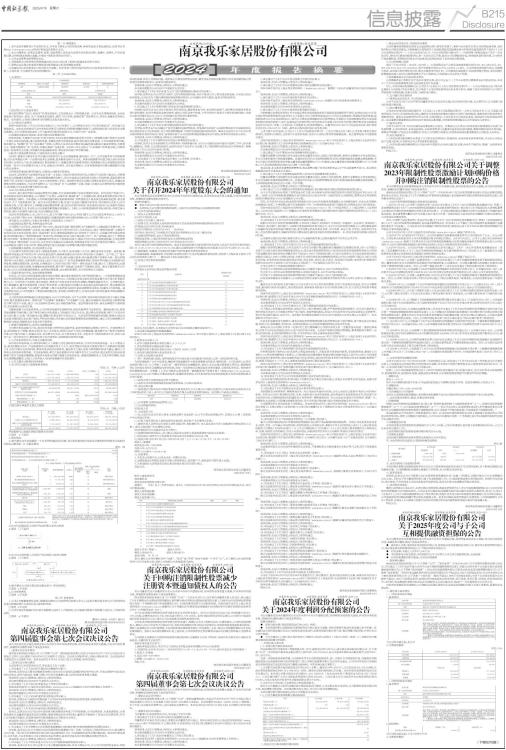 公司代码:603326 公司简称:我乐家居 南京我乐家居股份有限公司 第一节 重要提示 1、本年度报告摘要来自年度报告全文,为全面了解本公司的经营成果、财务状况及未来发展规划,投资者应当到http://www.sse.com.cn网站仔细阅读年度报告全文。 2、本公司董事会、监事会及董事、监事、高级管理人员保证年度报告内容的真实性、准确性、完整性,不存在虚假记载、误导性陈述或重大遗漏,并承担个别和连带的法律责任。 3、公司全体董事出席董事会会议。 4、天职国际会计师事务所(特殊普通合伙)为本公司出具了标准无保留意见的审计报告。 5、董事会决议通过的本报告期利润分配预案或公积金转增股本预案 以实施权益分派股权登记日的总股本为基数,向全体参与利润分配的股东每10股派发现金红利3.00元(含税),不送红股、不实施资本公积金转增股本。 第二节 公司基本情况 1、公司简介 ■ ■ 2、报告期公司主要业务简介 我乐家居秉持“设计让家更美”的理念和使命,主打原创设计、寻求极致美家。公司专注从事整体厨柜、全屋定制家具产品的设计、研发、生产、销售及相关服务,坚持“设计至美,高端定制”的品牌定位,持续打造整家定制核心能力。报告期内,公司的主要业务与经营模式未发生重大变化。 2.1公司所处行业情况 根据中国证监会《上市公司行业分类指引》(2012年修订),公司所处行业为“C21家具制造业”,细分属于定制类家具。2024年定制家居行业在宏观经济承压与消费需求结构性调整的背景下,虽然政策红利与存量需求支撑长期增长,但行业整体面临成本上行与盈利空间收窄的双重压力,市场分化进一步加剧。 (1)政策驱动叠加存量焕新,家居消费向品质智能升级 国家发改委、住建部于2024年3月联合印发《2024年新型城镇化建设重点任务》,明确提出城市更新行动将进一步深化存量空间改造,通过系统性改造、功能优化和可持续发展,解决老旧城区功能衰退、人居环境落后等问题,推动城市从“规模扩张”向“品质提升”转型,与老旧小区改造及消费升级适配的家居解决方案需求增加,消费重心从“基础功能满足”向“品质化、智能化焕新”加速迁移。2024年,中央及地方“以旧换新”政策通过线上消费券及线下抵扣等方式实施,有效激活存量房翻新需求,带动家居消费订单显著回暖。 (2)技术升级叠加数字转型,行业格局向头部企业集中 2024年,智能化与数字化技术加速向定制家居行业全价值链渗透,驱动设计、生产、交付及服务环节的效能革新,行业竞争维度从单一产品转向技术生态构建,技术壁垒加剧行业分化。具备全链路数字化能力的头部企业依托自研算法与柔性化产线,形成智能设计驱动精准生产、数据反馈优化服务的闭环,构建数据+算法双轮驱动的竞争护城河。而中小企业因数字化投入不足,面临设计同质化、交付延迟等痛点,市场份额持续向具备全链路数字化能力的企业集中。 (3)终端竞争叠加价格博弈激化,市场重心向服务价值转型 2024年,定制家居行业终端市场竞争进一步加剧,门店间价格战持续升级,同质化产品促销力度加大,消费者对性价比的敏感度显著提升。在需求增速放缓的背景下,部分企业通过压缩利润空间抢占市场份额,基础套餐价格持续下探,引流型产品成为终端门店争夺客流的核心手段。单纯的价格竞争导致行业整体盈利空间承压,倒逼企业探索差异化突围路径,行业竞争逻辑正从“以价换量”向“以质提效”过渡,终端门店逐步从价格博弈转向服务能力、技术能力与生态协同能力的综合比拼。 2.2公司从事的业务情况 2024年,我乐家居坚持中高端品牌差异化战略,在行业深度调整中实现经营韧性发展。面对房地产市场下行、需求收缩及竞争加剧的挑战,公司围绕“产品领先、品牌升级、渠道扩张”三大战略主轴,推进业务结构动态升级与全价值链能力建设。在机遇端,公司积极把握存量房更新需求释放、消费智能化升级及绿色低碳转型趋势,通过整合设计、生产与服务体系打造一站式全屋定制解决方案,加速产品创新与整装生态协同,巩固差异化竞争力;在应对挑战方面,公司以数字化工具赋能全流程精益管理,通过优化区域市场布局、强化高毛利品类占比及提升终端运营人效挖掘增量空间,并依托分层化渠道策略增强抗风险能力。同时,公司始终重视投资者权益回报,持续完善分红机制,提升分红频次与稳定性,切实回馈股东支持。 2024年实现营业收入143,246.79万元,较上年同期下降16.29%;实现归属于上市公司股东净利润12,146.61万元,较上年同期下降22.50%(剔除股权激励计划摊销费用对净利润的影响后,较上年同期下降14.51%)。 报告期内,公司各项工作稳步有序推进,完成的重点工作如下: (1)创新驱动品牌升级,多维构建竞争优势 公司围绕“设计至美,高端定制”核心定位,通过技术创新、精准营销与产业链协同三大维度提升品牌价值。在产品端,以智能科技赋能产品创新,推出融合前沿技术与美学设计的八大系列新品,通过“解构高级感”主题发布会直观呈现未来家居场景,强化“高端定制”标签;围绕家庭场景打造《家的样子》贺岁片,以情感共鸣传递品牌温度,联动明星IP推出“复刻明星新家”系列内容,精准触达娱乐与设计圈层核心用户。在产业链端,通过工厂溯源直播、设计师探厂等透明化形式,全链路展现研发设计与智能制