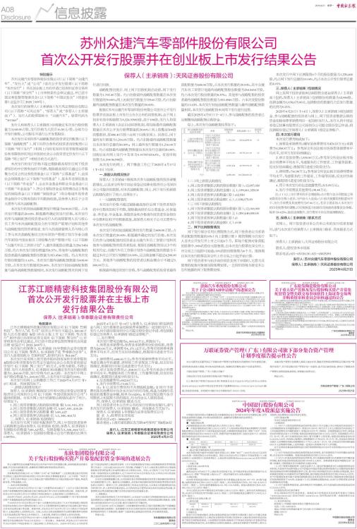 特别提示 苏州众捷汽车零部件股份有限公司(以下简称“众捷汽车”、“发行人”或“公司”)首次公开发行股票(以下简称“本次发行”)并在创业板上市的申请已经深圳证券交易所(以下简称“深交所”)上市审核委员会审议通过,并已获中国证券监督管理委员会(以下简称“中国证监会”)同意注册(证监许可〔2025〕309号)。 本次发行的保荐人(主承销商)为天风证券股份有限公司(以下简称“天风证券”、“保荐人”或“保荐人(主承销商)”)。发行人的股票简称为“众捷汽车”,股票代码为“301560”。 发行人和保荐人(主承销商)协商确定本次发行股份数量为3,040.00万股,发行价格为人民币16.50元/股,全部为公开发行新股,公司股东不进行公开发售股份。 本次发行采用向参与战略配售的投资者定向配售(以下简称“战略配售”)、网下向符合条件的投资者询价配售(以下简称“网下发行”)和网上向持有深圳市场非限售A股股份和非限售存托凭证市值的社会公众投资者定价发行(以下简称“网上发行”)相结合的方式进行。 本次发行的发行价格不超过剔除最高报价后网下投资者报价的中位数和加权平均数,剔除最高报价后通过公开募集方式设立的证券投资基金(以下简称“公募基金”)、全国社会保障基金(以下简称“社保基金”)、基本养老保险基金(以下简称“养老金”)、企业年金基金和职业年金基金(以下简称“年金基金”)、符合《保险资金运用管理办法》等规定的保险资金(以下简称“保险资金”)和合格境外投资者资金报价中位数和加权平均数孰低值,故保荐人相关子公司无需参与本次战略配售。 本次发行的初始战略配售发行数量为608.00万股,占本次发行数量的20.00%。根据最终确定的发行价格,本次发行的参与战略配售的投资者由发行人的高级管理人员与核心员工参与本次战略配售设立的专项资产管理计划和其他参与战略配售的投资者组成。发行人的高级管理人员与核心员工参与本次战略配售设立的专项资产管理计划为华泰众捷汽车家园1号创业板员工持股集合资产管理计划(以下简称“众捷汽车员工资管计划”),最终获配股份数量为254.5454万股,约占本次发行股份数量的8.37%。其他参与战略配售的投资者最终战略配售股份数量为353.4546万股,约占本次发行股份数量的11.63%。本次发行最终战略配售数量为608.00万股,占本次发行数量的20.00%。本次发行初始战略配售数量与最终战略配售数量相同,本次发行战略配售未向网下发行进行回拨。 战略配售回拨后、网上网下回拨机制启动前,网下发行数量为1,702.40万股,约占扣除最终战略配售数量后本次发行数量的70.00%;网上初始发行数量为729.60万股,约占扣除最终战略配售数量后本次发行数量的30.00%。 根据《苏州众捷汽车零部件股份有限公司首次公开发行股票并在创业板上市发行公告》公布的回拨机制,由于网上初步有效申购倍数为9,324.93983倍,高于100倍,发行人和保荐人(主承销商)决定启动回拨机制,将扣除最终战略配售数量后本次公开发行股票数量的20.00%(向上取整至500股的整数倍,即486.40万股)由网下回拨至网上。回拨后,网下最终发行数量为1,216.00万股,约占扣除最终战略配售数量后本次发行总量的50.00%;网上最终发行数量为1,216.00万股,约占扣除最终战略配售数量后本次发行总量的50.00%。回拨后本次网上发行中签率为0.0178732163%,有效申购倍数为5,594.96390倍。 本次发行的网上、网下缴款工作已于2025年4月17日(T+2日)结束。 一、新股认购情况统计 保荐人(主承销商)根据本次参与战略配售的投资者缴款情况,以及深交所和中国证券登记结算有限责任公司深圳分公司提供的数据,对本次战略配售、网上、网下发行的新股认购情况进行了统计,结果如下: (一)战略配售情况 本次发行价格不超过剔除最高报价后网下投资者报价的中位数和加权平均数,剔除最高报价后公募基金、社保基金、养老金、年金基金、保险资金和合格境外投资者资金报价中位数和加权平均数孰低值,故保荐人相关子公司无需参与本次发行的战略配售。 本次发行的初始战略配售的发行数量为608.00万股,占本次发行数量的20.00%。根据最终确定的发行价格,本次发行的参与战略配售的投资者由众捷汽车员工资管计划和其他参与战略配售的投资者组成。根据《战略配售协议》中的相关约定,众捷汽车员工资管计划参与战略配售的数量为不超过本次公开发行规模的10.00%,且认购金额不超过4,200.00万元。其他参与战略配售的投资者认购金额合计不超过9,800.00万元。 根据最终确定的发行价格,参与战略配售的投资者最终获配数量为608.00万股,占本次发行数量的20.00%,其中众捷汽车员工资管计划最终战略配售股份数量为254.5454万股,约占本次发行股份数量的8.37%;其他参与战略配售的投资者最终战略配售股份数量为353.4546万股,占本次发股份数量的11.63%。本次发行初始战略配售数量与最终战略配售数量相同,本次发行战略配售未向网下发行进行回拨。 截至2025年4月9日(T-4日),参与战略配售的投资者已足额缴纳战略配售认购资金。 综上,本次发行战略配售结果如下: ■ (二)网上新股认购情况 1、网上投资者缴款认购的股份数量(股):12,097,050 2、网上投资者缴款认购的金额(元):199,601,325.00 3、网上投资者放弃认购数量(股):62,950 4、网上投资者放弃认购金额(元):1,038,675.