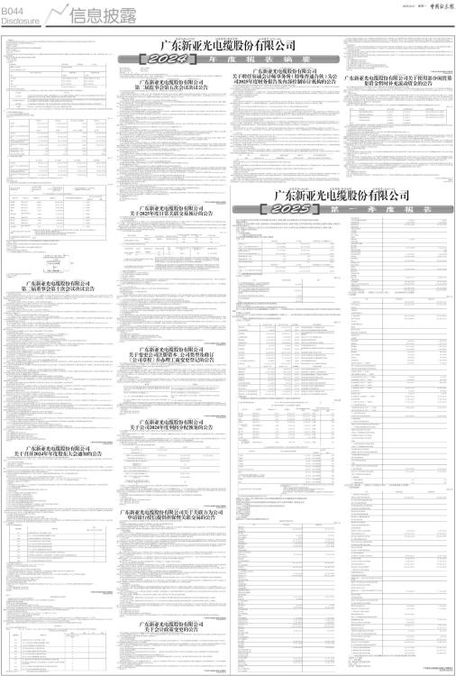 证券代码:001382 证券简称:新亚电缆 公告编号:2025-007 广东新亚光电缆股份有限公司 本公司及董事会全体成员保证信息披露的内容真实、准确、完整,没有虚假记载、误导性陈述或重大遗漏。 重要内容提示: 1.董事会、监事会及董事、监事、高级管理人员保证季度报告的真实、准确、完整,不存在虚假记载、误导性陈述或重大遗漏,并承担个别和连带的法律责任。 2.公司负责人、主管会计工作负责人及会计机构负责人(会计主管人员)声明:保证季度报告中财务信息的真实、准确、完整。 3.第一季度报告是否经审计 □是 √否 一、主要财务数据 (一) 主要会计数据和财务指标 公司是否需追溯调整或重述以前年度会计数据 □是 √否 ■ (二) 非经常性损益项目和金额 √适用 □不适用 单位:元 ■ 其他符合非经常性损益定义的损益项目的具体情况 □适用 √不适用 公司不存在其他符合非经常性损益定义的损益项目的具体情况。 将《公开发行证券的公司信息披露解释性公告第1号一一非经常性损益》中列举的非经常性损益项目界定为经常性损益项目的情况说明 □适用 √不适用 公司不存在将《公开发行证券的公司信息披露解释性公告第1号一一非经常性损益》中列举的非经常性损益项目界定为经常性损益的项目的情形。 (三) 主要会计数据和财务指标发生变动的情况及原因 √适用 □不适用 单位:元 ■ 二、股东信息 (一)普通股股东总数和表决权恢复的优先股股东数量及前十名股东持股情况表 单位:股 ■ 持股5%以上股东、前10名股东及前10名无限售流通股股东参与转融通业务出借股份情况 □适用 √不适用 前10名股东及前10名无限售流通股股东因转融通出借/归还原因导致较上期发生变化 □适用 √不适用 (二) 公司优先股股东总数及前10名优先股股东持股情况表 □适用 √不适用 三、其他重要事项 □适用 √不适用 四、季度财务报表 (一) 财务报表 1、资产负债表 编制单位:广东新亚光电缆股份有限公司 2025年03月31日 单位:元 ■ ■ 法定代表人:陈志辉 主管会计工作负责人:胡元 会计机构负责人:阮雪娇 2、利润表 单位:元 ■ 法定代表人:陈志辉 主管会计工作负责人:胡元 会计机构负责人:阮雪娇 3、现金流量表 单位:元 ■ (二) 2025年起首次执行新会计准则调整首次执行当年年初财务报表相关项目情况 □适用 √不适用 (三) 审计报告 第一季度报告是否经过审计 □是 √否 公司第一季度报告未经审计。 广东新亚光电缆股份有限公司董事会 2025年4月21日