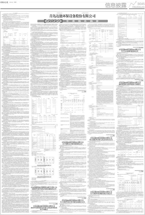 第一节 重要提示 1、本年度报告摘要来自年度报告全文,为全面了解本公司的经营成果、财务状况及未来发展规划,投资者应当到www.sse.com.cn网站仔细阅读年度报告全文。 2、重大风险提示 报告期内,不存在对公司生产经营产生实质性影响的特别重大风险。公司已在本报告中详细阐述公司在经营过程中可能面临的各种风险,敬请查阅本报告“第三节 管理层讨论与分析”之“四、风险因素”所述内容,请投资者予以关注。 3、本公司董事会、监事会及董事、监事、高级管理人员保证年度报告内容的真实性、准确性、完整性,不存在虚假记载、误导性陈述或重大遗漏,并承担个别和连带的法律责任。 4、公司全体董事出席董事会会议。 5、容诚会计师事务所(特殊普通合伙)为本公司出具了标准无保留意见的审计报告。 6、公司上市时未盈利且尚未实现盈利 □是 √否 7、董事会决议通过的本报告期利润分配预案或公积金转增股本预案 公司于2025年4月18日召开第五届董事会第九次会议,审议通过了《关于公司2024年度利润分配预案的议案》。经容诚会计师事务所(特殊普通合伙)审计,截至2024年12月31日,青岛达能环保设备股份有限公司(以下简称“公司”)2024年度归属上市公司股东的净利润为人民币92,973,236.64元,母公司累计可供分配利润为人民币403,896,348.54元。经公司董事会决议,公司2024年度拟以实施权益分派股权登记日登记的总股本为基数分配利润,拟向全体股东每10股派发现金红利2.40元(含税)。截至2024年12月31日,公司总股本123,071,000股,以此计算合计拟派发现金红利29,537,040.00元(含税),占2024年度合并报表中归属于上市公司股东的净利润比例为31.77%。 在实施权益分派股权登记日期间,因可转债转股/回购股份/股权激励授予股份回购注销/重大资产重组股份回购注销等致使公司总股本发生变动的,公司拟维持现金分红总额不变,相应调整每股现金分红金额,并将另行公告调整情况。 8、是否存在公司治理特殊安排等重要事项 □适用 √不适用 第二节 公司基本情况 1、公司简介 1.1公司股票简况 √适用 □不适用 ■ 1.2公司存托凭证简况 □适用 √不适用 1.3联系人和联系方式 ■ 2、报告期公司主要业务简介 2.1主要业务、主要产品或服务情况 公司始终以服务国家生态环境可持续发展战略为宗旨,深耕于节能环保装备领域,致力于节能减排、环保降碳、清洁能源消纳、新能源等高端装备的研发、设计、制造、销售、运维及服务,为电力、热力、化工、冶金、垃圾处理、新能源等领域的客户提供节能环保处理系统解决方案,公司大力发展新质生产力,为促进经济发展全面绿色转型贡献力量。 以市场为导向,以创新为驱动,助力双碳目标的实现。通过加强技术研发,为客户提供覆盖固、液、气废领域全方位的节能、环保解决方案。目前,公司的技术、产品已覆盖包括炉渣、钢渣、灰尘、烟气、细颗粒物、NOX、SOX、脱硫废水等污染物的防治;锅炉炉渣、钢渣和烟气余热回收;电厂灵活性改造、清洁能源消纳;氢能、太阳能等新能源等领域。 公司主要产品为炉渣节能环保处理系统、烟气节能环保处理系统、全负荷脱硝系统、清洁能源消纳系统、脱硫废水环保处理系统、钢渣节能环保处理系统及零配件。 1、炉渣节能环保处理系统 炉渣也称炉底渣,是固体燃料在锅炉等燃烧设备的炉膛中燃烧后,从炉底排渣口排出的灰渣,是我国主要大宗工业固体废弃物之一。依对高温炉渣处理方式的不同,炉渣节能环保处理系统分为干式炉渣处理系统和湿式炉渣处理系统。 (1)干式炉渣处理系统 干式炉渣处理系统是指依靠炉膛负压或风机,引入适量受控的冷却风对高温炉渣进行冷却的炉底渣处理系统。其主要工作原理是:高温炉渣由炉底连续排出,通过渣井经关断门破碎后在干渣机的输送带上低速运动,在炉膛负压或冷却风机作用下,受控的少量环境空气逆向进入干渣机内部与热渣进行热交换,使热渣在输送带上完成燃烧并冷却,经碎渣机再次细化破碎后进入渣仓中储存和定时卸料。 干式炉渣处理系统采用空气对高温炉渣进行冷却,被炉渣加热后的高温空气可作为助燃空气参与锅炉燃烧,提高锅炉热效率,具有较好的节煤效果,冷却后的炉渣可再次利用于建筑、水泥等各种行业,同时本系统采用空气作为冷源,应用场景广泛,特别是缺水地区;因本系统采用风冷,无需污水处理系统设备,更有利于环境保护。 公司自主研发的鳞斗干渣机系统具有轴心链技术、鳞斗输送带技术、同步清扫技术等众多核心技术,输送带运行平稳、不打滑、不易跑偏,能保证张紧的同步性,实现自清扫功能;在同等规格输送宽度情况下,具有输送能力更大、负载能力更强、寿命更高、维护成本更低等优势。 (2)湿式炉渣处理系统 湿式炉渣处理系统是指依靠冷却水对高温炉渣进行冷却的炉渣环保处理系统。其主要工作原理是:高温炉渣由炉底连续排出,通过渣井和关断门后落到装满冷却水的刮板捞渣机槽体内,并经冷却、粒化后输送至渣仓中储存和定时卸料。 公司自行研发了大渣分离破碎技术,大大降低了水爆的安全隐患;研发的模锻链技术提高了设备的耐磨性等关键参数,进一步提高了设备的使用寿命,减少了系统运行维护工作量;通过预冷却技术回收热能,提高锅炉热效率,并可通过湿渣系统消纳部分高盐废水,湿式炉渣处理
