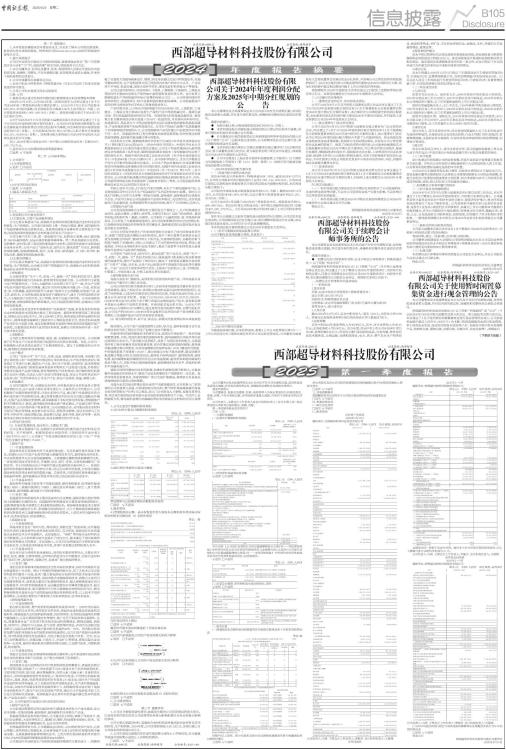 证券代码:688122 证券简称:西部超导 西部超导材料科技股份有限公司 本公司董事会及全体董事保证本公告内容不存在任何虚假记载、误导性陈述或者重大遗漏,并对其内容的真实性、准确性和完整性依法承担法律责任。 重要内容提示 公司董事会、监事会及董事、监事、高级管理人员保证季度报告内容的真实、准确、完整,不存在虚假记载、误导性陈述或重大遗漏,并承担个别和连带的法律责任。 公司负责人、主管会计工作负责人及会计机构负责人(会计主管人员)保证季度报告中财务信息的真实、准确、完整。 第一季度财务报表是否经审计 □是 √否 一、主要财务数据 (一)主要会计数据和财务指标 单位:元 币种:人民币 ■ (二)非经常性损益项目和金额 √适用 □不适用 单位:元 币种:人民币 ■ 对公司将《公开发行证券的公司信息披露解释性公告第1号一一非经常性损益》未列举的项目认定为非经常性损益项目且金额重大的,以及将《公开发行证券的公司信息披露解释性公告第1号一一非经常性损益》中列举的非经常性损益项目界定为经常性损益的项目,应说明原因。 √适用 □不适用 单位:元 币种:人民币 ■ (三)主要会计数据、财务指标发生变动的情况、原因 √适用 □不适用 ■ 二、股东信息 (一)普通股股东总数和表决权恢复的优先股股东数量及前十名股东持股情况表 单位:股 ■ 持股5%以上股东、前10名股东及前10名无限售流通股股东参与转融通业务出借股份情况 □适用 √不适用 前10名股东及前10名无限售流通股股东因转融通出借/归还原因导致较上期发生变化 □适用 √不适用 三、其他提醒事项 需提醒投资者关注的关于公司报告期经营情况的其他重要信息 □适用 √不适用 四、季度财务报表 (一)审计意见类型 □适用 √不适用 (二)财务报表 合并资产负债表 2025年3月31日 编制单位:西部超导材料科技股份有限公司 单位:元 币种:人民币 审计类型:未经审计 ■ 公司负责人:冯勇 主管会计工作负责人:李魁芳 会计机构负责人:王雁翔 合并利润表 2025年1一3月 编制单位:西部超导材料科技股份有限公司 单位:元 币种:人民币 审计类型:未经审计 ■ 本期发生同一控制下企业合并的,被合并方在合并前实现的净利润为:0元,上期被合并方实现的净利润为:0 元。 公司负责人:冯勇 主管会计工作负责人:李魁芳 会计机构负责人:王雁翔 合并现金流量表 2025年1一3月 编制单位:西部超导材料科技股份有限公司 单位:元 币种:人民币 审计类型:未经审计 ■ 公司负责人:冯勇 主管会计工作负责人:李魁芳 会计机构负责人:王雁翔 (三)2025年起首次执行新会计准则或准则解释等涉及调整首次执行当年年初的财务报表 □适用 √不适用 特此公告 西部超导材料科技股份有限公司董事会 2025年4月18日