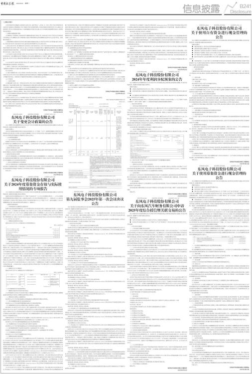 公司在募投项目实施期间,使用银行承兑汇票(或背书转让)、信用证、自 有外汇等方式支付募投项目部分款项并以募集资金等额置换,有利于提高公司资金的使用效率,合理改进募投项目款项支付方式,降低公司财务费用,符合公司和股东的利益,不会影响募投项目的正常实施,也不存在变相改变募集资金投向、损害股东利益的情形。 三、募集资金置换操作流程 公司根据生产经营情况,在募投项目实施期间使用银行承兑汇票、信用证及自有外汇等方式支付募投项目所需资金,再以募集资金进行等额置换,该部分等额置换资金视同募集资金投资项目已经使用资金。具体操作流程如下: 1、根据募集资金投资项目的相关设备及基础设施建设进度,由项目单位在签订合同时确认银行承兑汇票、信用证及自有外汇等具体支付方式,履行相应的审批程序后,签订相关合同。 2、具体办理支付时,结合募投项目实际需求,达到付款条件时,由项目单位根据合同条款发起付款申请流程并填制付款申请单,注明付款方式,按公司《东风电子科技股份有限公司募集资金管理细则》规定的募集资金使用审批程序逐级审核。公司财务部门根据审批后的付款申请单履行银行承兑汇票、信用证及自有外汇等方式的支付,并建立对应台账。 3、公司逐月汇总统计使用银行承兑汇票、信用证及自有外汇等方式支付募投项目所需资金的明细台账,经内部审批后,再以募集资金进行等额置换,将相关款项从募集资金专户划转至一般账户。其中,公司以银行承兑汇票、信用证方式支付募投项目所需资金的,保证金部分在实际支付后进行置换,到期兑付后置换剩余款项。 4、公司应逐月汇总统计使用银行承兑汇票、信用证及自有外汇等方式支付募投项目资金并以募集资金等额置换的相关具体情况,并报保荐人。 5、保荐人、保荐代表人有权采取现场检查、问询等方式定期或不定期对公司的置换情况进行监督,公司与募集资金存储银行应当配合相关检查和问询。 四、审议程序 公司第九届董事会第二次会议和第九届监事会2025年第一次会议审议通过了《关于使用银行承兑汇票、信用证及自有外汇等方式支付募集资金投资项目所需资金并以募集资金等额置换的议案》。公司监事会发表了明确的同意意见。该事项在公司董事会审批权限内,无需提交股东大会审议。 五、专项意见 (一)监事会意见 公司使用银行承兑汇票、信用证及自有外汇等方式支付募集资金投资项目所需资金并以募集资金等额置换,制定了相应的操作流程,有利于提高募集资金的使用效率,降低财务成本,符合公司和全体股东的利益,不会影响公司募投项目的正常进行,不存在变相改变募集资金投向和损害股东利益的情况,符合《上市公司监管指引第2号一一上市公司募集资金管理和使用的监管要求》《上海证券交易所上市公司自律监管指引第1号一一规范运作》等相关法律规定。因此,同意公司在募投项目实施期间使用银行承兑汇票、信用证及自有外汇等方式支付募集资金投资项目所需资金并以募集资金等额置换。 (二)保荐人核查意见 经核查,本保荐人认为:公司使用银行承兑汇票、信用证及自有外汇等方式支付募集资金投资项目所需资金并以募集资金等额置换事项已履行了必要的决策程序,相关议案已经公司董事会和监事会审议通过。该置换事项不影响公司募投项目的正常进行,也不存在变相改变募集资金投向及损害公司及股东利益的情形。 综上,保荐人对公司使用银行承兑汇票、信用证及自有外汇等方式支付募集资金投资项目所需资金并以募集资金等额置换的事项无异议。 特此公告。 东风电子科技股份有限公司董事会 2025年4月22日 证券代码:600081 证券简称:东风科技 公告编号:2025-018 东风电子科技股份有限公司 关于变更会计政策的公告 本公司董事会及全体董事保证本公告内容不存在任何虚假记载、误导性陈述或者重大遗漏,并对其内容的真实性、准确性和完整性承担法律责任。 重要内容提示: 本次会计政策的变更是东风电子科技股份有限公司(以下简称 “公司”)根据财政部修订的相关会计准则的规定进行的变更,不涉及以前年度的追溯调整,不会对公司的财务状况、经营成果和现金流量产生影响。本次会计政策变更无需提交公司董事会、股东大会审议。 一、会计政策变更概述 (一)会计政策变更的原因 财政部于2023年10月25日发布《企业会计准则解释第17号》,规定了“关于流动负债与非流动负债的划分”的相关内容,该解释自2024年1月1日起施行。公司自2024年1月1日起执行上述会计政策的变更。 (二)变更前后采用的会计政策 1、变更前采用的会计政策 本次会计政策变更前,公司采用财政部颁布的《企业会计准则基本准则》和各项具体会计准则、企业会计准则应用指南、企业会计准则解释公告以及其他相关规定。 2、变更后采用的会计政策 本次会计政策变更后,公司将按照财政部发布的《企业会计准则解释第17号》要求执行。其他未变更部分,仍按照财政部前期颁布的《企业会计准则基本准则》和各项具体会计准则、企业会计准则应用指南、企业会计准则解释公告以及其他相关规定执行。 二、本次会计政策变更对公司的影响 本次会计政策变更是公司根据财政部相关规定和要求进行的合理变更,符合相关法律法规规