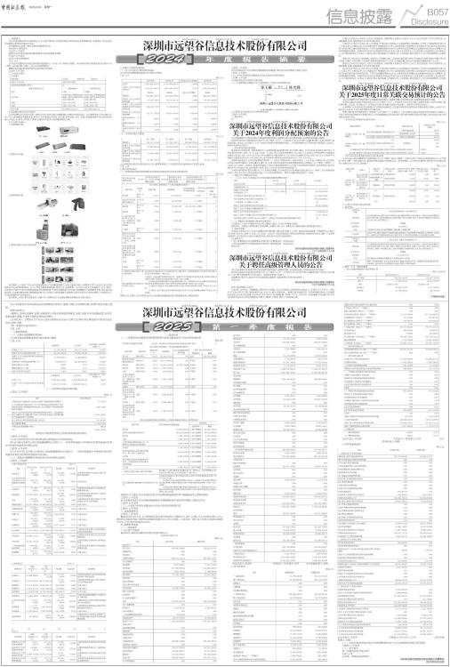 证券代码:002161 证券简称:远 望 谷 公告编号:2025-021 深圳市远望谷信息技术股份有限公司 一、重要提示 本年度报告摘要来自年度报告全文,为全面了解本公司的经营成果、财务状况及未来发展规划,投资者应当到证监会指定媒体仔细阅读年度报告全文。 所有董事均已出席了审议本报告的董事会会议。 非标准审计意见提示 □适用 √不适用 董事会审议的报告期利润分配预案或公积金转增股本预案 √适用 □不适用 是否以公积金转增股本 □是 √否 公司经本次董事会审议通过的利润分配预案为:以739,757,400股为基数,向全体股东每10股派发现金红利0.15元(含税),送红股0股(含税),不以公积金转增股本。 董事会决议通过的本报告期优先股利润分配预案 □适用 □不适用 二、公司基本情况 1、公司简介 ■ 2、报告期主要业务或产品简介 公司的战略定位是成为世界一流的以RFID技术为核心的物联网行业解决方案供应商。公司始终专注于RFID核心技术、产品与系统解决方案的研发,拥有自主研发的电子标签、读写器、手持设备、芯片、天线、系统集成软件等全系列RFID核心产品达100多种,并开发了诸多行业的RFID技术产品和整体解决方案。 公司主要产品展示: 1、智慧铁路市场 ■ 2、智慧文化市场 ■ 3、服饰零售市场 ■ 4、智慧仓储RFID技术应用场景 ■ 报告期内,公司坚持“内生加外延发展相结合”的战略发展模式,内生式发展方面,公司聚焦主营行业业务,努力开拓新的RFID应用市场和领域。公司主营业务聚焦智慧铁路、智慧文化、服饰零售三大行业,同时大力发展医疗、电力、烟草、酒类及其它新兴行业RFID物联网垂直应用领域市场,为各行业提供基于RFID技术的物联网产品和解决方案。在外延式发展方面,公司通过股权投资、物联网基金等方式,投资公司业务战略产业链相关的项目和公司,培育和孵化产业链项目公司,推动物联网产业快速成长。 报告期内,公司从事的主营业务、主要产品、经营模式以及主要业绩驱动因素未发生重大变化。 3、主要会计数据和财务指标 (1) 近三年主要会计数据和财务指标 公司是否需追溯调整或重述以前年度会计数据 □是 √否 单位:元 ■ (2) 分季度主要会计数据 单位:元 ■ 上述财务指标或其加总数是否与公司已披露季度报告、半年度报告相关财务指标存在重大差异 □是 √否 4、股本及股东情况 (1) 普通股股东和表决权恢复的优先股股东数量及前10名股东持股情况表 单位:股 ■ 持股5%以上股东、前10名股东及前10名无限售流通股股东参与转融通业务出借股份情况 □适用 √不适用 前10名股东及前10名无限售流通股股东因转融通出借/归还原因导致较上期发生变化 □适用 √不适用 (2) 公司优先股股东总数及前10名优先股股东持股情况表 □适用 √不适用 公司报告期无优先股股东持股情况。 (3) 以方框图形式披露公司与实际控制人之间的产权及控制关系 ■ 5、在年度报告批准报出日存续的债券情况 □适用 √不适用 三、重要事项 无 证券代码:002161 证券简称:远望谷 公告编码:2025-022 深圳市远望谷信息技术股份有限公司 关于2024年度利润分配预案的公告 本公司及董事会全体成员保证信息披露内容的真实、准确和完整,没有虚假记载、误导性陈述或重大遗漏。 深圳市远望谷信息技术股份有限公司(以下简称“公司”)于2025年4月24日召开第八届董事会第二次会议和第八届监事会第二次会议,审议通过了《关于2024年度利润分配预案的议案》。本预案尚需提交公司2024年年度股东大会审议。现将有关事项公告如下: 一、2024年度利润分配预案 经众华会计师事务所(特殊普通合伙)出具的标准无保留意见的《审计报告》确认,公司2024年度实现归属于母公司所有者的净利润(合并)为 27,847,758.47 元,其中母公司实现净利润55,251,620.17元,按母公司净利润的10%提取法定盈余公积金5,525,162.02元后,加上母公司期初未分配利润589,772,055.58元,截至2024年12月31日,母公司报表中可供股东分配的利润为626,182,880.53元,合并报表中可供股东分配的利润为315,368,334.67元。 依据中国证监会《上市公司监管指引第3号一一上市公司现金分红》(2023年修订)、《关于进一步落实上市公司现金分红有关事项的通知》(证监发【2012】37号)以及《深圳市远望谷信息技术股份有限公司章程》(以下简称“《章程》”)《未来三年(2022--2024年)股东回报规划》中有关利润分配的规定,公司基于2024年度经营成果、现金流情况,综合考虑2025年公司经营计划、重大投资计划等,拟定了2024年度利润分配预案如下: 公司2024年度拟以股份总数739,757,400股为基数,向全体股东每10股派发现金红利0.15元(含税),合计派发现金红利11,096,361.00元,送红股0股(含税),不以公积金转增股本。其余未分配利润结转到下一年度。 二、现金分红方案的具体情况 (一)、公司 2024 年度现金分红方案不触及其他风险警示情形 ■ (二)、不触及其他风险警示情形的具体原因 公司最近三个会计年度累计现金分红总额高于最近三个会计年度年均净利 润的30%。不触及《深圳证券交易所股票上市规则》第 9.8.1 条规定的可能被实施其他风险警示情形。 三、监事会意见 经审核,监事会认为:公司本年度提出的利润分配方案,综合考虑了公司经 营情况及发展需要,严格按照《公司法》《证券法》及公司《章程》《未来三年(2022--2024