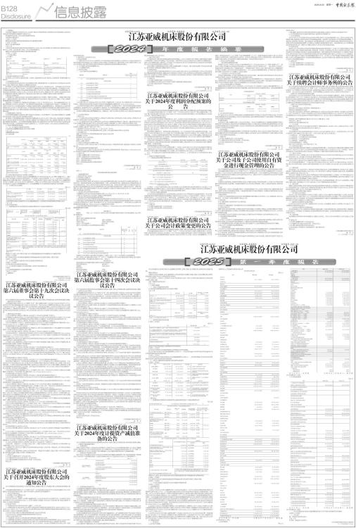 证券代码:002559 证券简称:亚威股份 公告编号:2025-027 江苏亚威机床股份有限公司 一、重要提示 本年度报告摘要来自年度报告全文,为全面了解本公司的经营成果、财务状况及未来发展规划,投资者应当到证监会指定媒体仔细阅读年度报告全文。 所有董事均已出席了审议本报告的董事会会议。 非标准审计意见提示 □适用 √不适用 董事会审议的报告期利润分配预案或公积金转增股本预案 √适用 □不适用 是否以公积金转增股本 □是 √否 公司经本次董事会审议通过的利润分配预案为:以543,558,024为基数,向全体股东每10股派发现金红利0.75元(含税),送红股0股(含税),不以公积金转增股本。 董事会决议通过的本报告期优先股利润分配预案 □适用 √不适用 二、公司基本情况 1、公司简介 ■ 2、报告期主要业务或产品简介 报告期内,公司从事的主要业务包括三大板块:金属成形机床业务、激光加工装备业务、智能制造解决方案业务。 1、金属成形机床业务 公司的金属成形机床业务主要产品包括数控折弯机、数控转塔冲床、压力机等主机产品和钣金自动化柔性加工设备、智能冲压线、卷板加工机械等自动化设备。 报告期内,公司的金属成形机床业务实现营业收入14.49亿元,同比增长9.31%。其中高端主机业务实现营业收入10.12亿元,同比上升8.88%。单项冠军产品数控折弯机充分利用市场品牌优势,产品持续优化升级,年销量保持稳定增长;伺服压力机业务取得阶段性成长,1250T多工位伺服压力机实现汽车行业销售突破。自动化设备实现营业收入4.36亿元,同比上升10.3%。钣金机床自动化、智能化水平进一步提升,钣金成套自动化生产线销量创历史新高;伺服冲压生产线成功进入家电龙头企业,智能冲压解决方案能力持续提升。 2、激光加工装备业务 公司的激光加工装备业务主要产品包括面向金属材料加工领域的二维激光切割机、二维激光柔性切割单元、三维激光切割系统、激光切管设备、激光焊接系统及自动化成套生产线;面向显示面板、半导体、新能源领域的精密激光加工设备等。 报告期内,公司的激光加工装备业务实现营业收入5.76亿元,同比增长8.12%。其中金属材料激光加工设备实现营业收入4.98亿元,同比持平。面对激烈的市场竞争形势,公司加强各系列产品技术工艺性能优化,切实提升市场竞争力,平面激光切割机产品销售台套数持续增长,销售规模整体稳定。精密激光加工设备业务实现营业收入0.79亿元,同比增长128%,公司持续加大技术消化吸收和市场拓展力度,紧抓车载及IT显示行业的快速发展机遇,OLED 模组设备获显示面板高端企业批量订单,在中大尺寸柔性显示激光加工领域取得显著成效。 3、智能制造解决方案业务 公司的智能制造解决方案业务主要产品包括工业机器人、工业管理软件、工业互联网大数据平台、仓储物流自动化系统、设备自动化和产线智能化改造等。 报告期内,公司的智能制造解决方案业务实现营业收入0.32亿元,同比下降53.58%。直线机器人积极推进新行业、新应用、新客户的市场开拓,以高品质、高精度产品优势稳定供货于汽车、新能源、船舶等行业,在中高端市场影响力持续提升。公司不断推进智能制造服务应用,亚威码易EAP低代码开发平台和MOM智造运营管理系统正式发版,工业管理软件在钣金行业持续发力,三大标准产品EMC、PDS、MES已实现市场化应用。 3、主要会计数据和财务指标 (1) 近三年主要会计数据和财务指标 公司是否需追溯调整或重述以前年度会计数据 √是 □否 追溯调整或重述原因 会计政策变更 元 ■ 会计政策变更的原因及会计差错更正的情况 财政部于2024年12月发布《企业会计准则解释第18号》(财会[2024]24号,以下简称“解释18号”), 规定对于不属于单项履约义务的保证类质量保证,应当按照《企业会计准则第 13 号一一或有事项》有关规定,按确定的预计负债金额,借记“主营业务成本”、“其他业务成本”等科目,贷记“预计负债”科目,该解释规定自印发之日起施行,允许企业自发布年度提前执行。根据上述文件要求,结合公司实际情况,公司自2024年1月1日起执行《企业会计准则解释第18号》,采用追溯调整法对可比期间的财务报表进行相应调整。 (2) 分季度主要会计数据 单位:元 ■ 上述财务指标或其加总数是否与公司已披露季度报告、半年度报告相关财务指标存在重大差异 □是 √否 4、股本及股东情况 (1) 普通股股东和表决权恢复的优先股股东数量及前10名股东持股情况表 单位:股 ■ 持股5%以上股东、前10名股东及前10名无限售流通股股东参与转融通业务出借股份情况 □适用 √不适用 前10名股东及前10名无限售流通股股东因转融通出借/归还原因导致较上期发生变化 □适用 √不适用 (2) 公司优先股股东总数及前10名优先股股东持股情况表 □适用 √不适用 公司报告期无优先股股东持股情况。 (3) 以方框图形式披露公司与实际控制人之间的产权及控制关系 不适用 5、在年度报告批准报出日存续的债券情况 □适用 √不适用 三、重要事项 无 江苏亚威机床股份有限公司 法定代表人:冷志斌 二○二五年四月二十八日 证券代码:002559 证券简称:亚威股份 公告编号:2025-025 江苏亚威机床股份有限公司 第六届董事会第十九次会议决议公告 本公司及董事会全体成员保证信息披露的内容真实、准确、完整,