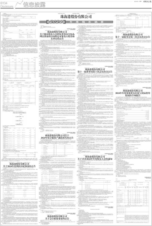 证券代码:000507 证券简称:珠海港 公告编号:2025-017 一、重要提示 本年度报告摘要来自年度报告全文,为全面了解本公司的经营成果、财务状况及未来发展规划,投资者应当到证监会指定媒体仔细阅读年度报告全文。 除下列董事外,其他董事亲自出席了审议本次年报的董事局会议 ■ 非标准审计意见提示 □适用 √不适用 董事局审议的报告期利润分配预案或公积金转增股本预案 √适用 □不适用 是否以公积金转增股本 □是 √否 公司经本次董事局审议通过的利润分配预案为:以2024年末公司总股本919,734,895股扣减公司回购专用证券账户已回购股份14,130,000股,即以905,604,895为基数,向全体股东每10股派发现金红利0.65元(含税),送红股0股(含税),不以公积金转增股本。本次利润分配预案公告后至方案实施前,因股份回购等致使公司总股本发生变动的,公司将以实施分配方案股权登记日时享有利润分配权的股份总额为基数,按照分配总额不变的原则对每股分红金额进行调整。 董事局决议通过的本报告期优先股利润分配预案 □适用 √不适用 二、公司基本情况 1、公司简介 ■ 2、报告期主要业务或产品简介 1、港航物流 主要从事港口的投资运营、船舶运输、物流及港航配套服务等业务。港航业务,以位于珠海高栏母港的海港码头港弘码头及位于西江流域、长江流域的四个控股内河码头为依托,发挥广珠铁路直达高栏港区及江海联运、海铁联运、水水中转等多式联运优势,开展西江驳运及国内沿海运输业务,致力于构建功能齐全、服务优质、运作高效的现代港口综合服务体系,实现粤港澳大湾区和长江经济带的双轮业务驱动,以打造华南国际枢纽大港,并致力于成为西江流域驳船运输的龙头企业和一流的沿海干散货航运服务商。物流业务,提供包括传统货运、仓储、保税VMI、商贸物流等业务,围绕优势货种开展综合物流服务和全程供应链一体化服务,积极构建区域物流网络,同时抢抓新兴物流业态快速发展趋势,加强与澳门物流企业对接,以洪湾港为核心,发挥其毗邻合作区、衔接粤港澳、集疏运体系成熟等优势,积极挖掘供港澳总包物流、中转配送等业务,打造国内一流的全程物流服务商。港口服务业务,提供包括船代、货代、理货、拖轮、报关等港航配套全程服务,通过向产业链上下游纵向发展完善集疏运体系;以珠海高栏母港为中心,深耕粤港澳大湾区及西江、长江经济带,大力拓展异地业务,提高异地市场份额,致力于打造港航综合服务提供商。 2、新能源 主要从事风力发电、光伏发电、管道燃气、天然气发电等新能源、清洁能源的投资、运营及服务,在全国已投资控股八个陆上风电场,形成了华北、华东、华南三大风力发电基地,参股了珠海金湾海上风电项目,目前风电权益总装机容量约47万千瓦;新能源重点战略方向为陆上集中式风电和光伏电站开发与运营、氢能利用与开发等新能源行业,以期实现稳定的投资收益与良好的社会效益;旗下控股上市公司秀强股份有序推进非公开发行募投项目的实施,深挖智能玻璃、BIPV(光伏建筑一体化)产业潜力,提质增效提升公司核心竞争力;管道燃气主要依托珠海市政府授予的珠海西部地区管道燃气业务特许经营权,从事珠海横琴新区、珠海市西部城区管道燃气的建设、运营及维护,以良好设施和优质服务助力珠海城市建设,并进一步推动珠澳两地燃气互联互通后的更紧密合作。 3、主要会计数据和财务指标 (1) 近三年主要会计数据和财务指标 公司是否需追溯调整或重述以前年度会计数据 □是 √否 单位:百万元 ■ (2) 分季度主要会计数据 单位:百万元 ■ 上述财务指标或其加总数是否与公司已披露季度报告、半年度报告相关财务指标存在重大差异 □是 √否 4、股本及股东情况 (1) 普通股股东和表决权恢复的优先股股东数量及前10名股东持股情况表 单位:股 ■ 持股5%以上股东、前10名股东及前10名无限售流通股股东参与转融通业务出借股份情况 □适用 √不适用 前10名股东及前10名无限售流通股股东因转融通出借/归还原因导致较上期发生变化 □适用 √不适用 (2) 公司优先股股东总数及前10名优先股股东持股情况表 □适用 √不适用 公司报告期无优先股股东持股情况。 (3) 以方框图形式披露公司与实际控制人之间的产权及控制关系 ■ 5、在年度报告批准报出日存续的债券情况 √适用 □不适用 (1) 债券基本信息 ■ (2) 公司债券最新跟踪评级及评级变化情况 报告期内,资信评级机构对公司及公司债券的跟踪评级及主体评级未发生变化。 (3) 截至报告期末公司近2年的主要会计数据和财务指标 单位:万元 ■ 三、重要事项 2024年,面对复杂严峻的国内外经济形势,公司在珠海市委、市政府、市国资委及大股东的有力支持下,围绕“大交通”“大物流”“大平台”相关战略部署,秉持稳中求进的工作方针,聚焦主责主业,注重效益效率,持续提升治理水平,推动公司高质量可持续发展再上新台阶。经审计,公司全年实现营业收入51.25亿元,同比下降6.07%,归属于上市公司股东净利润2.92亿元,同比增长5.37%。具体内容详见《2024年年度报告》。 证券代码:000507 证券简称:珠海港 公告编号:2025-018 珠海港股份有限公司 关于2024年度利润分配预案的公告 本公司及董事局全体成员保证信息披露的内容真实、准确、完整,没有虚假记载、误导性陈