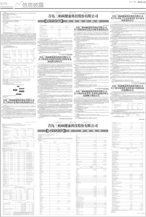 一、重要提示 本年度报告摘要来自年度报告全文,为全面了解本公司的经营成果、财务状况及未来发展规划,投资者应当到证监会指定媒体仔细阅读年度报告全文。 所有董事均已出席了审议本报告的董事会会议。 非标准审计意见提示 □适用 √不适用 董事会审议的报告期利润分配预案或公积金转增股本预案 √适用 □不适用 是否以公积金转增股本 □是 √否 公司经本次董事会审议通过的利润分配预案为:以242,480,914为基数,向全体股东每10股派发现金红利0.10元(含税),送红股0股(含税),不以公积金转增股本。 董事会决议通过的本报告期优先股利润分配预案 □适用 □不适用 二、公司基本情况 1、公司简介 ■ 2、报告期主要业务或产品简介 公司是一家专注于休闲运动和健身器材系列产品研发、设计、生产和销售的高新技术企业,多年来深耕国际市场,为消费者提供专业、科学、安全、有特色、可信赖的休闲运动和健身综合解决方案,并向轻商用、康养器材领域开发延伸,致力于成为国际知名的全生命周期休闲运动健康服务供应商。公司秉承“让人们更简单、更快乐地运动起来,畅享高品质健康生活”的理念,致力于成为蹦床领域的领导者。公司拥有三柏硕、海硕健身和得高钢塑三大生产基地,目前产品库中约31个系列、一千余款产品,形成了休闲运动和健身器材系列产品群,特别是其多样化、高品质的蹦床产品在国际市场广受欢迎。公司具备较强的海外市场开拓及整合能力,凭借优秀的研发设计能力、快速响应能力以及卓越的产品品质,已经与迪卡侬,沃尔玛,亚马逊,雷盾等国际知名零售商及体育品牌建立了良好、稳定的业务合作关系,产品销往多个国家和地区。公司成立至今,积累了深厚的行业经验,积极巩固和发展休闲运动和健身器材业务,不断丰富和延伸产品和业务范围,同时积极向行业上下游拓展。美国子公司思凯沃克在公司业务体系中的定位为跟踪海外市场需求变化的海外研发平台以及推广自有品牌和实施全球化战略的平台。 公司自设立以来一直从事休闲运动和健身器材的研发、设计、生产及销售,休闲运动器材包括不同型号的蹦床以及其他休闲运动器材,健身器材涵盖有氧健身器材和力量型健身器材,包括跑步机、椭圆机、健身车、综合训练机和杠铃架等。公司拥有SKYWALKER、三柏硕(SPORTSOUL)和瑜阳(TECHPLUS)等具有一定国际、国内知名度的自有品牌,亦通过ODM/OEM模式为迪卡侬、雷盾等国际知名企业生产休闲运动和健身器材产品。 3、主要会计数据和财务指标 (1) 近三年主要会计数据和财务指标 公司是否需追溯调整或重述以前年度会计数据 □是 √否 单位:元 ■ (2) 分季度主要会计数据 单位:元 ■ 上述财务指标或其加总数是否与公司已披露季度报告、半年度报告相关财务指标存在重大差异 □是 √否 4、股本及股东情况 (1) 普通股股东和表决权恢复的优先股股东数量及前10名股东持股情况表 单位:股 ■ 持股5%以上股东、前10名股东及前10名无限售流通股股东参与转融通业务出借股份情况 □适用 √不适用 前10名股东及前10名无限售流通股股东因转融通出借/归还原因导致较上期发生变化 □适用 √不适用 (2) 公司优先股股东总数及前10名优先股股东持股情况表 □适用 √不适用 公司报告期无优先股股东持股情况。 (3) 以方框图形式披露公司与实际控制人之间的产权及控制关系 ■ 5、在年度报告批准报出日存续的债券情况 □适用 √不适用 三、重要事项 无 证券代码:001300 证券简称:三柏硕 公告编号:2025-015 青岛三柏硕健康科技股份有限公司 关于2024年度利润分配预案的公告 本公司及董事会全体成员保证信息披露内容的真实、准确和完整,没有虚假记载、误导性陈述或重大遗漏。 一、审议程序 青岛三柏硕健康科技股份有限公司(以下简称“公司”)于2025年4月25日分别召开了第二届董事会第八次会议及第二届监事会第八次会议,审议通过《关于2024年度利润分配预案的议案》,该议案尚需提交公司2024年年度股东大会审议。 二、2024年度利润分配预案基本情况 经和信会计师事务所(特殊普通合伙)审计,公司2024年度实现归属于上市公司股东的净利润22,269,198.00元,母公司实现净利润37,597,214.25元,根据《公司法》和《公司章程》规定,提取法定盈余公积3,759,721.43元。截至2024年12月31日,公司合并报表可分配利润为167,443,170.10元,母公司可分配利润为177,398,895.33元。根据利润分配应以母公司的可供分配利润及合并财务报表的可供分配利润孰低的原则,截至2024年12月31日公司可供股东分配的利润为167,443,170.10元。 基于公司实际经营情况及未来发展需要,综合考虑投资者回报,根据相关法律法规及《公司章程》的规定,在保证公司正常经营的前提下,公司2024年度利润分配预案为:拟以公司2024年12月31日公司总股本243,775,914股扣除公司回购专用证券账户上已回购股份1,295,000股后的总股本242,480,914股为基数,向全体股东每10股派发现金股利0.10元(含税),共计分配现金红利2,424,809.14元,不送红股,不以公积金转增股本。 如在本利润分配预案公告后至实施前,因新增股份上市、股份回购等事项导致本公司总股本发生变化的,公司拟按照现金分红总额固定不变的原则对分配比例进行相应的调整。 三、现金分红方案的具体情况 (一)现金分红方案指标 ■ 注:公司于2022年10