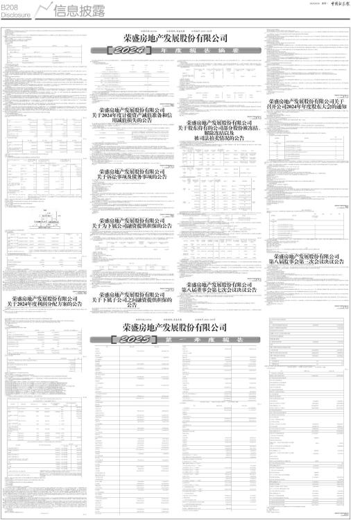 证券代码:002146 证券简称:荣盛发展 公告编号:2025-026号 一、重要提示 本年度报告摘要来自年度报告全文,为全面了解本公司的经营成果、财务状况及未来发展规划,投资者应当到证监会指定媒体仔细阅读年度报告全文。 所有董事均已出席了审议本报告的董事会会议。 非标准审计意见提示 √适用 □不适用 北京澄宇会计师事务所(特殊普通合伙)为公司出具了带强调事项段的无保留意见的审计报告,公司董事会、监事会、董事会审计监督委员会对相关事项已有详细说明,请投资者注意阅读。 董事会审议的报告期利润分配预案或公积金转增股本预案 □适用 √不适用 公司计划不派发现金红利,不送红股,不以公积金转增股本。 董事会决议通过的本报告期优先股利润分配预案 □适用 √不适用 二、公司基本情况 1、公司简介 ■ 2、报告期主要业务或产品简介 (一)公司所从事的主要业务 报告期,公司的主营业务为房地产开发与销售,公司拥有中华人民共和国住房和城乡建设部颁发的房地产开发企业一级资质证书。同时,公司布局了康旅、物业、产业新城等与房地产开发相关的多个板块。 (二)2024年度公司主要经营情况 1、报告期总体经营情况总结 在政府和专班的领导和支持下,公司各大区、各板块坚持“四保一守”的方针,即“保运营、保平衡、保交付、保货值、守底线”,以现金流为主线,以项目为中心,精心安排、扎实工作,各项工作取得了较大进步,债务规模下降,债务结构优化,守住了不发生重大风险的底线。 报告期,公司持续提升经营质量,尤其增强酒店、商管等轻资产运营能力,提前布局,努力夯实和开拓非房新业务,为公司升级转型打下坚实基础。 报告期,公司进行了管理层换届,领导班子得到了更新和加强,组织机构得到了优化,区域整合稳步推进。在全行业面临巨大压力时,长期陪伴公司成长的核心团队体现出了高度的忠诚与担当。 2、报告期公司各板块的经营情况 (1)地产板块 报告期,地产板块坚持以“现金流和净资产”为主线,围绕“三级平衡”的整体要求,在资产和负债两端齐发力,保交楼成果突出,去库存卓有成效,各项工作取得一定成绩。 “保交楼”成绩突出。“保交楼”,对于房企来说不仅是一份信用承诺,更是沉甸甸的社会责任。公司坚持以此为首要任务,量质兼重,严守质量底线,严控施工环节。公司在行业逆境中始终贯彻用户至上理念,报告期各项目交付客户平均满意度高于90%。 “保运营”健康平稳。报告期,公司以项目为中心,推进一项目一政策,及时跟踪,动态调整,达到较好效果,未出现重大负面社会舆情。公司用水滴石穿、绳锯木断的精神解决一个又一个难题,积极化解债务,使得公司债务结构得到了优化。 坚持现金流为主线,增效减费。报告期,公司在资产和负债两端齐发力,做好资金流入、流出的增减工作。在资金流入方面,营销系统抓节奏、去库存,取得了较好成绩;另外,公司积极盘活闲置资产,努力实现颗粒归仓。在资金流出方面,公司提高资金的使用效能,减少一切不必要支出,过苦日子、紧日子。 (2)康旅板块 报告期,康旅板块秉持大荣盛格局,坚守使命,努力开辟新赛道,为转型升级夯实基础。 康旅板块持续提升经营水平并优化结构。报告期内新增消费类业态53个,并通过与客户充分互动,场景类新零售业务同比提升39%;节日类统销新零售通过匹配主力消费人群需求,优化产品结构,增加网红款产品进行推广,销售规模及利润率稳中有升;为提升转化复购率,全面落实“小盛官方微信”,更好地服务客户;通过深化“盛行天下”会员模式,优化新媒体营销矩阵,强化文旅IP与场景化运营,推动业绩结构调优与成本效率提升。 报告期,康旅酒店运营以“内容+文化+场景组合”为核心策略,提炼自有文旅运营新模式,成功塑造“一店一特色、一店一视界”的独特品牌形象。北戴河健康谷荣逸、塞罕坝阿尔卡迪亚、九华山阿尔卡迪亚等通过深度挖掘当地文化资源,打造差异化体验场景,实现品牌价值与经营效益的双提升。 (3)物业板块 荣万家作为全国性战略服务网络的综合性物业管理服务提供商,秉承以客户为中心的服务理念和“成就生活之美”的企业使命,提高服务质量,树立优质品牌形象,贯彻“致诚、致暖、致远”的价值观,以成为服务理念超前、百姓生命全周期、社区服务全链条,贴心的、有温度的、值得信赖的、受百姓欢迎的优质生活服务商为目标而努力。 报告期,荣万家物业管理服务质量持续提升,管理面积规模持续高质量增长,业态持续扩展;社区服务持续提升服务品质,提供高质量物业服务产品;商企服务不断拓展范围,服务多重业务类型。 报告期,荣万家获得诸多荣誉:“2024中国物业服务综合实力百强企业第14名”、“2024中国住宅物业服务企业TOP20”、“2024中国物业增值服务运营领军企业”、“2024中国物业服务企业华北30强”、“2024中国物业服务满意度领先企业”、“2024中国智慧社区服务领先企业”等多项荣誉。 (4)产业新城板块 报告期,产业新城公司结合园区实际,采取多元策略,做好“增资产、降负债”两条主线工作:一是资产盘活与债权清收并举,灵活匹配模式,聚焦回款目标;二是立足融资增强合作方履约能力,促进资金回款周转,并加强资金统筹管控,发挥资金最大效益;三是持续降费增效,强化管理,提高效能。 (5)其他板块 