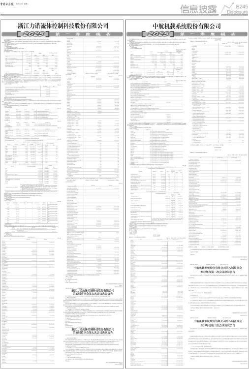 证券代码:600372 证券简称:中航机载 本公司董事会及全体董事保证本公告内容不存在任何虚假记载、误导性陈述或者重大遗漏,并对其内容的真实性、准确性和完整性承担法律责任。 重要内容提示 公司董事会、监事会及董事、监事、高级管理人员保证季度报告内容的真实、准确、完整,不存在虚假记载、误导性陈述或重大遗漏,并承担个别和连带的法律责任。 公司负责人、主管会计工作负责人及会计机构负责人(会计主管人员)保证季度报告中财务信息的真实、准确、完整。 第一季度财务报表是否经审计 □是 √否 一、主要财务数据 (一)主要会计数据和财务指标 单位:元 币种:人民币 ■ 追溯调整或重述的原因说明 根据《企业会计准则解释第18号》的规定,对不属于单项履约义务的保证类质量保证产生的预计负债,应当按确定的金额计入“营业成本”,不再计入“销售费用”。因此,公司需对原采用的相关会计政策进行追溯调整。 (二)非经常性损益项目和金额 √适用 □不适用 单位:元 币种:人民币 ■ 对公司将《公开发行证券的公司信息披露解释性公告第1号一一非经常性损益》未列举的项目认定为非经常性损益项目且金额重大的,以及将《公开发行证券的公司信息披露解释性公告第1号一一非经常性损益》中列举的非经常性损益项目界定为经常性损益的项目,应说明原因。 □适用 √不适用 (三)主要会计数据、财务指标发生变动的情况、原因 √适用 □不适用 ■ 二、股东信息 (一)普通股股东总数和表决权恢复的优先股股东数量及前十名股东持股情况表 单位:股 ■ 持股5%以上股东、前10名股东及前10名无限售流通股股东参与转融通业务出借股份情况 □适用 √不适用 前10名股东及前10名无限售流通股股东因转融通出借/归还原因导致较上期发生变化 □适用 √不适用 三、其他提醒事项 需提醒投资者关注的关于公司报告期经营情况的其他重要信息 □适用 √不适用 四、季度财务报表 (一)审计意见类型 □适用 √不适用 (二)财务报表 合并资产负债表 2025年3月31日 编制单位:中航机载系统股份有限公司 单位:元 币种:人民币 审计类型:未经审计 ■ 公司负责人:王建刚 主管会计工作负责人:杨鲜叶 会计机构负责人:张灵斌 合并利润表 2025年1一3月 编制单位:中航机载系统股份有限公司 单位:元 币种:人民币 审计类型:未经审计 ■ 公司负责人:王建刚 主管会计工作负责人:杨鲜叶 会计机构负责人:张灵斌 合并现金流量表 2025年1一3月 编制单位:中航机载系统股份有限公司 单位:元 币种:人民币 审计类型:未经审计 ■ 公司负责人:王建刚 主管会计工作负责人:杨鲜叶 会计机构负责人:张灵斌 (三)2025年起首次执行新会计准则或准则解释等涉及调整首次执行当年年初的财务报表 □适用 √不适用 特此公告 中航机载系统股份有限公司董事会 2025年4月29日 股票代码:600372 股票简称:中航机载 编号:临2025-024 中航机载系统股份有限公司第八届监事会 2025年度第二次会议决议公告 本公司监事会及全监事体保证本公告内容不存在任何虚假记载、误导性陈述或者重大遗漏,并对其内容的真实性、准确性和完整性承担法律责任。 中航机载系统股份有限公司(以下简称公司)第八届监事会2025年度第二次会议会议通知及会议资料于2025年4月24日以直接送达或电子邮件等方式送达公司各位监事。会议采取通讯表决的方式召开,表决的截止时间为2025年4月28日12时。会议应参加表决的监事5人,实际表决的监事5人。本次会议的召开符合《中华人民共和国公司法》及《公司章程》的规定。会议以记名表决的方式,审议并一致通过如下议案: 一、《关于审议公司2025年第一季度报告的议案》 公司监事会认为: 1、公司2025年第一季度报告全文及正文的编制和审议程序符合法律、法规、公司章程和公司内部管理制度的各项规定; 2、公司2025年第一季度报告全文及正文的内容和格式符合中国证监会和上海证券交易所的各项规定,所包含的信息从各个方面真实、准确、完整地反映出公司当期的经营管理和财务状况等事项; 3、在公司监事会提出本意见前,未发现参与公司2025年第一季度报告全文及正文的编制和审议的人员有违反保密规定的行为。 与会监事以5票赞成,0票反对,0票弃权通过该议案。(见同日公告) 特此公告。 中航机载系统股份有限公司监事会 2025年4月29日 股票代码:600372 股票简称:中航机载 编号:临2025-023 中航机载系统股份有限公司第八届董事会 2025年度第三次会议决议公告 本公司董事会及全体董事保证本公告内容不存在任何虚假记载、误导性陈述或者重大遗漏,并对其内容的真实性、准确性和完整性承担法律责任。 中航机载系统股份有限公司(以下简称公司)第八届董事会2025年度第三次会议会议通知及会议资料于2025年4月24日以直接送达或电子邮件等方式送达公司各位董事及高管人员。会议于2025年4月28日在北京市朝阳区曙光西里甲5号院16号楼2521会议室以现场结合视频方式召开。会议应参加表决的董事9人,实际表决的董事9人。会议的召开符合《中华人民共和国公司法》及《公司章程》的规定。会议以记名表决的方式,审议并一致通过如下议案: 一、《关于审议公司2025年第一季度报告的议案》 该议案经公司第八届董事会审计委员会2025年度第四次会议审议通过后提交本