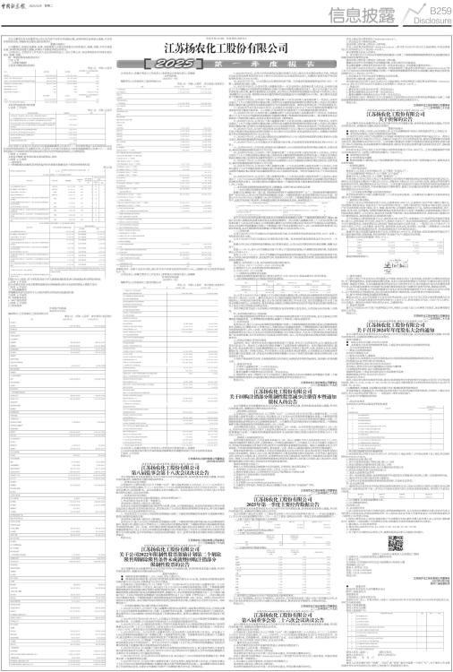 证券代码:600486 证券简称:扬农化工 本公司董事会及全体董事保证本公告内容不存在任何虚假记载、误导性陈述或者重大遗漏,并对其内容的真实性、准确性和完整性承担法律责任。 重要内容提示 公司董事会、监事会及董事、监事、高级管理人员保证季度报告内容的真实、准确、完整,不存在虚假记载、误导性陈述或重大遗漏,并承担个别和连带的法律责任。 公司负责人、主管会计工作负责人及会计机构负责人(会计主管人员)保证季度报告中财务信息的真实、准确、完整。 第一季度财务报表是否经审计 □是 √否 一、主要财务数据 主要会计数据和财务指标 单位:元 币种:人民币 ■ 非经常性损益项目和金额 √适用 □不适用 单位:元 币种:人民币 ■ 对公司将《公开发行证券的公司信息披露解释性公告第1号一一非经常性损益》未列举的项目认定为非经常性损益项目且金额重大的,以及将《公开发行证券的公司信息披露解释性公告第1号一一非经常性损益》中列举的非经常性损益项目界定为经常性损益的项目,应说明原因。 □适用 √不适用 主要会计数据、财务指标发生变动的情况、原因 □适用 √不适用 二、股东信息 (一)普通股股东总数和表决权恢复的优先股股东数量及前十名股东持股情况表 单位:股 ■ 持股5%以上股东、前10名股东及前10名无限售流通股股东参与转融通业务出借股份情况 □适用 √不适用 前10名股东及前10名无限售流通股股东因转融通出借/归还原因导致较上期发生变化 □适用 √不适用 三、其他提醒事项 需提醒投资者关注的关于公司报告期经营情况的其他重要信息 □适用 √不适用 四、季度财务报表 (一)审计意见类型 □适用 √不适用 (二)财务报表 合并资产负债表 2025年3月31日 编制单位:江苏扬农化工股份有限公司 单位:元 币种:人民币 审计类型:未经审计 ■ 公司负责人:苏赋主管会计工作负责人:李常青会计机构负责人:孙琳菁 合并利润表 2025年1一3月 编制单位:江苏扬农化工股份有限公司 单位:元 币种:人民币 审计类型:未经审计 ■ 本期发生同一控制下企业合并的,被合并方在合并前实现的净利润为:0元,上期被合并方实现的净利润为:0 元。 公司负责人:苏赋主管会计工作负责人:李常青会计机构负责人:孙琳菁 合并现金流量表 2025年1一3月 编制单位:江苏扬农化工股份有限公司 单位:元 币种:人民币 审计类型:未经审计 ■ 公司负责人:苏赋主管会计工作负责人:李常青会计机构负责人:孙琳菁 (三)2025年起首次执行新会计准则或准则解释等涉及调整首次执行当年年初的财务报表 □适用 √不适用 特此公告 江苏扬农化工股份有限公司董事会 2025年4月26日 证券代码:600486证券简称:扬农化工编号:临2025-015 江苏扬农化工股份有限公司 第八届监事会第十八次会议决议公告 本公司监事会及全体监事保证本公告内容不存在任何虚假记载、误导性陈述或者重大遗漏,并对其内容的真实性、准确性和完整性承担法律责任。 一、监事会会议召开情况 江苏扬农化工股份有限公司(以下简称“公司”)第八届监事会第十八次会议,于二〇二五年四月十六日以书面方式发出通知,于二〇二五年四月二十六日以现场及视频通讯方式在公司会议室召开。会议应到监事5名,实到监事5名。会议由监事会主席王春鹏主持。本次会议的召开符合《公司法》及《公司章程》的有关规定,会议合法有效。 二、监事会会议审议情况 本次监事会会议所有议案均获得通过,具体表决情况如下: 1、审议同意公司2025年第一季度报告。 表决结果:5票同意、0票反对、0票弃权。 监事会认为该报告的编制和审议程序符合法律、法规、公司章程的规定,报告的内容和格式符合中国证监会和上海证券交易所的各项规定,真实地反映了公司报告期的经营管理和财务状况,参与报告编制和审议的人员无违反保密规定的行为。 2、审议同意关于公司2022年限制性股票激励计划第二个解除限售期解除限售条件未成就暨回购注销部分限制性股票的议案。 表决结果:5票同意、0票反对、0票弃权。 监事会认为:鉴于公司2022年限制性股票激励计划第二个解除限售期业绩考核目标未达到解除限售条件,根据公司《激励计划》《管理办法》,回购注销260名激励对象第二个解除限售期不满足解除限售条件的限制性股票1,265,145股。本次回购注销部分限制性股票已履行相应的决策程序,符合《上市公司股权激励管理办法》及《公司2022年限制性股票激励计划》的相关规定,不会对公司的财务状况和经营成果产生实质性影响,也不存在损害公司及股东利益的情形。综上,监事会同意本次回购注销部分限制性股票事项。 特此公告。 江苏扬农化工股份有限公司监事会 二○二五年四月二十九日 证券代码:600486证券简称:扬农化工编号:临2025-017 江苏扬农化工股份有限公司 关于公司2022年限制性股票激励计划第二个解除 限售期解除限售条件未成就暨回购注销部分 限制性股票的公告 本公司董事会及全体董事保证本公告内容不存在任何虚假记载、误导性陈述或者重大遗漏,并对其内容的真实性、准确性和完整性承担法律责任。 重要内容提示: ● 限制性股票回购数量:1,265,145股,涉及人数260人。 ● 限制性股票回购价格:首次授予的限制性股票回购价格为38.35元/股,预留部分的限制性股票回购价格为31.52元/股,