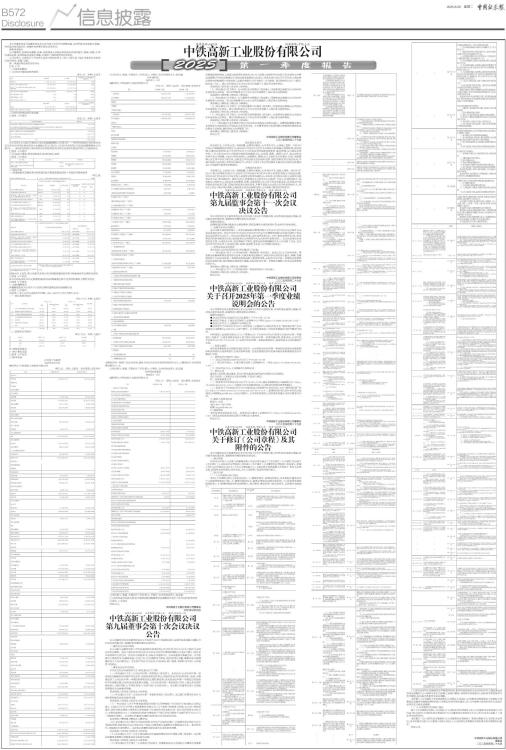 证券代码:600528 证券简称:中铁工业 中铁高新工业股份有限公司 本公司董事会及全体董事保证本公告内容不存在任何虚假记载、误导性陈述或者重大遗漏,并对其内容的真实性、准确性和完整性承担法律责任。 重要内容提示 公司董事会、监事会及董事、监事、高级管理人员保证季度报告内容的真实、准确、完整,不存在虚假记载、误导性陈述或重大遗漏,并承担个别和连带的法律责任。 公司负责人、主管会计工作负责人及会计机构负责人(会计主管人员)保证季度报告中财务信息的真实、准确、完整。 第一季度财务报表是否经审计 □是 √否 一、主要财务数据 (一)主要会计数据和财务指标 单位:元 币种:人民币 ■ (二)非经常性损益项目和金额 √适用 □不适用 单位:元 币种:人民币 ■ 对公司将《公开发行证券的公司信息披露解释性公告第1号一一非经常性损益》未列举的项目认定为非经常性损益项目且金额重大的,以及将《公开发行证券的公司信息披露解释性公告第1号一一非经常性损益》中列举的非经常性损益项目界定为经常性损益的项目,应说明原因。 □适用 √不适用 (三)主要会计数据、财务指标发生变动的情况、原因 √适用 □不适用 ■ 二、股东信息 (一)普通股股东总数和表决权恢复的优先股股东数量及前十名股东持股情况表 单位:股 ■ 持股5%以上股东、前10名股东及前10名无限售流通股股东参与转融通业务出借股份情况 □适用 √不适用 前10名股东及前10名无限售流通股股东因转融通出借/归还原因导致较上期发生变化 □适用 √不适用 三、其他提醒事项 需提醒投资者关注的关于公司报告期经营情况的其他重要信息 √适用 □不适用 2025年1-3月,公司完成新签合同额1,064,446万元,同比下降17.47%。 (一)按业务类型统计 单位:万元 币种:人民币 ■ (二)按地区分布统计 单位:万元 币种:人民币 ■ 四、季度财务报表 (一)审计意见类型 □适用 √不适用 (二)财务报表 合并资产负债表 2025年3月31日 编制单位:中铁高新工业股份有限公司 单位:元 币种:人民币 审计类型:未经审计 ■ 公司负责人:张威 主管会计工作负责人:宁辉东 会计机构负责人:高志威 合并利润表 2025年1一3月 编制单位:中铁高新工业股份有限公司 单位:元 币种:人民币 审计类型:未经审计 ■ 本期发生同一控制下企业合并的,被合并方在合并前实现的净利润为:0元,上期被合并方实现的净利润为:0 元。 公司负责人:张威 主管会计工作负责人:宁辉东 会计机构负责人:高志威 合并现金流量表 2025年1一3月 编制单位:中铁高新工业股份有限公司 单位:元 币种:人民币 审计类型:未经审计 ■ 公司负责人:张威 主管会计工作负责人:宁辉东 会计机构负责人:高志威 (三)2025年起首次执行新会计准则或准则解释等涉及调整首次执行当年年初的财务报表 □适用 √不适用 特此公告。 中铁高新工业股份有限公司董事会 2025年4月28日 证券代码:600528 证券简称:中铁工业 编号:临2025-013 中铁高新工业股份有限公司 第九届董事会第十次会议决议公告 本公司董事会及全体董事保证本公告内容不存在任何虚假记载、误导性陈述或重大遗漏,并对其内容的真实性、准确性和完整性承担法律责任。 一、董事会会议召开情况 本公司第九届董事会第十次会议通知和议案等材料已于2025年4月18日以电子邮件方式送达至各位董事,会议于2025年4月28日在北京市丰台区汽车博物馆西路10号院5号楼711会议室以现场表决方式召开。会议应出席董事7名,实际出席董事7名。会议由董事长张威主持。公司监事会主席范经华,监事麻晋超,总会计师、总法律顾问宁辉东,副总经理石庆鹏,董事会秘书葛瑞鹏及有关人员列席会议。会议召开符合有关法律、行政法规、部门规章、规范性文件和《公司章程》的规定。 二、董事会会议审议情况 本次会议以记名投票的方式,审议通过以下议案: (一)审议通过《关于〈公司2025年第一季度报告〉的议案》。会议认为:公司2025年第一季度报告的编制和审议程序符合法律、法规及相关监管规定,该报告所包含的信息真实、准确、完整地反映了公司2025年第一季度的财务状况和主要经营成果;未发现2025年第一季度报告所载资料存在虚假记载、误导性陈述或者重大遗漏。《公司2025年第一季度报告》详见上海证券交易所网站及《上海证券报》《中国证券报》《证券日报》《证券时报》。本议案已经董事会审计与风险管理委员会全体委员同意。 表决情况:7票同意、0票反对、0票弃权。 (二)审议通过《关于〈公司2025年第一季度财务报告〉的议案》。本议案已经董事会审计与风险管理委员会全体委员同意。 表决情况:7票同意、0票反对、0票弃权。 (三)审议通过《关于中铁装备清算注销郑州公用坤城地下空间综合开发有限公司的议案》。同意公司子公司中铁工程装备集团有限公司(以下简称中铁装备)按照《公司法》等相关规定,清算注销其参股公司郑州公用坤城地下空间综合开发有限公司(该公司注册资本1000万元,中铁装备持股10%),并按持股比例参与剩余财产分配,所得分配财产金额不低于92.31万元(含转账手续费)。本议案已经董事会战略与投资委员会全体委员同意。 表决情况:7票同意、0票反对、0票弃权。 (四)审议通过《关于聘任公司副总经理、安全生产总监的议案》。同意聘任张志国先生为