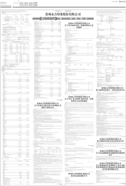 证券代码:603058 证券简称:永吉股份 转债代码:113646 转债简称:永吉转债 本公司董事会及全体董事保证本公告内容不存在任何虚假记载、误导性陈述或者重大遗漏,并对其内容的真实性、准确性和完整性承担法律责任。 重要内容提示 公司董事会、监事会及董事、监事、高级管理人员保证季度报告内容的真实、准确、完整,不存在虚假记载、误导性陈述或重大遗漏,并承担个别和连带的法律责任。 公司负责人、主管会计工作负责人及会计机构负责人(会计主管人员)保证季度报告中财务信息的真实、准确、完整。 第一季度财务报表是否经审计 □是 √否 一、主要财务数据 (一)主要会计数据和财务指标 单位:元 币种:人民币 ■ (二)非经常性损益项目和金额 √适用 □不适用 单位:元 币种:人民币 ■ 对公司将《公开发行证券的公司信息披露解释性公告第1号一一非经常性损益》未列举的项目认定为非经常性损益项目且金额重大的,以及将《公开发行证券的公司信息披露解释性公告第1号一一非经常性损益》中列举的非经常性损益项目界定为经常性损益的项目,应说明原因。 □适用 √不适用 (三)主要会计数据、财务指标发生变动的情况、原因 √适用 □不适用 ■ 二、股东信息 (一)普通股股东总数和表决权恢复的优先股股东数量及前十名股东持股情况表 单位:股 ■ 持股5%以上股东、前10名股东及前10名无限售流通股股东参与转融通业务出借股份情况 □适用 √不适用 前10名股东及前10名无限售流通股股东因转融通出借/归还原因导致较上期发生变化 □适用 √不适用 三、其他提醒事项 需提醒投资者关注的关于公司报告期经营情况的其他重要信息 √适用 □不适用 公司于2025年4月23日召开第六届董事会第十次会议审议通过了《关于公司2024年度利润分配预案的议案》,公司2024年年度拟以实施权益分派股权登记日登记的总股本扣除回购专用账户中累计已回购的股份数量为基数分配利润,向全体股东(公司回购证券专用账户股份除外)每10股派发现金股利1.15元(税前)。该方案已经第六届董事会第十次会议和2024年年度股东大会审议通过。 四、季度财务报表 (一)审计意见类型 □适用 √不适用 (二)财务报表 合并资产负债表 2025年3月31日 编制单位:贵州永吉印务股份有限公司 单位:元 币种:人民币 审计类型:未经审计 ■ 公司负责人:邓代兴主管会计工作负责人:王忱会计机构负责人:杨倩 合并利润表 2025年1一3月 编制单位:贵州永吉印务股份有限公司 单位:元 币种:人民币 审计类型:未经审计 ■ ■ 本期发生同一控制下企业合并的,被合并方在合并前实现的净利润为:0.00元,上期被合并方实现的净利润为:0.00 元。 公司负责人:邓代兴主管会计工作负责人:王忱会计机构负责人:杨倩 合并现金流量表 2025年1一3月 编制单位:贵州永吉印务股份有限公司 单位:元 币种:人民币 审计类型:未经审计 ■ 公司负责人:邓代兴主管会计工作负责人:王忱会计机构负责人:杨倩 (三)2025年起首次执行新会计准则或准则解释等涉及调整首次执行当年年初的财务报表 □适用 √不适用 特此公告 贵州永吉印务股份有限公司董事会 2025年4月29日 证券代码:603058 证券简称:永吉股份 公告编号:2025-056 转债代码:113646 转债简称:永吉转债 贵州永吉印务股份有限公司 关于以集中竞价交易方式回购公司 股份方案的公告 本公司董事会及全体董事保证本公告内容不存在任何虚假记载、误导性陈述或者重大遗漏,并对其内容的真实性、准确性和完整性承担法律责任。 重要内容提示: ● 回购股份用途:本次回购的股份将全部用于注销并减少公司注册资本。 ● 回购股份金额:不低于人民币5,000万元(含),不超过人民币10,000万元(含)。最终回购数量及占公司总股本比例以公司的实际回购情况为准。 ● 回购股份价格:回购价格不超过人民币12.33元/股(含),该价格不高于公司董事会审议通过回购决议前30个交易日公司股票交易均价的150%。具体回购价格由公司股东大会授权管理层在回购实施期间结合公司股票价格、财务状况和经营状况确定。 ● 回购股份资金来源:公司自有资金或自筹资金。 ● 回购股份方式:本次回购股份拟通过上海证券交易所交易系统以集中竞价交易方式进行。 ● 回购股份期限:自公司股东大会审议通过本次回购方案之日起6个月内。 ● 相关股东是否存在减持计划 2025年3月17日,公司披露了《持股5%以上股东减持股份计划公告》(公告编号:2025-030),张海拟从2025年4月9日至2025年7月7日期间,通过集中竞价交易方式减持其所持有的公司股份合计不超过1,050,000股(不超过公司总股本的0.25%)。截至本公告披露日,张海仍在减持期间。 经公司问询,截至本公告披露日,除张海(持股5%以上股东)外,公司控股股东、实际控制人、其他持股5%以上股东未来3个月、未来6个月暂无明确减持计划;公司董监高未来3个月及6个月均无减持计划。若上述主体后续拟实施股份减持计划,公司将按照相关规定及时履行信息披露义务。 ● 相关风险提示: 1、本方案尚需提交公司股东大会审议,如果股东大会未能审议通过本方案,将导致本回购计划无法实施; 2、本次回购方案尚需征询债权人同意,存在债权人不同意而要求公司提前清偿债务或要求公司提供相应担保的风险; 3、若本次回购期限内,公司股票价格持续超出回购方案披