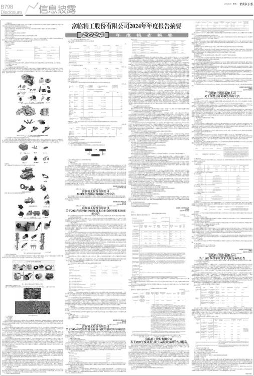 证券代码:300432 证券简称:富临精工 公告编号:2025-015 富临精工股份有限公司2024年年度报告摘要 一、重要提示 本年度报告摘要来自年度报告全文,为全面了解本公司的经营成果、财务状况及未来发展规划,投资者应当到证监会指定媒体仔细阅读年度报告全文。 所有董事均已出席了审议本报告的董事会会议。 立信会计师事务所(特殊普通合伙)对本年度公司财务报告的审计意见为:标准的无保留意见。 非标准审计意见提示 □适用 √不适用 公司上市时未盈利且目前未实现盈利 □适用 √不适用 董事会审议的报告期利润分配预案或公积金转增股本预案 √适用 □不适用 公司经本次董事会审议通过的利润分配预案为:以1,221,257,316股为基数,向全体股东每10股派发现金红利1.00元(含税),送红股0股(含税),以资本公积金向全体股东每10股转增4股。 董事会决议通过的本报告期优先股利润分配预案 □适用 √不适用 二、公司基本情况 1、公司简介 ■ 2、报告期主要业务或产品简介 (一)主要业务情况 公司主要业务为汽车发动机零部件、新能源汽车智能电控和新能源锂电正极材料的研发、生产和销售。 (二)主要产品及用途 1、汽车零部件 (1)汽车发动机及变速箱精密零部件产品 以挺柱、摇臂、喷嘴、张紧器及缸内直喷高压油泵泵壳为主的精密液压零部件,应用于汽车发动机;以VVT(电动EVVT、液压HVVT)、VVL、油泵电磁阀为主的电磁驱动精密零部件,应用于汽车发动机;电子主水泵应用于新型高效率发动机主冷却系统;变速箱电磁阀系列产品,应用于自动变速箱和混动变速箱的电液控制系统。主要产品如下图: ■ 图一:高效节能及混动发动机精密零部件 ■ 图二:自动变速箱精密零部件 (2)新能源汽车智能电控及增量零部件产品 以电子水泵、电子油泵、智能热管理集成模块及电控执行器为主的电子驱动系列产品,应用于新能源汽车、混合动力汽车及传统汽车的热管理及动力系统;车载减速器总成、高精度齿轴及壳体等系列产品,主要应用于新能源车载电驱动系统;可变阻尼减震器电磁阀系列产品应用于智能悬架系统。主要产品如下图: ■ 电磁阀 图三:新能源汽车及混合动力汽车电驱动系统及零部件 ■ 图四:混合动力变速系统精密零部件 ■ 图五:汽车热管理系统及零部件 ■ 图六:智能悬架及制动系统部件 2、机器人关键零部件 以行星电关节模组、谐波电关节模组为主的系列产品集成了精密减速器、电机、角度传感器及电控等关键零部件,用于四足机器狗、双足人形机器人及轮式机器人,主要产品如下图: ■ 图七:机器人智能电关节模组及零部件 3、新能源锂电正极材料产品 主要产品为磷酸铁锂正极材料,应用于新能源汽车动力电池和储能领域。主要产品如下图: ■ (三)经营模式 1、汽车零部件 (1)采购模式 公司汽车零部件业务所需的主要坯料/成品、原辅材料、外购标准件及其他物资采购,由采购部向供应商统一负责开发与采购。按照采购类型不同,分为成熟产品采购、新品开发采购、大宗物资采购和零星采购。每月中旬公司计划物流部依据与主机厂签订的月度订单结合库存情况,编制次月生产计划,并组织安排事业部生成及采购完成交付。 (2)生产模式 公司汽车零部件业务采取专业生产与外协加工相结合的生产方式。汽车零部件产品的研发设计与热处理、精密加工、产品装配、检测等是保证产品质量与竞争力的关键,这些关键工序制造由公司完成。公司仅向外协供应商采购坯料和外协加工服务,这种生产模式最大限度提高了公司的生产能力和综合竞争力。 由于公司产品为主机厂配套的发动机机型各有不同,因而公司产品生产具有多品种、中小批量、定制(非标准件)生产的特点。公司的生产模式为“核心零部件自制和总装(检测)”,采用“预测+订单拉动”的方式组织生产。事业部在生产组织过程中积极运用精益生产工具来提高生产效率,通过精益生产提高生产效率,实施精益改善缩短生产节拍、缩短换线周期,以实现快速响应、缩短交付周期、降低库存水平以提升公司经营绩效。 (3)销售模式 公司汽车零部件产品的销售主要采取直销模式。产品主要向国内外主机厂配套销售,少部分产品通过外贸公司或跨国公司等渠道销往国内外市场。境内主机市场,公司通常在当年年末或下年年初与主机厂签订下年度采购合同,并与第三方物流公司签订相关物流协议。国内售后市场,实行议价销售。境外主机市场,对已在中国合资配套的境外主机厂商,外延业务至其外方市场;对还未在中国设立合资公司的境外客户,公司直接与境外客户进行业务合作。境外售后市场,分为直接出口和间接出口,即直接同客户建立业务合作关系和与专业出口贸易公司进行合作。 2、新能源锂电正极材料 (1)采购模式 公司锂电池正极材料业务实行合格供应商管理制度。供应商开发程序主要用于选择、评估、认可及管理满足公司原材料采购需求的供应商,通过初步筛选、现场考察、试加工与试采购等环节,对供应商的产品质量、供货能力、服务能力、价格进行综合考量。供应商通过考核后被确定为合格供应商。在原材料采购方面严格遵循采购流程,建立了《采购及供方管理程序》、《采购及付款流程》、《生产计划控制程序》、《合同协议评审制度》等完善的采购制度,以及包括供应商开发程序、