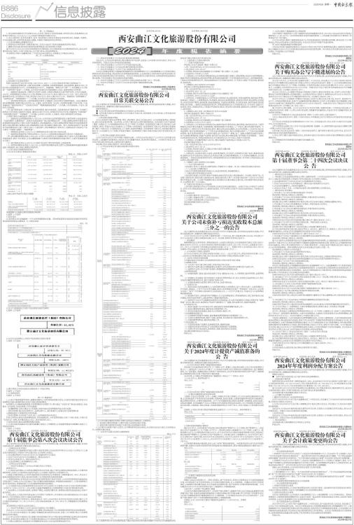 公司代码:600706 公司简称:曲江文旅 第一节 重要提示 1、本年度报告摘要来自年度报告全文,为全面了解本公司的经营成果、财务状况及未来发展规划,投资者应当到http://www.sse.com.cn网站仔细阅读年度报告全文。 2、本公司董事会、监事会及董事、监事、高级管理人员保证年度报告内容的真实性、准确性、完整性,不存在虚假记载、误导性陈述或重大遗漏,并承担个别和连带的法律责任。 3、公司全体董事出席董事会会议。 4、希格玛会计师事务所(特殊普通合伙)为本公司出具了标准无保留意见的审计报告。 5、董事会决议通过的本报告期利润分配预案或公积金转增股本预案 鉴于2024年12月31日公司合并报表期末未分配利润、母公司报表期末未分配利润均为负,故2024年度利润分配方案为:不进行利润分配,也不进行资本公积金转增股本。 本议案经公司第十届董事会第二十四次会议审议通过后,尚需提交公司股东会审议。 第二节 公司基本情况 1、公司简介 ■ ■ 2、报告期公司主要业务简介 按照《国民经济行业分类与代码(GB/T4754-2011)》,公司主营业务及所处行业情况如下: (一)旅游景区管理业务:主要有景区管理、公园管理、水族馆管理服务、游乐园管理。截至2024年,全国共有5A级旅游景区358个,4A级旅游景区3034个,普遍面临“购票人次下降”“二次消费收入占比较低”“经营性资产盘活”三大问题,正在向综合创建文化和旅游融合示范区、旅游度假区方向发展。 (二)旅游演艺发展业务:主要有文艺创作与表演、文物及非物质文化遗产保护利用、文化活动服务。2024年,全国旅游演艺共演出18.93万场,票房收入163.89亿元,观众人数8542.23万人次。其中,西安共有旅游演艺21部,全年演出3.6万场,票房收入约16亿元,观众人数1600万人次。普遍面临“投资规模大”“运营成本高”“销售渠道单一”三大问题,正在向分众化互娱演艺方向发展。 (三)酒店餐饮管理业务:主要有旅游饭店管理、正餐服务、园区和单位后勤管理服务。全国主题精品酒店和精致餐厅消费市场正在向本土化、主题化、品质化发展。2024年,全国黑珍珠餐厅共有341家。行业普遍面临“道地食材供应”“美食技艺传承”“精致体验场景营造”三大问题,正在向连锁化、产品化、国际化方向发展。 (四)旅行服务业务:主要有旅行社及相关服务、数字内容服务、互联网旅游出行服务平台。全国旅行服务业正在向垂直互联网方向发展。截至2024年9月30日,全国旅行社约62766家,普遍面临“内容创新”“目的地整合服务”“在线服务”三大问题,正在向小众定制、人文服务、垂直互联网营销方向发展。 公司报告期内从事的业务主要有6类。 (一)旅游景区运营管理业务收入占比52%:公司市场化运营管理的景区主要有国家5A级旅游景区“大唐芙蓉园·大雁塔景区”、国家4A级旅游景区“曲江海洋极地公园”,开展公建物业管理并提供大众游客服务的旅游景区主要有大唐不夜城景区、西安城墙景区,开展公建物业管理并提供市民游客服务的城市公园主要有曲江池遗址公园、唐城墙遗址公园、唐大慈恩寺遗址公园。其中,旅游景区演艺产品主要有大唐芙蓉园景区《鼓》《梦回大唐》《大唐追梦》,西安城墙景区《梦长安》,现象级景区互娱演艺产品主要有“不倒翁小姐姐”、“盛唐密盒”。 (二)园林绿化业务收入占比1%:公司园林绿化业务主要分布于城市公园。 (三)旅游商品销售和电子商务业务收入占比2%:公司旅游商品销售业务主要分布于旅游景区。 (四)酒店餐饮管理业务收入占比22%:公司自主运营的文化主题精品酒店主要有大唐芙蓉园景区芳林苑酒店、唐华·华邑酒店,文化主题精致餐厅主要有大唐芙蓉园景区御宴宫餐厅、大唐不夜城景区老字号餐厅。 (五)旅行服务业务收入占比8%:公司旅行社业务主要为国内组团、出境旅游等。 (六)体育休闲服务业务收入占比14%:公司体育休闲服务业务主要为大型路跑赛事和越野跑赛事运营、商旅服务、线上商城、赛事技术服务等。 3、公司主要会计数据和财务指标 3.1近3年的主要会计数据和财务指标 单位:元 币种:人民币 ■ 3.2报告期分季度的主要会计数据 单位:元 币种:人民币 ■ 季度数据与已披露定期报告数据差异说明 □适用 √不适用 4、股东情况 4.1报告期末及年报披露前一个月末的普通股股东总数、表决权恢复的优先股股东总数和持有特别表决权股份的股东总数及前 10 名股东情况 单位: 股 ■ 4.2公司与控股股东之间的产权及控制关系的方框图 √适用 □不适用 ■ 4.3公司与实际控制人之间的产权及控制关系的方框图 √适用 □不适用 ■ 4.4报告期末公司优先股股东总数及前10 名股东情况 □适用 √不适用 5、公司债券情况 □适用 √不适用 第三节 重要事项 1、公司应当根据重要性原则,披露报告期内公司经营情况的重大变化,以及报告期内发生的对公司经营情况有重大影响和预计未来会有重大影响的事项。 报告期内,公司顺延战略管理、组织管理和项目管理工作,重点通过“长安灯会”推动全景联动、全品整合、全员营销,为国企改革工作夯实基础。 一是战略管理:以核心景区为示范基地,加强专业化垂直管理和外延式项目拓展。 二是组织管理:通过景区管理中心、品牌运营中心、演艺发展中心加强专业化垂直管理;通 过战略发展中心加强外延式项目拓展。 三是