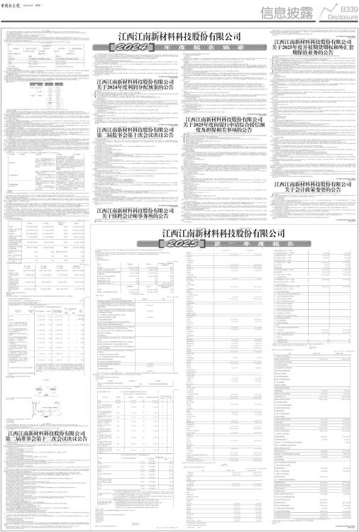 证券代码:603124 证券简称:江南新材 江西江南新材料科技股份有限公司 本公司董事会及全体董事保证本公告内容不存在任何虚假记载、误导性陈述或者重大遗漏,并对其内容的真实性、准确性和完整性承担法律责任。 重要内容提示 公司董事会、监事会及董事、监事、高级管理人员保证季度报告内容的真实、准确、完整,不存在虚假记载、误导性陈述或重大遗漏,并承担个别和连带的法律责任。 公司负责人徐上金、主管会计工作负责人赵一可及会计机构负责人(会计主管人员)钟小芳保证季度报告中财务信息的真实、准确、完整。 第一季度财务报表是否经审计 □是 √否 一、主要财务数据 (一)主要会计数据和财务指标 单位:元 币种:人民币 ■ (二)非经常性损益项目和金额 √适用 □不适用 单位:元 币种:人民币 ■ 对公司将《公开发行证券的公司信息披露解释性公告第1号一一非经常性损益》未列举的项目认定为非经常性损益项目且金额重大的,以及将《公开发行证券的公司信息披露解释性公告第1号一一非经常性损益》中列举的非经常性损益项目界定为经常性损益的项目,应说明原因。 □适用 √不适用 (三)主要会计数据、财务指标发生变动的情况、原因 √适用 □不适用 ■ 二、股东信息 (一)普通股股东总数和表决权恢复的优先股股东数量及前十名股东持股情况表 单位:股 ■ ■ 持股5%以上股东、前10名股东及前10名无限售流通股股东参与转融通业务出借股份情况 □适用 √不适用 前10名股东及前10名无限售流通股股东因转融通出借/归还原因导致较上期发生变化 □适用 √不适用 三、其他提醒事项 需提醒投资者关注的关于公司报告期经营情况的其他重要信息 □适用 √不适用 四、季度财务报表 (一)审计意见类型 □适用 √不适用 (二)财务报表 合并资产负债表 2025年3月31日 编制单位:江西江南新材料科技股份有限公司 单位:元 币种:人民币 审计类型:未经审计 ■ 公司负责人:徐上金主管会计工作负责人:赵一可会计机构负责人:钟小芳 合并利润表 2025年1一3月 编制单位:江西江南新材料科技股份有限公司 单位:元 币种:人民币 审计类型:未经审计 ■ ■ 本期发生同一控制下企业合并的,被合并方在合并前实现的净利润为:0元,上期被合并方实现的净利润为:0 元。 公司负责人:徐上金主管会计工作负责人:赵一可会计机构负责人:钟小芳 合并现金流量表 2025年1一3月 编制单位:江西江南新材料科技股份有限公司 单位:元 币种:人民币 审计类型:未经审计 ■ 公司负责人:徐上金主管会计工作负责人:赵一可会计机构负责人:钟小芳 (三)2025年起首次执行新会计准则或准则解释等涉及调整首次执行当年年初的财务报表 □适用 √不适用 特此公告 江西江南新材料科技股份有限公司董事会 2025年4月27日