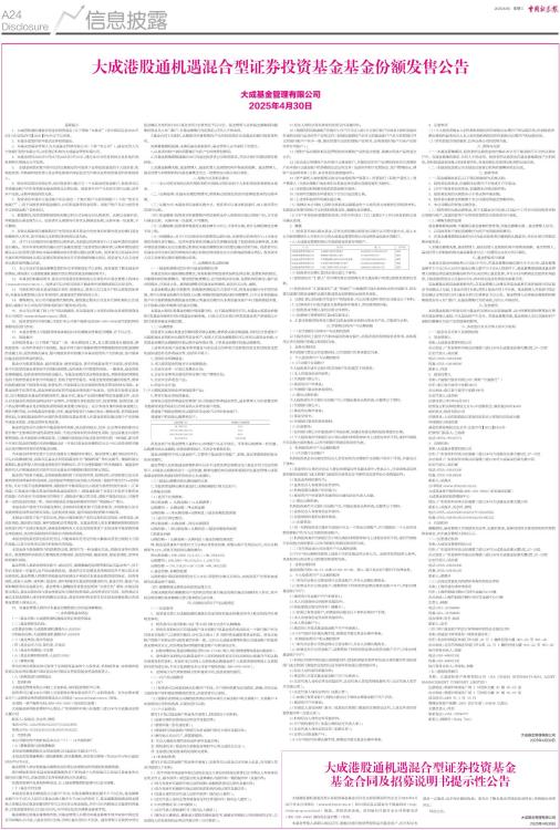 重要提示 1.大成港股通机遇混合型证券投资基金(以下简称“本基金”)经中国证监会2025年4月14日证监许可【2025】794号文予以注册。 2.本基金是契约型开放式证券投资基金。 3.本基金的基金管理人为大成基金管理有限公司(下称“本公司”),基金托管人为宁波银行股份有限公司,注册登记机构为大成基金管理有限公司。 4.本基金将自2025年5月6日至2025年5月16日,通过本公司的直销网点及其他代销机构的代销网点公开发售。 5.本基金销售对象为符合法律法规规定的可投资于证券投资基金的个人投资者、机构投资者、合格境外投资者以及法律法规或中国证监会允许购买证券投资基金的其他投资人。 6.除法律法规另有规定外,每位投资者只能开立一个本基金的基金账户,投资者可以凭该基金账户在所有销售本基金的网点办理认购。投资者在开户当天即可进行认购,但若开户无效,认购申请也同时无效。 7.投资者在申请开立基金账户时应指定一个银行账户为其结算账户(下称“资金交收账户”),用于该投资者的基金赎回、分红和退款等资金结算。该账户的户名应与投资者开立的基金账户名称相同。 8.募集期内,投资者需按销售机构规定的方式全额交付认购款项。认购以金额申请,单笔最低认购金额为1元。投资者在认购期内可多次认购基金份额,认购申请一经受理,不可撤销。 9.有效认购款项在募集期间产生的利息将在基金合同生效后折算为基金份额归基金份额持有人所有,其中利息以注册登记机构的记录为准。 10.对于T日交易时间内受理的认购申请,注册登记机构将在T+1日就申请的有效性进行确认。但对申请有效性的确认仅代表确实接受了投资者的认购申请,认购申请的成功确认应以注册登记机构在本基金募集结束后的登记确认结果为准。投资者可以在基金合同生效后到各销售网点或以其规定的其他合法方式查询最终确认情况。投资者本人应主动查询认购申请的确认结果。 11.本公告仅对本基金募集发售的有关事项和规定予以说明。投资者欲了解本基金详细情况,请阅读《大成港股通机遇混合型证券投资基金招募说明书》。 12.本基金的招募说明书、基金合同及基金份额发售公告将发布在基金管理人的网站(www.dcfund.com.cn)。投资者可以在相关网站下载业务申请表格或相关法律文件。 13.代销机构代销本基金的城市名称、销售网点、联系方式以及开户和认购等具体事项,本基金份额发售公告未有说明的,请查阅该代销机构的公告。 14.募集期内,本公司可能新增代销机构,请留意近期本公司及各代销机构的公告或通知,或拨打本公司及各代销机构的客户服务电话咨询。 15.本公司已开通了网上开户和认购服务,有关基金网上交易的具体业务规则请登录本公司网站(www.dcfund.com.cn)查询。 16.投资者如有任何问题,可拨打本公司客户服务电话400-888-5558或代销机构的客服电话进行咨询。 17.本基金管理人可根据各种具体情况对本次募集安排做适当调整,并予以公告。 18.风险提示 证券投资基金(以下简称“基金”)是一种长期投资工具,其主要功能是分散投资,降低投资单一证券所带来的个别风险。基金不同于银行储蓄和债券等能够提供固定收益预期的金融工具,投资者购买基金,既可能按其持有份额分享基金投资所产生的收益,也可能承担基金投资所带来的损失。 基金分为股票型基金、混合型基金、债券型基金、货币市场基金等不同类型,投资者投资不同类型的基金将获得不同的收益预期,也将承担不同程度的风险。一般来说,基金的收益预期越高,投资者承担的风险也越大。本基金是混合型证券投资基金,预期风险和预期收益高于债券型基金和货币市场基金、但低于股票型基金。本基金投资港股通标的股票,需承担港股通机制下因投资环境、投资标的、市场制度以及交易规则等差异带来的特有风险。本基金投资于证券市场,基金净值会因证券市场波动等因素产生波动。投资者在投资本基金前,应仔细阅读本基金的招募说明书、基金合同、基金产品资料概要等信息披露文件,全面认识本基金的风险收益特征和产品特性,并根据自身的投资目的、投资期限、投资经验、资产状况等判断基金是否和投资者的风险承受能力相适应,充分考虑自身的风险承受能力,理性判断市场,对申购基金的意愿、时机、数量等投资行为做出独立、谨慎决策,获得基金投资收益,亦承担基金投资中出现的各类风险及基金管理人在基金管理实施过程中产生的操作或技术风险、本基金的特有风险等。 基金在投资运作过程中可能面临各种风险,既包括因政治、经济、社会等环境因素对证券价格产生影响而形成的系统性风险、个别证券特有的非系统性风险、也包括基金自身的管理风险、技术风险和合规风险等。巨额赎回风险是开放式基金所特有的一种风险,即当单个开放日基金的净赎回申请份额超过前一开放日基金总份额的百分之十时,投资者将可能无法及时赎回持有的全部基金份额。 当本基金持有特定资产且存在或潜在大额赎回申请时,基金管理人履行相应程序后,可以启动侧袋机制,具体详见基金合同和招募说明书“侧袋机制”等有关章节。侧袋机制实施期间,基金管理人将对基金简称进行特殊标识,并不办理侧袋账户的申购赎回。请基金份额持有人仔细阅读相关内容并关注本基金启用侧袋