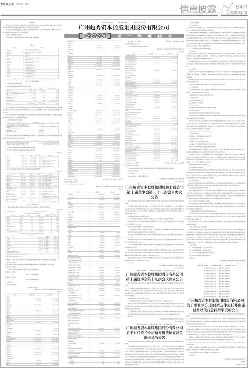 证券代码:000987 证券简称:越秀资本 公告编号:2025-028 重要提示 公司、董事会、监事会及全体董事、监事、高级管理人员保证季度报告的真实、准确、完整,不存在虚假记载、误导性陈述或重大遗漏,并承担个别和连带的法律责任。 公司法定代表人王恕慧先生、主管会计工作负责人吴勇高先生及会计机构负责人潘永兴先生声明:保证季度报告中财务信息的真实、准确、完整。 公司第一季度报告未经审计。 广州越秀资本控股集团股份有限公司2025年第一季度报告 释 义 ■ 注:本报告中,部分合计数与各数据直接加总数在尾数上略有差异,该差异是由四舍五入造成的。 第一节 主要财务数据 一、主要会计数据和财务指标 公司无需追溯调整或重述以前年度会计数据 ■ 注1:本报告期,公司按中国期货业协会制定的《期货风险管理公司大宗商品风险管理业务管理规则》要求,对若干交易业务采用净额法确认收入。如上年同期按同一口径,则营业总收入同比上升12.92%。 注2:本报告期基本每股收益、稀释每股收益按股本扣除回购库存股后的股数计算,上述指标及加权平均净资产收益率均已扣除永续债的影响。 二、非经常性损益项目和金额 ■ 将《公开发行证券的公司信息披露解释性公告第1号一一非经常性损益》中列举的非经常性损益项目界定为经常性损益项目的情况说明: ■ 三、主要会计数据和财务指标发生变动的情况及原因 1、公司资产负债表科目大幅变动的情况及主要原因 单位:元 ■ 2、公司利润表及现金流量表科目大幅变动的情况及主要原因 单位:元 ■ 第二节 股东信息 一、普通股股东总数和表决权恢复的优先股股东数量及前十名股东持股情况表 单位:股 ■ 持股5%以上股东、前10名股东及前10名无限售流通股股东参与转融通业务出借股份情况 □适用 √不适用 前10名股东及前10名无限售流通股股东因转融通出借/归还原因导致较上期发生变化 □适用 √不适用 二、公司优先股股东总数及前10名优先股股东持股情况表 □适用 √不适用 第三节 其他重要事项 □适用 √不适用 第四节 季度财务报表 一、财务报表 1、合并资产负债表 2025年3月31日 编制单位:广州越秀资本控股集团股份有限公司 单位:元 ■ ■ 法定代表人:王恕慧 主管会计工作负责人:吴勇高 会计机构负责人:潘永兴 2、合并年初到报告期末利润表 编制单位:广州越秀资本控股集团股份有限公司 单位:元 ■ 法定代表人:王恕慧 主管会计工作负责人:吴勇高 会计机构负责人:潘永兴 3、合并年初到报告期末现金流量表 编制单位:广州越秀资本控股集团股份有限公司 单位:元 ■ 法定代表人:王恕慧 主管会计工作负责人:吴勇高 会计机构负责人:潘永兴 二、2025年起首次执行新会计准则调整首次执行当年年初财务报表相关项目情况 □适用 √不适用 三、审计报告 公司2025年第一季度报告未经审计。 广州越秀资本控股集团股份有限公司董事会 2025年4月29日 证券代码:000987 证券简称:越秀资本 公告编号:2025-026 广州越秀资本控股集团股份有限公司 第十届董事会第二十三次会议决议公告 本公司及董事会全体成员保证信息披露内容的真实、准确、完整,没有虚假记载、误导性陈述或重大遗漏。 广州越秀资本控股集团股份有限公司(以下简称“公司”)第十届董事会第二十三次会议通知于2025年4月23日以电子邮件方式发出,会议于2025年4月29日以通讯方式召开。本次会议应出席董事11人,实际出席董事11人。会议由董事长王恕慧主持。本次会议的召集和召开程序符合《公司法》和公司《章程》等有关规定。 与会董事经审议表决,形成以下决议: 一、以11票同意、0票反对、0票弃权,审议通过《关于2025年第一季度报告的议案》 报告内容详见公司同日在巨潮资讯网(www.cninfo.com.cn,下同)披露的《2025年第一季度报告》(公告编号:2025-028)。 本议案已经公司董事会审计委员会预审通过。 二、以7票同意、0票反对、0票弃权,审议通过《关于对控股子公司越秀租赁增资暨关联交易的议案》 关联董事王恕慧、杨晓民、李锋、贺玉平回避表决。 本议案已经公司董事会审计委员会、战略与ESG委员会预审通过,独立董事事前召开独立董事专门会议审议同意本事项。 议案内容详见公司同日在巨潮资讯网披露的《关于对控股子公司越秀租赁增资暨关联交易的公告》(公告编号:2025-029)。 三、以11票同意、0票反对、0票弃权,审议通过《关于副董事长、总经理退休离任并由副总经理代行总经理职责的议案》 因到龄退休,杨晓民先生申请辞去公司副董事长、董事、总经理等职务。为保证公司经营管理工作的正常进行,董事会同意杨晓民先生的辞职申请,并同意安排公司副总经理吴勇高先生代行总经理职责,期限自本次董事会审议通过之日起至公司聘任总经理之日止。 具体内容详见公司同日在巨潮资讯网披露的《关于副董事长、总经理退休离任并由副总经理代行总经理职责的公告》(公告编号:2025-030)。 特此公告。 广州越秀资本控股集团股份有限公司董事会 2025年4月29日 证券代码:000987 证券简称:越秀资本 公告编号:2025-027 广州越秀资本控股集团股份有限公司 第十届监事会第十九次会议决议公告 本公司及监事会全体成员保证信息披露内容的真实、准确、完整,没有虚假记载、误导性陈述或重大遗漏。 广州越秀资本控股集