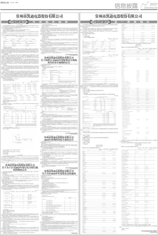 公司代码:605288 公司简称:凯迪股份 常州市凯迪电器股份有限公司 第一节 重要提示 1、本年度报告摘要来自年度报告全文,为全面了解本公司的经营成果、财务状况及未来发展规划,投资者应当到上海证券交易所网站http://www.sse.com.cn网站仔细阅读年度报告全文。 2、本公司董事会、监事会及董事、监事、高级管理人员保证年度报告内容的真实性、准确性、完整性,不存在虚假记载、误导性陈述或重大遗漏,并承担个别和连带的法律责任。 3、公司全体董事出席董事会会议。 4、天健会计师事务所(特殊普通合伙)为本公司出具了标准无保留意见的审计报告。 5、董事会决议通过的本报告期利润分配预案或公积金转增股本预案 经天健会计师事务所(特殊普通合伙)审计确认,截至2024年12月31日,公司母公司报表中期末未分配利润为958,198,953.72元。 经董事会决议,公司2024年年度拟以实施权益分派股权登记日登记的总股本为基数分配利润。本次利润分配方案如下: 公司拟向全体股东每10股派发现金股利3.75元(含税)。截至本公告日,公司总股本为70,198,912股,以70,198,912股为基数计算,合计拟派发现金红利26,324,592.00元(含税)。本年度公司现金分红的比例为30.36%。 第二节 公司基本情况 1、公司简介 ■ ■ 2、报告期公司主要业务简介 (1)智能家居行业市场情况 在全球家具贸易格局中,美国市场始终占据核心地位。美国市场不仅规模庞大、消费能力强,而且渠道成熟、品牌集 中度高,是全球家具品牌和供应商争相布局的关键市场。尤其是在中高端和功能型家具领域,美国消费者对产品的智能化、 舒适性与环保性要求不断提升,推动了整个供应链向高附加值方向演进。电动沙发行业正处于从功能化向智能化场景化转型的关键阶段,面临成本、兼容性等挑战,但在老龄化社会、消费升级及智能家居生态推动下,市场增长空间广阔。作为智能家居产品核心零部件,线性驱动器技术在国内基本趋于稳定,制造厂商逐步增多,竞争更加激烈,市场份额集中度降低。 (2)智能办公桌 近年来随着远程办公、居家办公普及、健康办公需求上升以及物联网技术渗透,市场规模快速扩张,预计到2030年将以 12-15%的年复合增长率增长至 100-120亿美元。市场的增速主要驱动因素源自1)混合办公、家庭办公场景需求增加,2)企业对员工健康投入增加,3)健康办公意识觉醒,4)电机、传感等模块技术成熟、成本下降,5)政策推动。但中国仍存在对智能办公桌认知度低,倾向于传统办公家具,以及消费升级必要性存疑。长期来看,随着远程办公深化、健康需求刚性化及技术进步,市场增长潜力巨大。 随着人们对健康和舒适工作环境的重视程度不断提高,长时间久坐办公导致的健康问题日益受到关注,电动升降桌可帮助用户在坐姿和站姿之间切换,缓解身体不适,符合现代人追求健康生活的趋势,越来越多的企业和个人开始关注办公家具的舒适性和健康性,这为电动升降桌市场带来了广阔的发展空间。其次,电动升降桌的应用领域逐渐扩大,除了传统的办公场所外,还广泛应用于家庭、学校、电竞场所、医疗场所及公共场所等。得益于健康办公意识普及,国内市场加速渗透,尤其是 Z 世代成为消费主力,带动家庭场景需求。中国品牌在海外市场表现突出,部分企业正在推进海外生产基地建设以完善全球布局。全球智慧办公产品整体渗透率不断提升,但仍处于偏低阶段,行业处于成长期。 (3)医疗养护 医疗养护涵盖疾病预防、康复护理、慢性病管理、长期照护等全生命周期健康服务。随着全球人口结构变化加剧(全球65岁以上人口占比将从2023年的10%上升至2050年的16%)、慢性病负担加重及健康消费升级,此类产品刚性需求加大。同步中国养老政策体系的完善及服务场景的从医院养护逐步推广至机构养护、社区居家养护,也使得电动医疗床、疗养所护理床、家庭护理床、病人移位器、升降诊察台、治疗椅、轮椅、电动洗澡椅等产品被社会广泛认知并接受,市场需求增加。 (4)汽车零部件 中国汽车工业协会发的的数据显示,2024年,汽车产销量累计完成3128.2万辆和3143.6万辆,同比分别增长3.7%和4.5%,2024年乘用车产销量分别为2747.7万辆和2756.3万辆,同比分别增长5.2%和5.8%。汽车电动尾门作为提升车辆智能化与用户体验的重要配置,近年来随着消费升级、新能源车渗透率提升及供应链技术成熟,市场规模持续扩大。同时消费者对于便利性,科技配置属性偏好增强,新能源厂商智能化竞争加剧,供应链成本下降使得汽车电动尾门市场逐步进入整车标配转型的关键期,技术迭代能力与成本控制是制造厂商的竞争核心。 公司作为全球知名的以智能线性驱动系统为核心产品的机电一体化整体解决方案提供商,公司形成了集技术研发、生产制造、全球营销于一体的全流程服务体系,完成了智能家居、智慧办公、汽车零部件、医疗养护等不同应用场景的业务布局,同时依靠企业长期以来在零部件研发自制能力,通过电机、电控、减速传动等部件的研发重组,逐步开拓工业传动、机器人等领域。 报告期内,公司主营业务和主要产品未发生变化。 3、公司主要会计数据和财务指标 3.1近3年的主要会计数据和财务指标 单位:元 币种:人民币 ■ 3.2报告期分季度的主要会计数据 单位:元 币种:人民币 ■ 季度数据与已披露定期报告数据差异说明 □适用 √不适用 4