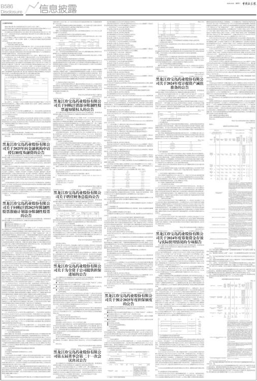 (每股分配比例:每10股派发现金红利人民币1.50元(含税)。 (本次利润分配以实施权益分派股权登记日登记的总股本扣除回购专户上已回购股份后的股数为基数,具体日期将在权益分派实施公告中明确。 (在实施权益分派的股权登记日前,黑龙江珍宝岛药业股份有限公司(以下简称“公司”)总股本发生变动的,拟维持每股分配比例不变,相应调整分配总额,并将在相关公告中披露。 (公司不触及《上海证券交易所股票上市规则(2025年4月修订)》(以下简称“《股票上市规则》”)第9.8.1条第一款第(八)项规定的可能被实施其他风险警示的情形。 一、利润分配方案的主要内容 (一)利润分配方案的具体内容 经中审亚太会计师事务所(特殊普通合伙)审计,公司2024年度合并报表实现归属于上市公司股东的净利润438,216,195.63元。截至2024年12月31日母公司资产负债表中期末未分配利润为4,020,895,149.13元。经董事会决议,公司2024年年度拟以实施权益分派股权登记日登记的总股本扣除回购专户上已回购股份后的股数为基数分配利润。本次利润分配方案如下: 公司拟向全体股东每10股派发现金红利1.50元(含税)。截至2024年12月31日,公司总股本941,140,609股,根据《上海证券交易所上市公司自律监管指引第7号一一回购股份》等规定,上市公司回购专户中的股份不享有利润分配权利,公司通过回购专户持有的137,232股公司股份不参与本次利润分配,公司拟在实施权益分派的股权登记日前对离职的3名股权激励对象合计持有的144,094股公司股份进行回购注销。以此计算,拟参与本次权益分派的股份数量为940,859,283股,合计拟派发现金红利141,128,892.45元(含税),占合并报表中归属于上市公司股东净利润的比例为32.21%。本次利润分配不送红股,也不以公积金转增股本。 如在本公告披露之日起至实施权益分派股权登记日期间,因可转债转股、回购股份、股权激励授予股份回购注销、重大资产重组股份回购注销等致使公司总股本发生变动的,公司拟维持每股分配比例不变,相应调整分配总额。 本次利润分配方案尚需提交公司2024年年度股东大会审议。 (二)公司利润分配不触及其他风险警示情形的说明 ■ 如上表所示,公司最近三个会计年度累计现金分红总额高于最近三个会计年度年均净利润的30%,不触及《股票上市规则》第9.8.1条第一款第(八)项规定的可能被实施其他风险警示的情形。 二、公司履行的决策程序 (一)审议和表决情况 公司于2025年4月29日召开第五届董事会第二十一次会议和第五届监事会第十七次会议,审议通过了《2024年度利润分配预案》,并同意将本议案提交公司2024年年度股东大会审议。 (二)监事会意见 公司2024年度利润分配方案符合有关法律法规、规范性文件和《公司章程》的规定,充分考虑了公司目前财务状况、现金流状况、盈利能力及公司和全体股东的即期利益与长远利益,审议程序合法合规,不存在损害公司及中小股东利益的情形。同意将该议案提交至公司股东大会审议。 三、相关风险提示 (一)《2024年度利润分配预案》综合考虑了未来资金需求、现金流状况和持续回报股东等因素,不会对公司经营现金流产生重大不利影响,不会影响公司正常经营及长期稳定发展。 (二)《2024年度利润分配预案》尚需提交公司2024年年度股东大会审议批准后方可实施。请投资者理性判断,并注意投资风险。 特此公告。 黑龙江珍宝岛药业股份有限公司董事会 2025年4月30日 证券代码:603567 证券简称:珍宝岛 公告编号:临2025-025 黑龙江珍宝岛药业股份有限公司关于2025年向金融机构申请授信额度及融资的公告 本公司董事会及全体董事保证本公告内容不存在任何虚假记载、误导性陈述或者重大遗漏,并对其内容的真实性、准确性和完整性承担法律责任。 黑龙江珍宝岛药业股份有限公司(以下简称“公司”)于2025年4月29日召开第五届董事会第二十一次会议,审议并通过了《关于2025年向金融机构申请授信额度及融资的议案》,该议案尚需提请公司2024年年度股东大会审议。现将议案相关事项公告如下: 根据公司2025年经营计划,2025年度公司及子公司拟向各金融机构(中国工商银行、中国建设银行、中国农业银行、中国银行、中国进出口银行、国家开发银行、中国农业发展银行、民生银行、兴业银行、浦发银行、中国邮政储蓄银行、招商银行、光大银行、交通银行、广发银行、中信银行、平安银行、华夏银行、徽商银行、亳州药都农村商业银行、黑龙江省农村信用社、龙江银行、锦州银行、贵阳银行、贵阳农村商业银行等)申请办理授信,额度不超过人民币90亿元,在各行授信额度内办理融资业务。融资项目主要为流动资金借款、固定资产项目借款、并购贷款、供应链业务、委托贷款、银行汇票、贴现、信用证、保函、贸易融资及资金业务等银行各类融资业务。 上述授信额度将主要用于公司及子公司2025年生产经营配套资金,包括购买原材料、生产资金、项目资金及补充流动资金需求等事项,授信额度内融资有效期根据与银行合同约定有效期而定。 具体由董事会提请股东大会授权公司总经理根据实际生产经营情况实施,在上述额度内有计划地开展与各金融机构之间的融资业务。公司董事会不再就每笔业务出具单独的董事会决议,本授权有效期自公司2024年年度股东大会审议通过之日起至下一年