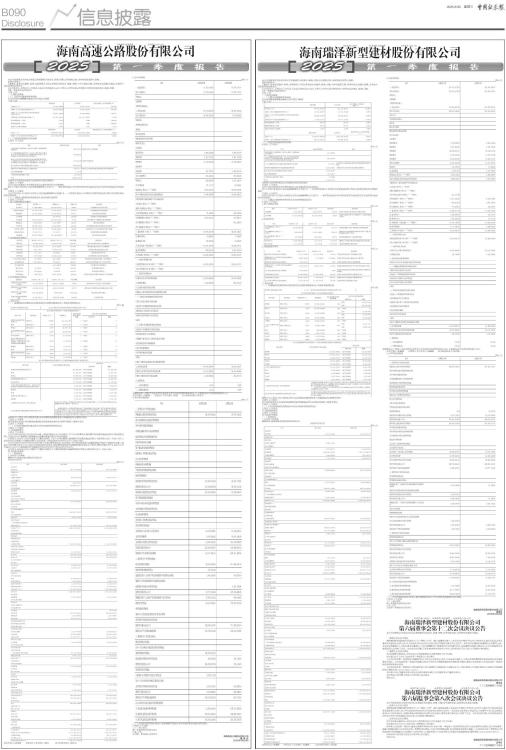 证券代码:002596 证券简称:海南瑞泽 公告编号:2025-024 海南瑞泽新型建材股份有限公司 本公司及董事会全体成员保证信息披露的内容真实、准确、完整,没有虚假记载、误导性陈述或重大遗漏。 重要内容提示: 1.董事会、监事会及董事、监事、高级管理人员保证季度报告的真实、准确、完整,不存在虚假记载、误导性陈述或重大遗漏,并承担个别和连带的法律责任。 2.公司负责人、主管会计工作负责人及会计机构负责人(会计主管人员)声明:保证季度报告中财务信息的真实、准确、完整。 3.第一季度报告是否经审计 □是 √否 一、主要财务数据 (一) 主要会计数据和财务指标 公司是否需追溯调整或重述以前年度会计数据 □是 √否 ■ (二) 非经常性损益项目和金额 √适用 □不适用 单位:元 ■ 其他符合非经常性损益定义的损益项目的具体情况 □适用 √不适用 公司不存在其他符合非经常性损益定义的损益项目的具体情况。 将《公开发行证券的公司信息披露解释性公告第1号一一非经常性损益》中列举的非经常性损益项目界定为经常性损益项目的情况说明 □适用 √不适用 公司不存在将《公开发行证券的公司信息披露解释性公告第1号一一非经常性损益》中列举的非经常性损益项目界定为经常性损益的项目的情形。 (三) 主要会计数据和财务指标发生变动的情况及原因 √适用 □不适用 1、资产负债表项目 单位:元 ■ 2、利润表项目 单位:元 ■ 3、现金流量表项目 单位:元 ■ 二、股东信息 (一) 普通股股东总数和表决权恢复的优先股股东数量及前十名股东持股情况表 单位:股 ■ 持股5%以上股东、前10名股东及前10名无限售流通股股东参与转融通业务出借股份情况 □适用 √不适用 前10名股东及前10名无限售流通股股东因转融通出借/归还原因导致较上期发生变化 □适用 √不适用 (二) 公司优先股股东总数及前10名优先股股东持股情况表 □适用 √不适用 三、其他重要事项 □适用 √不适用 四、季度财务报表 (一) 财务报表 1、合并资产负债表 编制单位:海南瑞泽新型建材股份有限公司 2025年03月31日 单位:元 ■ 法定代表人:张灏铿 主管会计工作负责人:张灏铿 会计机构负责人:张贵阳 2、合并利润表 单位:元 ■ 本期发生同一控制下企业合并的,被合并方在合并前实现的净利润为:0元,上期被合并方实现的净利润为:0元。 法定代表人:张灏铿 主管会计工作负责人:张灏铿 会计机构负责人:张贵阳 3、合并现金流量表 单位:元 ■ (二) 2025年起首次执行新会计准则调整首次执行当年年初财务报表相关项目情况 □适用 √不适用 (三) 审计报告 第一季度报告是否经过审计 □是 √否 公司第一季度报告未经审计。 海南瑞泽新型建材股份有限公司 董事会 2025年4月29日 证券代码:002596 证券简称:海南瑞泽 公告编号:2025-025 海南瑞泽新型建材股份有限公司 第六届董事会第十二次会议决议公告 本公司及董事会全体成员保证信息披露的内容真实、准确、完整,没有虚假记载、误导性陈述或重大遗漏。 一、董事会会议召开情况 海南瑞泽新型建材股份有限公司(以下简称“公司”)第六届董事会第十二次会议召开通知于2025年4月24日以通讯方式送达各位董事及其他相关出席人员,并于2025年4月29日在公司会议室以现场结合通讯的方式召开。本次会议由董事长张灏铿先生召集并主持,会议应出席董事9人,实际出席会议董事9人,其中张灏铿先生、陈健富先生采用通讯表决,其他董事均现场出席会议,公司全体监事以及高级管理人员列席了会议。本次会议的召集、召开和表决程序均符合《中华人民共和国公司法》及《公司章程》等的规定。 二、董事会会议审议情况 经与会董事认真审议,本次会议以记名投票表决方式表决通过了以下议案: 审议通过《关于公司〈2025年第一季度报告〉的议案》 《公司2025年第一季度报告》的编制符合《中华人民共和国公司法》《企业会计准则》、中国证券监督管理委员会和深圳证券交易所等有关规定。公司2025年第一季度报告编制过程中不存在由于舞弊或错误而导致的重大错报,能够公允地反映公司2025年第一季度实际经营成果和财务状况。 《公司2025年第一季度报告》的具体内容于同日披露在《证券时报》《证券日报》《上海证券报》《中国证券报》以及指定信息披露网站巨潮资讯网(www.cninfo.com.cn)。 本议案已经公司董事会审计委员会全票同意审议通过,并同意提交公司董事会审议。 表决情况:9票同意,0票反对,0票弃权,表决通过。 特此公告。 海南瑞泽新型建材股份有限公司 董事会 二○二五年四月二十九日 证券代码:002596 证券简称:海南瑞泽 公告编号:2025-026 海南瑞泽新型建材股份有限公司 第六届监事会第八次会议决议公告 本公司及监事会全体成员保证信息披露的内容真实、准确、完整,没有虚假记载、误导性陈述或重大遗漏。 一、监事会会议召开情况 海南瑞泽新型建材股份有限公司(以下简称“公司”)第六届监事会第八次会议召开通知于2025年4月24日以通讯方式送达各位监事及其他相关出席人员,并于2025年4月29日在公司会议室以现场方式召开。本次会议由监事会主席吴芳女士召集并主持,会议应参加监事5名,实到监事5名,全体监事通过现场表决方式参与会议表决,董事会秘书秦庆女士列席了会议。本次会议的召集、召开和表