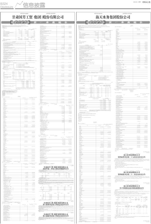 证券代码:603759 证券简称:海天股份 本公司董事会及全体董事保证本公告内容不存在任何虚假记载、误导性陈述或者重大遗漏,并对其内容的真实性、准确性和完整性承担法律责任。 重要内容提示 公司董事会、监事会及董事、监事、高级管理人员保证季度报告内容的真实、准确、完整,不存在虚假记载、误导性陈述或重大遗漏,并承担个别和连带的法律责任。 公司负责人、主管会计工作负责人及会计机构负责人(会计主管人员)保证季度报告中财务信息的真实、准确、完整。 第一季度财务报表是否经审计 □是 √否 一、主要财务数据 (一)主要会计数据和财务指标 单位:元 币种:人民币 ■ (二)非经常性损益项目和金额 √适用 □不适用 单位:元 币种:人民币 ■ 对公司将《公开发行证券的公司信息披露解释性公告第1号一一非经常性损益》未列举的项目认定为非经常性损益项目且金额重大的,以及将《公开发行证券的公司信息披露解释性公告第1号一一非经常性损益》中列举的非经常性损益项目界定为经常性损益的项目,应说明原因。 □适用 √不适用 (三)主要会计数据、财务指标发生变动的情况、原因 √适用 □不适用 ■ 二、股东信息 (一)普通股股东总数和表决权恢复的优先股股东数量及前十名股东持股情况表 单位:股 ■ 持股5%以上股东、前10名股东及前10名无限售流通股股东参与转融通业务出借股份情况 □适用 √不适用 前10名股东及前10名无限售流通股股东因转融通出借/归还原因导致较上期发生变化 □适用 √不适用 三、其他提醒事项 需提醒投资者关注的关于公司报告期经营情况的其他重要信息 □适用 √不适用 四、季度财务报表 (一)审计意见类型 □适用 √不适用 (二)财务报表 合并资产负债表 2025年3月31日 编制单位:海天水务集团股份公司 单位:元 币种:人民币 审计类型:未经审计 ■ 公司负责人:费俊杰 主管会计工作负责人:刘华 会计机构负责人:李杏 合并利润表 2025年1一3月 编制单位:海天水务集团股份公司 单位:元 币种:人民币 审计类型:未经审计 ■ 本期发生同一控制下企业合并的,被合并方在合并前实现的净利润为:0元,上期被合并方实现的净利润为:0 元。 公司负责人:费俊杰 主管会计工作负责人:刘华 会计机构负责人:李杏 合并现金流量表 2025年1一3月 编制单位:海天水务集团股份公司 单位:元 币种:人民币 审计类型:未经审计 ■ 公司负责人:费俊杰 主管会计工作负责人:刘华 会计机构负责人:李杏 (三)2025年起首次执行新会计准则或准则解释等涉及调整首次执行当年年初的财务报表 □适用 √不适用 特此公告 海天水务集团股份公司董事会 2025年4月30日 证券代码:603759 证券简称:海天股份 公告编号:2025-065 海天水务集团股份公司 第四届董事会第二十七次会议决议公告 本公司董事会及全体董事保证本公告内容不存在任何虚假记载、误导性陈述或者重大遗漏,并对其内容的真实性、准确性和完整性承担法律责任。 海天水务集团股份公司(下称“公司”)于2025年4月29日上午10:00在公司五楼会议室以现场结合通讯的表决方式召开第四届董事会第二十七次会议。会议通知于2025年4月25日通过书面及电子邮件方式送达至所有董事和监事。本次会议由董事长张霞主持,会议应出席董事9人,实际出席董事9人。公司监事和高级管理人员列席会议。会议的召集、召开符合《公司法》等有关法律、行政法规、部门规章、规范性文件和《公司章程》的规定。出席会议的董事审议并以记名方式投票表决通过了如下议案: 一、审议通过了《2025年第一季度报告》 表决结果:9票同意,0票反对,0票弃权,0票回避。 公司2025年第一季度报告已经通过董事会审计委员会审议。 具体内容详见同日在上海证券交易所网站(www.sse.com.cn)披露的《海天水务集团股份公司2025年第一季度报告》。 二、审议通过了《2024年度环境、社会及公司治理(ESG)报告》 表决结果:9票同意,0票反对,0票弃权,0票回避。 具体内容详见同日在上海证券交易所网站(www.sse.com.cn)披露的《海天水务集团股份公司2024年度环境、社会及公司治理(ESG)报告》。 特此公告。 海天水务集团股份公司董事会 2025年4月30日 证券代码:603759 证券简称:海天股份 公告编号:2025-066 海天水务集团股份公司 第四届监事会第二十二次会议决议公告 本公司监事会及全体监事保证本公告内容不存在任何虚假记载、误导性陈述或者重大遗漏,并对其内容的真实性、准确性和完整性承担法律责任。 海天水务集团股份公司(下称“公司”)于2025年4月29日上午9:30在公司五楼会议室以现场结合通讯的表决方式召开第四届监事会第二十二次会议。会议通知于2025年4月25日通过书面及电子邮件方式送达至所有监事。本次会议由监事会主席费伟主持,会议应出席监事3人,实际出席监事3人。公司部分高级管理人员列席会议。会议的召集、召开符合《公司法》等有关法律、行政法规、部门规章、规范性文件和《公司章程》的规定。出席会议的监事审议并以记名方式投票表决了如下议案: 一、审议通过了《2025年第一季度报告》 表决结果:3票同意,0票反对,0票弃权,0票回避。 具体内容详见同日在上海证券交易所网站(www.sse.com.cn)披露的《海天水务集团股份公司2025年第一季度报告》。 特此公告。 海天水务集团股份公司监事会 2025年4月