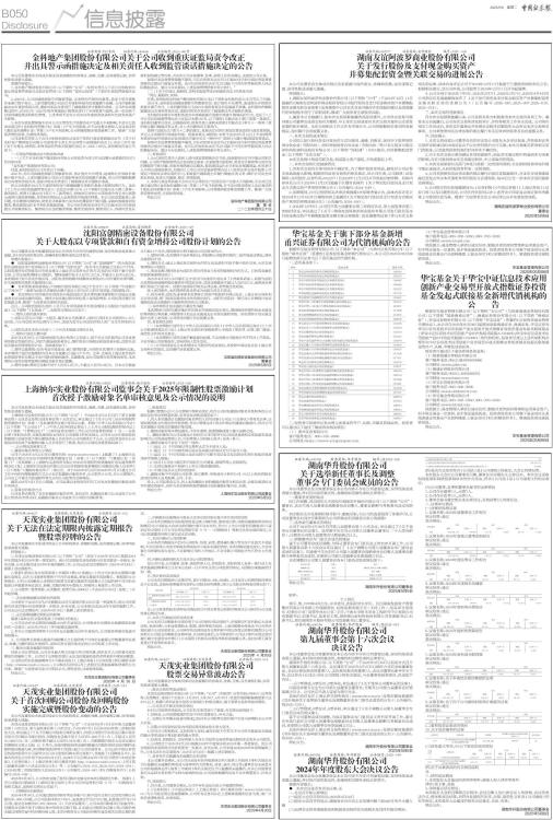 证券代码:600156 股票简称:华升股份 编号:临2025-020 湖南华升股份有限公司 关于选举新任董事长及调整 董事会专门委员会成员的公告 本公司董事会及全体董事保证本公告内容不存在任何虚假记载、误导性陈述或者重大遗漏,并对其内容的真实性、准确性和完整性承担法律责任。 一、董事长变更的情况 因工作调整,刘志刚先生不再担任湖南华升股份有限公司(以下简称“公司”)董事长、法定代表人及董事会战略委员会召集人、董事会薪酬与考核委员会成员职务。 刘志刚先生在任职期间恪尽职守、勤勉尽职,为公司的发展发挥了积极作用,公司及董事会对其在任职期间为公司所做出的贡献表示衷心的感谢! 二、选举新任董事长的情况 公司于2025年4月30日召开第九届董事会第十六次会议,审议通过了《关于选举公司董事长的议案》,选举谢平先生为公司第九届董事会董事长(个人简历附后),任期至公司第九届董事会任期届满之日止。 三、调整董事会专门委员会成员的情况 鉴于公司董事会成员调整,为保证董事会专门委员会正常有序开展工作,公司第九届董事会第十六次会议审议通过了《关于调整公司第九届董事会专门委员会成员的议案》,同意谢平先生担任公司第九届董事会战略委员会召集人及董事会薪酬与考核委员会成员,任期至公司第九届董事会任期届满之日止。 本次调整后公司第九届董事会各专门委员会组成情况如下: ■ 特此公告。 湖南华升股份有限公司董事会 2025年5月6日 附件: 个人简历 谢平,男,1979年4月出生,中共党员,在职研究生学历。历任湖南发展资产管理集团有限公司党群工作部副部长、纪检监察室副主任(主持工作)、纪监审计部部长、纪委办公室(监察专员办公室)主任,中南大学粉末冶金工程研究中心有限公司党委副书记、纪委书记、监事会主席,湖南博云新材料股份有限公司党委副书记、纪委书记,现任湖南华升股份有限公司党委副书记、董事长。 证券代码:600156 股票简称:华升股份 编号:临2025-019 湖南华升股份有限公司 第九届董事会第十六次会议 决议公告 本公司董事会及全体董事保证本公告内容不存在任何虚假记载、误导性陈述或者重大遗漏,并对其内容的真实性、准确性和完整性承担法律责任。 湖南华升股份有限公司(以下简称“公司”)于2025年4月30日以现场方式召开第九届董事会第十六次会议,会议通知于2025年4月27日以邮件方式向全体董事发出。会议应参加表决的董事7人,实际参加表决的董事7人,会议由董事长谢平先生主持,会议符合《公司法》和《公司章程》的有关规定,与会董事经投票表决,形成如下决议: 一、以7票赞成,0票反对,0票弃权,审议通过了《关于选举公司董事长的议案》。 同意选举谢平先生为公司第九届董事会董事长,任期至公司第九届董事会任期届满之日止。公司法定代表人变更为谢平先生。 具体内容详见在上海证券交易所网站(www.sse.com.cn)及指定媒体披露的《华升股份关于选举新任董事长及调整董事会专门委员会成员的公告》(公告编号:临2025-020)。 二、以7票赞成,0票反对,0票弃权,审议通过了《关于调整公司第九届董事会专门委员会成员的议案》。 鉴于公司董事会成员调整,为保证董事会专门委员会正常有序开展工作,谢平先生即日起任公司第九届董事会战略委员会召集人及董事会薪酬与考核委员会成员,任期至公司第九届董事会任期届满之日止。 具体内容详见在上海证券交易所网站(www.sse.com.cn)及指定媒体披露的《华升股份关于选举新任董事长及调整董事会专门委员会成员的公告》(公告编号:临2025-020)。 特此公告。 湖南华升股份有限公司董事会 2025年5月6日 证券代码:600156 证券简称:华升股份 公告编号:2025-018 湖南华升股份有限公司 2024年年度股东大会决议公告 本公司董事会及全体董事保证本公告内容不存在任何虚假记载、误导性陈述或者重大遗漏,并对其内容的真实性、准确性和完整性承担法律责任。 重要内容提示: ● 本次会议是否有否决议案:无 一、会议召开和出席情况 (一)股东大会召开的时间:2025年4月30日 (二)股东大会召开的地点:湖南省长沙市天心区芙蓉中路三段420号华升大厦九楼 (三)出席会议的普通股股东和恢复表决权的优先股股东及其持有股份情况: ■ (四)表决方式是否符合《公司法》及《公司章程》的规定,大会主持情况等。 本次股东大会由公司董事会召集,董事长刘志刚先生主持召开。本次会议采取现场投票和网络投票相结合的方式表决,符合《公司法》及《公司章程》的相关规定。 (五)公司董事、监事和董事会秘书的出席情况 1、公司在任董事7人,出席7人。 2、公司在任监事3人,出席3人。 3、董事会秘书蒋宏凯先生出席会议,其他高管2人列席会议。 二、议案审议情况 (一)非累积投票议案 1、议案名称:2024年度董事会工作报告 审议结果:通过 表决情况: ■ 2、议案名称:2024年度独立董事述职报告 审议结果:通过 表决情况: ■ 3、议案名称:2024年度监事会工作报告 审议结果:通过 表决情况: ■ 4、议案名称:2024年年度报告及摘要 审议结果:通过 表决情况: ■ 5、议案名称:2024年度财务决算报告 审议结果:通过 表决情况: ■ 6、议案名称:2025年度财务预算报告 审议结果:通过 表决情况: ■ 7、议案名称:2024年度利润分配预案 审议结果:通过 表决情况: ■ 8、议案名称: