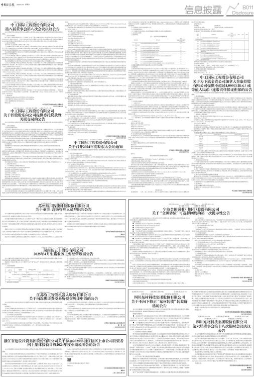 证券代码:002051 证券简称:中工国际 公告编号:2025-023 中工国际工程股份有限公司 第八届董事会第八次会议决议公告 本公司及董事会全体成员保证信息披露的内容真实、准确、完整,没有虚假记载、误导性陈述或重大遗漏。 一、会议召开情况 中工国际工程股份有限公司(以下简称“公司”)第八届董事会第八次会议通知于2025年4月30日以专人送达、邮件形式发出。会议于2025年5月9日以通讯方式召开,应出席董事八名,实际出席董事八名,出席会议的董事占董事总数的100%,符合《中华人民共和国公司法》和《公司章程》的规定。 二、会议审议情况 本次会议以记名投票方式审议了如下决议: 1、关联董事王博、李海欣、赵立志、张格领、王强回避表决,会议以3票同意,0票反对,0票弃权,审议通过了《关于控股股东向公司提供委托贷款暨关联交易的议案》。有关内容详见同日公司在《中国证券报》《证券时报》及巨潮资讯网(http://www.cninfo.com.cn)刊登的2025-024号公告。 本议案经独立董事专门会议2025年第四次会议和董事会审计委员会2025年第五次工作会议审议通过后提交公司董事会审议。 2、会议以8票同意,0票反对,0票弃权,审议通过了《关于为下属全资公司加拿大普康控股有限公司提供不超过4,000万加元(或等值人民币)连带责任保证担保的议案》。有关内容详见同日公司在《中国证券报》《证券时报》及巨潮资讯网(http://www.cninfo.com.cn)刊登的2025-025号公告。 本议案经董事会审计委员会2025年第五次工作会议审议通过后提交公司董事会审议。 3、会议以8票同意,0票反对,0票弃权,审议通过了《关于修订〈中工国际工程股份有限公司董事会授权管理制度〉的议案》。修订后的《中工国际工程股份有限公司董事会授权管理制度》全文见巨潮资讯网(http://www.cninfo.com.cn)。 4、会议以8票同意,0票反对,0票弃权,审议通过了《关于修订〈中工国际工程股份有限公司董事会秘书工作细则〉的议案》。修订后的《中工国际工程股份有限公司董事会秘书工作细则》全文见巨潮资讯网(http://www.cninfo.com.cn)。 5、会议以8票同意,0票反对,0票弃权,审议通过了《关于修订〈中工国际工程股份有限公司投资者关系管理制度〉的议案》。修订后的《中工国际工程股份有限公司投资者关系管理制度》全文见巨潮资讯网(http://www.cninfo.com.cn)。 6、会议以8票同意,0票反对,0票弃权,审议通过了《关于修订〈中工国际工程股份有限公司独立董事年报工作制度〉的议案》。修订后的《中工国际工程股份有限公司独立董事年报工作制度》全文见巨潮资讯网(http://www.cninfo.com.cn)。 7、会议以8票同意,0票反对,0票弃权,审议通过了《关于修订〈中工国际工程股份有限公司审计委员会年报工作制度〉的议案》。修订后的《中工国际工程股份有限公司审计委员会年报工作制度》全文见巨潮资讯网(http://www.cninfo.com.cn)。 8、会议以8票同意,0票反对,0票弃权,审议通过了《关于召开2024年度股东大会的议案》。有关内容详见同日公司在《中国证券报》《证券时报》及巨潮资讯网(http://www.cninfo.com.cn)刊登的2025-026号公告。 三、备查文件 1、董事会审计委员会2025年第五次工作会议决议; 2、独立董事专门会议2025年第四次会议审核意见; 3、第八届董事会第八次会议决议。 特此公告。 中工国际工程股份有限公司董事会 2025年5月10日 证券代码:002051 证券简称:中工国际 公告编号:2025-024 中工国际工程股份有限公司 关于控股股东向公司提供委托贷款暨关联交易的公告 本公司及董事会全体成员保证信息披露的内容真实、准确、完整,没有虚假记载、误导性陈述或重大遗漏。 一、关联交易概述 1、委托贷款基本情况 中工国际工程股份有限公司(以下称公司)控股股东中国机械工业集团有限公司(以下称国机集团)拟以委托贷款方式向公司拨付国有资本经营预算资金,根据《中央企业国有资本经营预算支出执行监督管理暂行办法》(国资发资本规[2019]92号)的相关规定,中央企业通过子企业实施资本预算支持事项,采取向实施主体子企业增资方式使用资本预算资金的,应当及时落实国有资本权益,子企业暂无增资计划的,可列作委托贷款(期限一般不超过3年),在具备条件时及时转为增资。 为满足国有资本经营预算资金的使用要求,公司拟接受控股股东国机集团通过国机财务有限责任公司(以下简称国机财务)以委托贷款方式拨付国有资本经营预算资金总计28,508万元,贷款期限为自合同签订之日起三年,贷款年利率2.34%。该笔资金将在具备条件时转为国机集团对公司的增资。 2、关联关系 国机集团为公司控股股东,国机财务为国机集团控制的公司,因此,本次委托贷款构成关联交易。 3、审议程序 公司于2025年5月9日召开第八届董事会第八次会议审议通过了《关于控股股东向公司提供委托贷款暨关联交易的议案》,关联董事王博、李海欣、赵立志、张格领、王强回避了本议案的表决。该议案在提交董事会前,已经公司独立董事专门会议2025年第四次会议和董事会审计委员会2025年第五次工作会议审议通过。 本次关联交易金额及连续十二个月内累计发生的关联交易金额未超过公司最近一期经审计净资产的5%,根据《深圳证券交易所股票上市规则》和《公司章程》的规定,本次交易在董事会权限范围之内,无需提交股东大会审议。 本次关