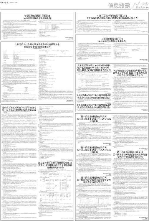 为保护基金份额持有人的利益,保障基金平稳运作,根据各基金合同等法律文件相关规定、境外主要投资市场节假日安排,招商基金管理有限公司(以下简称“本公司”)旗下部分基金因2025年5月26日为境外主要投资市场节假日将暂停申购、赎回、转换、定期定额投资业务,并于2025年5月27日恢复办理上述业务,届时将不再另行公告。 一、适用基金范围 ■ 二、重要提示 1.各基金是否已开放申购、赎回、转换与定期定额投资业务,详见本公司发布的相关公告。 2.本公告主要为基金因境外主要投资市场节假日暂停及后续恢复相关业务的公告,各基金如因其他原因已暂停申购、赎回、转换、定期定额投资、大额申购、大额转换转入业务或有其他交易状态限制的,本次恢复后仍受相关交易状态限制,具体业务办理以相关公告为准。 3.若境外主要投资市场节假日安排发生变化,本公司将进行相应调整并公告。 4.如有疑问,请拨打客户服务热线:400-887-9555(免长途话费),或登陆网站www.cmfchina.com获取相关信息。 特此公告。 招商基金管理有限公司 2025年5月22日 关于招商中证卫星产业交易型开放式指数证券投资基金流动性服务商的公告 为促进招商中证卫星产业交易型开放式指数证券投资基金(以下简称“招商中证卫星产业ETF”)的市场流动性和平稳运行,根据《深圳证券交易所证券投资基金业务指引第2号一一流动性服务》等有关规定,自2025年5月22日起,本公司选定申万宏源证券有限公司、方正证券股份有限公司、广发证券股份有限公司、招商证券股份有限公司、中信证券股份有限公司为招商中证卫星产业ETF(159218)的流动性服务商。 特此公告。 招商基金管理有限公司 2025年5月22日 关于招商中证卫星产业交易型开放式指数证券投资基金上市交易提示性公告 招商中证卫星产业交易型开放式指数证券投资基金(以下简称“本基金)于2025年5月22日开始在深圳证券交易所上市交易,场内简称:卫星产业ETF,代码:159218。上市首日以该基金份额参考净值1.0056元为开盘参考价。 截至2025年5月21日,本基金投资于标的指数成份股和备选成份股的资产比例为基金资产净值的97.59%,投资组合比例符合有关法律法规、部门规章、规范性文件的规定和基金合同的有关约定。 投资者可拨打基金管理人客户服务电话400-887-9555(免长途话费)或登录网站www.cmfchina.com咨询、了解相关情况。 风险提示:基金管理人承诺以诚实信用、勤勉尽责的原则管理和运用基金资产,但不保证基金一定盈利,也不保证最低收益。敬请投资人注意投资风险。 特此公告。 招商基金管理有限公司 2025年5月22日 关于招商智安稳健配置1年持有期混合型基金中基金(FOF)可能触发基金合同终止情形的提示性公告 根据《中华人民共和国证券投资基金法》《公开募集证券投资基金运作管理办法》《招商智安稳健配置1年持有期混合型基金中基金(FOF)基金合同》(以下简称《基金合同》或基金合同)的有关规定,招商智安稳健配置1年持有期混合型基金中基金(FOF)(以下简称本基金)可能触发基金合同终止情形。现将相关事宜公告如下: 一、本基金基本信息 基金名称:招商智安稳健配置1年持有期混合型基金中基金(FOF) 基金简称:招商智安稳健配置1年持有期混合(FOF) 基金代码:招商智安稳健配置1年持有期混合(FOF)A:016974 招商智安稳健配置1年持有期混合(FOF)C:016975 招商智安稳健配置1年持有期混合(FOF)D:022166 基金运作方式:契约型开放式 本基金每个开放日开放申购,但投资人每笔认购/申购/转换转入的基金份额需至少持有满1年,在1年最短持有期内不能提出赎回及转换转出申请。 对于每份基金份额,最短持有期指从基金合同生效日(对认购份额而言,下同)、基金份额申购确认日(对申购份额而言,下同)或基金份额转换转入确认日(对转换转入份额而言,下同)起,至基金合同生效日、基金份额申购确认日或基金份额转换转入确认日次年的年度对日的前一日。相应基金份额在最短持有期内不可办理赎回及转换转出业务,最短持有期届满后的下一个工作日起可以办理赎回及转换转出业务。 基金合同生效日:2023年7月10日 基金管理人名称:招商基金管理有限公司 基金托管人名称:平安银行股份有限公司 二、可能触发基金合同终止的情形说明 根据《基金合同》第五部分“基金备案”中的约定:“基金合同生效后,连续20个工作日出现基金份额持有人数量不满200人或者基金资产净值低于5000万元情形的,基金管理人应当在定期报告中予以披露;连续50个工作日出现前述情形的,基金合同终止,不需召开基金份额持有人大会。法律法规或中国证监会另有规定时,从其规定。” 根据《基金合同》第十八部分“基金的信息披露”之“(七)临时报告”的约定:“本基金发生重大事件,有关信息披露义务人应当在2日内编制临时报告书,并登载在规定报刊和规定网站上。前款所称重大事件,是指可能对基金份额持有人权益或者基金份额的价格产生重大影响的下列事件:……24、基金合同生效后,连续30、40、45个工作日基金份额持有人数量不满200人或者基金资产净值低于5000万元的情形,基金管理人就基金合同可能出现终止事由发布提示性公告;” 目前本基金已连续40个工作日出现基金资产净值低于5000万元的情形。 若截至2025年6月4日日终,本基金出现连续50个工作日基金资产净值低于