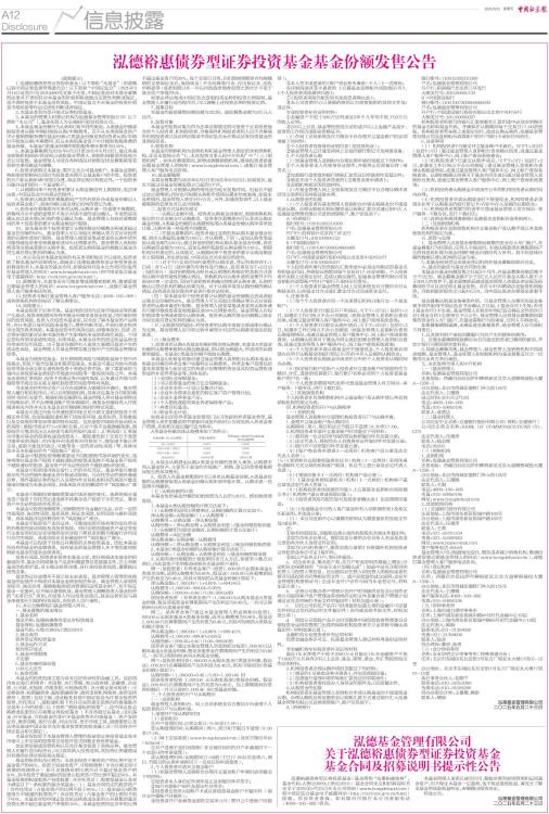 [重要提示] 1、泓德裕惠债券型证券投资基金(以下简称“本基金”)的募集已获中国证券监督管理委员会(以下简称“中国证监会”)2025年3月14日证监许可[2025]490号文准予注册,中国证监会对本基金募集的注册并不表明其对本基金的价值和收益做出实质性判断或保证,也不表明投资于本基金没有风险。中国证监会不对基金的投资价值及市场前景等作出实质性判断或者保证。 2、本基金是契约型开放式证券投资基金。 3、本基金的管理人和登记机构为泓德基金管理有限公司(以下简称“本公司”),基金托管人为交通银行股份有限公司。 4、本基金基金份额分为A类和C类不同的类别。A类基金份额是指投资者认购/申购时收取认购/申购费用,而不从本类别基金资产中计提销售服务费的基金份额;C类基金份额是指投资者认购/申购时不收取认购/申购费用,但从本类别基金资产中计提销售服务费的基金份额。本基金C类基金份额的销售服务费年费率为0.30%。 5、本基金募集期为2025年6月3日至2025年6月23日,通过各基金销售机构网站/营业网点或按基金管理人、销售机构提供的其他方式公开发售。基金管理人可综合各种情况对销售安排及募集期等其他相关事项做适当调整。 6、投资者欲购买本基金,需开立本公司基金账户。本基金直销机构和指定销售网点同时为投资者办理开立基金账户的手续。投资者的开户和认购申请可同时办理。除法律法规另有规定外,一个投资者只能开设和使用一个基金账户。 7、认购期间单个投资者的累计认购金额没有上限限制,但法律法规、中国证监会另有规定的除外。 8、投资者认购款项在募集期间产生的利息折合成基金份额记入投资者基金账户,具体份额以基金登记机构的登记为准。 9、投资者在募集期内可多次认购,认购申请一经受理不得撤销。销售网点对申请的受理并不表示对该申请的成功确认,申请的成功确认应以基金登记机构的登记确认为准。基金管理人有权对募集期间的单个投资者的累计认购金额进行限制。 10、如本基金单个投资者累计认购的基金份额数达到或者超过基金总份额的50%,基金管理人可以采取比例确认等方式对该投资者的认购申请进行限制。基金管理人接受某笔或者某些认购申请有可能导致投资者变相规避前述50%比例要求的,基金管理人有权拒绝该等全部或者部分认购申请。投资者认购的基金份额数以基金合同生效后登记机构的确认为准。 11、本公告仅对本基金发售的有关事项和规定予以说明,投资者欲了解本基金的详细情况,请阅读《泓德裕惠债券型证券投资基金招募说明书》;本基金的基金合同、招募说明书及本公告将同时发布在基金管理人的网站(www.hongdefund.com)和中国证监会基金电子披露网站(http://eid.csrc.gov.cn/fund)。 12、募集期内,本基金还有可能新增或调整销售机构,敬请留意近期基金管理人的网站(www.hongdefund.com),或拨打基金管理人客户服务电话咨询。 13、投资者可拨打基金管理人客户服务电话(4009-100-888)或各销售机构咨询电话了解认购事宜。 14、风险提示: 本基金投资于证券市场,基金净值会因为证券市场波动等因素产生波动,投资者根据所持有的基金份额享受基金收益,同时承担相应的投资风险。投资人在投资本基金前,应全面了解本基金的产品特性,充分考虑自身的风险承受能力,理性判断市场,并承担基金投资中出现的各类风险。本基金投资中的风险包括:因整体政治、经济、社会等环境因素对证券市场价格产生影响而形成的系统性风险,个别证券特有的非系统性风险,利率风险,本基金持有的固定收益品种违约带来的信用风险,由于基金份额持有人连续大量赎回基金产生的流动性风险,基金管理人在基金管理实施过程中产生的基金管理风险等。 本基金为债券型基金,其长期预期风险与预期收益高于货币市场基金,但低于混合型基金和股票型基金。本基金可通过内地与香港股票市场交易互联互通机制投资于香港证券市场,除了需要承担与境内证券投资基金类似的市场波动风险等一般投资风险之外,本基金还面临汇率风险、投资于香港证券市场的风险、以及通过内地与香港股票市场交易互联互通机制投资的风险等特有风险。 当本基金持有特定资产且存在或潜在大额赎回申请时,基金管理人履行相应程序后,可以启用侧袋机制,具体详见基金合同和招募说明书的有关章节。侧袋机制实施期间,基金管理人将对基金简称进行特殊标识,并不办理侧袋账户的申购赎回。请基金份额持有人仔细阅读相关内容并关注本基金启用侧袋机制时的特定风险。 本基金可通过内地与香港股票市场交易互联互通机制投资于香港证券市场,会面临港股通机制下因投资环境、投资标的、市场制度以及交易规则等差异带来的特有风险,包括港股市场股价波动较大的风险(港股市场实行T+0回转交易,且对个股不设涨跌幅限制,港股股价可能表现出比A股更为剧烈的股价波动)、汇率风险(汇率波动可能对基金的投资收益造成损失)、港股通机制下交易日不连贯可能带来的风险(在内地开市香港休市的情形下,港股通不能正常交易,港股不能及时卖出,可能带来一定的流动性风险)等,具体风险详见本招募说明书“风险揭示”部分。 本基金可根据投资策略需要或不同配置地市场环境的变化,选择将部分基金资产投资于港股通标的股