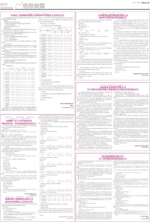 证券代码:601139 证券简称:深圳燃气 公告编号:2025-024 债券代码:113067 债券简称:燃23转债 深圳燃气关于召开2024年度 暨2025年第一季度业绩说明会的公告 本公司董事会及全体董事保证本公告内容不存在任何虚假记载、误导性陈述或者重大遗漏,并对其内容的真实性、准确性和完整性承担法律责任。 重要内容提示: ●会议召开时间:2025年6月11日(星期三) 下午 3:00-5:00 ( 会议召开地点:上海证券交易所上证路演中心(网址:https://roadshow.sseinfo.com/) ●会议召开方式:上证路演中心视频直播和网络互动 ●投资者可于2025年5月26日(星期一) 至6月9日(星期一)16:00前登录上海证券交易所上证路演中心网站首页点击“提问预征集”栏目或通过公司邮箱xgq@szgas.com.cn进行提问。公司将在说明会上对投资者普遍关注的问题进行回答。 深圳市燃气集团股份有限公司(以下简称“公司”)已于2025年4月25日发布公司2024年度报告及2025年第一季度报告,为便于广大投资者更全面深入地了解公司2024年度报告及2025年第一季度经营成果、财务状况,公司计划于2025年6月11日下午 3:00-5:00举行2024年度暨2025年第一季度业绩说明会,就投资者关心的问题进行交流。 一、 说明会类型 本次投资者说明会以视频结合网络互动形式召开,公司将针对2024年度及2025年第一季度的经营成果及财务指标的具体情况与投资者进行互动交流和沟通,在信息披露允许的范围内就投资者普遍关注的问题进行回答。 二、 说明会召开的时间、地点 (一) 会议召开时间:2025年6月11日 下午 3:00-5:00 (二) 会议召开地点:上海证券交易所上证路演中心(网址:https://roadshow.sseinfo.com/) (三) 会议召开方式:上证路演中心视频直播和网络互动 三、 参加人员 董事长:王文杰 董事会秘书:杨玺 财务总监:丛述峰 独立董事:居学成 如有特殊情况,参会人员可能调整。 四、 投资者参加方式 (一)投资者可在2025年6月11日下午3:00-5:00,通过互联网登录上证路演中心(https://roadshow.sseinfo.com/),在线参与本次业绩说明会,公司将及时回答投资者的提问。 (二)投资者可于2025年5月26日(星期一) 至6月9日(星期一)16:00前登录上证路演中心网站首页,点击“提问预征集”栏目(https://roadshow.sseinfo.com/preCallQa),根据活动时间,选中本次活动或通过公司邮箱xgq@szgas.com.cn向公司提问,公司将在说明会上对投资者普遍关注的问题进行回答。 五、联系人及咨询办法 联系人:谢国清、郭鋆辉 电话:0755-83601139 邮箱:xgq@szgas.com.cn 六、其他事项 本次投资者说明会召开后,投资者可以通过上证路演中心(https://roadshow.sseinfo.com/)查看本次投资者说明会的召开情况及主要内容。 特此公告。 深圳市燃气集团股份有限公司 2025年5月24日 证券代码:601139 证券简称:深圳燃气 公告编号:2025-023 深圳市燃气集团股份有限公司 2024年年度股东大会决议公告 本公司董事会及全体董事保证本公告内容不存在任何虚假记载、误导性陈述或者重大遗漏,并对其内容的真实性、准确性和完整性承担法律责任。 重要内容提示: ● 本次会议是否有否决议案:无 一、会议召开和出席情况 (一)股东大会召开的时间:2025年5月23日 (二)股东大会召开的地点:深圳市福田区梅坳一路268号深燃大厦十四楼第7会议室 (三)出席会议的普通股股东和恢复表决权的优先股股东及其持有股份情况: ■ (四)表决方式是否符合《公司法》及《公司章程》的规定,大会主持情况等。 本次会议由公司董事会召集,公司董事长王文杰先生主持。本次会议以现场方式和网络投票相结合的方式对股东大会通知中列明的事项进行了投票表决,表决方式符合《公司法》《上市公司股东大会规则》《上海证券交易所股票上市规则》及《公司章程》的规定。 (五)公司董事、监事和董事会秘书的出席情况 1、公司在任董事14人,出席10人,黄维义副董事长、石澜董事、纪伟毅董事、周衡翔董事因公务出差未出席会议; 2、公司在任监事4人,出席4人; 3、董事会秘书出席会议;其他高管2人出席会议,见证律师2人列席会议。 二、议案审议情况 (一)非累积投票议案 1、议案名称:公司2024年度董事会工作报告 审议结果:通过 表决情况: ■ 2、议案名称:公司2024年度监事会工作报告 审议结果:通过 表决情况: ■ 3、议案名称:公司2024年度独立董事述职报告 审议结果:通过 表决情况: ■ 4、议案名称:公司2024年度经审计的财务报告 审议结果:通过 表决情况: ■ 5、议案名称:公司2024年度利润分配方案 审议结果:通过 表决情况: ■ 6、议案名称:公司2024年年度报告及其摘要 审议结果:通过 表决情况: ■ 7、议案名称:关于续聘公司2025年度审计机构的议案 审议结果:通过 表决情况: ■ (二)涉及重大事项,5%以下股东的表决情况 ■ 三、律师见证情况 1、本次股东大会见证的律师事务所:上海市锦天城(深圳)律师事务所 律师:韩欣茹、黄栩珅 2、律师见证结论意见: 上海市锦天城(深圳)律师事务所律师认为:公司本次股东大会的召集、召开程序、出席会议人员的资格、召集人的资格、表决程序和表决结果均符合《公司法》《证券法》《上市公司股东大会规则》《上海证券交易所股票上市规则》及《公司章程》的规定,合法有效。 特此公告。 深圳市燃气集团股份有限公司董事会 2025年5月24日
