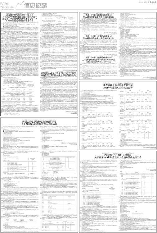 本公司及董事会全体成员保证信息披露内容的真实、准确、完整、没有虚假记载、误导性陈述或重大遗漏。 四川金时科技股份有限公司(以下简称“公司”)于2025年4月25日召开第三届董事会第十四次会议,定于2025年5月27日(星期二)召开公司2024年年度股东大会,公司于2025年4月28日发布了《年度股东大会通知》(编号:2025-026)。 本次股东大会将采用现场表决与网络投票相结合的方式,2024年度股东大会的提示性公告如下: 一、召开会议的基本情况 1、会议届次:2024年年度股东大会 2、会议召集人:公司第三届董事会 3、会议召开的合法、合规性:经本公司第三届董事会第十四次会议审议通过,决定召开2024年年度股东大会,召集程序符合有关法律、行政法规、部门规章、规范性文件和《公司章程》的规定。 4、会议召开时间: 现场会议时间:2025年5月27日(星期二)14:00 网络投票时间:通过深圳证券交易所交易系统进行网络投票的具体时间为2025年5月27日上午9:30一11:30,下午13:00一15:00;通过深圳证券交易所互联网投票系统投票的具体时间为2025年5月27日上午9:15至2025年5月27日下午15:00期间的任意时间。 5、会议召开方式:本次会议采取现场表决与网络投票相结合的方式。 现场表决:包括本人出席以及通过填写授权委托书授权他人出席。 网络投票:公司将通过深圳证券交易所交易系统(以下简称“交易系统”)和互联网投票系统(以下简称“互联网投票系统”)(http://wltp.cninfo.com.cn)向全体股东提供网络形式的投票平台,股东可在网络投票时间内通过上述系统行使表决权。股东大会股权登记日登记在册的所有股东,均有权通过相应的投票方式行使表决权,股东应选择现场投票、网络投票的一种方式,如果同一表决权出现重复投票表决的,以第一次投票表决结果为准。 6、股权登记日:2025年5月22日(星期四) 7、会议出席对象 (1)截至2025年5月22日下午15:00收市时在中国证券登记结算公司深圳分公司登记在册的本公司股东均有权出席本次股东大会,并可以以书面形式委托代理人出席会议和参加表决,该股东代理人不必是本公司的股东。 (2)公司全体董事、监事、高级管理人员; (3)公司聘请的律师; (4)根据相关法规应当出席股东大会的其他人员。 8、会议地点:四川省成都市经济技术开发区(龙泉驿区)车城西三路289号办公楼2楼会议室 二、会议审议事项 1、提交本次股东大会表决的提案 ■ 2、特别提示和说明 (1)上述议案已于2025年4月25日经公司第三届董事会第十四次会议、第三届监事会第九次会议审议通过,具体内容详见公司于2025年4月28日刊登在指定信息披露媒体和巨潮资讯网(http://www.cninfo.com.cn)上的相关公告。 (2)本次股东大会审议事项采用非累积投票制。 (3)根据《公司章程》的相关规定,本次会议审议的议案8、9、10为特别决议事项,须由出席股东大会的股东(包括股东代理人)所持有效表决权的2/3以上同意方可通过。 (4)根据中国证监会发布的《上市公司股东大会规则》《深圳证券交易所股票上市规则》《深圳证券交易所上市公司自律监管指引第1号一一主板上市公司规范运作》及《公司章程》的相关规定,本次会议审议的议案5、6、7为影响中小投资者利益的重大事项,需对中小投资者的表决单独计票并披露。(中小投资者是指除上市公司董事、监事、高级管理人员以及单独或合计持有上市公司5%以上股份的股东以外的其他股东) 三、会议登记事项 1、登记方式:现场登记、通过邮件、信函或传真方式登记。 (1)自然人股东应持本人身份证、股东账户卡办理登记手续;自然人股东委托代理人的,代理人应持代理人身份证、授权委托书、委托人股东账户卡、委托人身份证办理登记手续; (2)法人股东应由法定代表人或法定代表人委托的代理人出席会议。法定代表人出席会议的,应持加盖公章的营业执照复印件、法定代表人身份证和法人证券账户卡进行登记;法定代表人委托代理人出席会议的,代理人应持代理人本人身份证、法定代表人身份证复印件、加盖公章的营业执照复印件、法定代表人出具的授权委托书、法人证券账户卡办理登记手续; (3)异地股东可采用邮件、信函或传真的方式登记,在2025年5月26日16:00前送达公司董事会办公室,并进行电话确认; (4)本次股东大会不接受电话登记。 2、登记时间:2025年5月26日上午9:30-11:30,下午14:00-16:00。 3、登记及信函邮寄地点: 四川金时科技股份有限公司董事会办公室,信函上请注明“股东大会”字样,通讯地址:四川省成都经济技术开发区(龙泉驿区)车城西三路289号。 4、会议联系方式 联系人:龙成英 联系电话:028-68618226 传真:028-68618226(传真请注明:股东大会登记) 邮箱:jszq@jinshigp.com 联系地址:四川省成都经济技术开发区(龙泉驿区)车城西三路289号 5、出席现场会议的股东和股东代理人请务必携带相关证件原件于会前半小时到会场办理登记手续。 6、会期预计半天,出席现场会议股东食宿及交通费用自理。 四、参加网络投票的具体操作流程 本次股东大会,股东可以通过深交所交易系统和互联网投票系统参加投票(网址为http://wltp.cninfo.com.cn),网络投票的具体操作流程详见本通知附件2。 五、备查文件 1、第三届董事会第十四次会议决议。 六、附件 附件1:授权委托书; 附件2:参加网络投票的具体操作流程。 特此公告。 四川金时科技股份有限公司 董事会