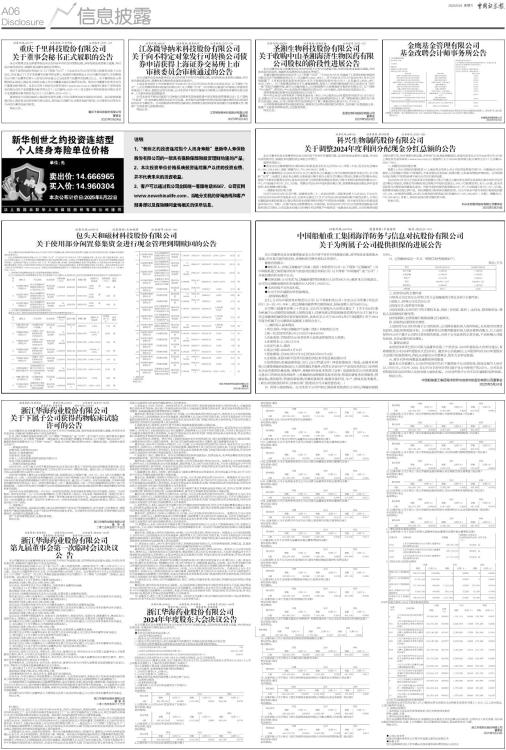 股票简称:华海药业 股票代码:600521 公告编号:临2025-062号 债券简称:华海转债 债券代码:110076 浙江华海药业股份有限公司 关于下属子公司获得药物临床试验 许可的公告 本公司董事会及全体董事保证本公告内容不存在任何虚假记载、误导性陈述或者重大遗漏,并对其内容的真实性、准确性和完整性承担个别及连带责任。 近日,浙江华海药业股份有限公司(以下简称“华海药业”或“公司”)的下属子公司上海华奥泰生物药业股份有限公司(以下简称“华奥泰”)获得新西兰药品和医疗器械安全管理局(以下简称“MEDSAFE”)、健康及残疾伦理委员会(以下简称“HDEC”)批准,在当地开展注射用HB0043 I期临床试验。现将相关情况公告如下: 一、药物基本情况 药物名称:注射用HB0043 适应症:自身免疫疾病 申请事项:临床试验 申请人:上海华奥泰生物药业股份有限公司 结论:同意开展临床试验 二、药物的其他相关情况 2025年4月,公司下属子公司华奥泰向MEDSAFE及HDEC提交了注射用HB0043的临床试验申请;近日MEDSAFE及HDEC批准华奥泰在新西兰进行注射用HB0043 I期临床试验。截至目前,公司在该项目上已合计投入研发费用约人民币6,042万元。 HB0043为重组人源化IgG1型双特异性抗体,同时靶向人白细胞介素-17A(IL-17A)和人白细胞介素-36受体(IL-36R),具有高结合和阻断活性,开发用于治疗多种难以治疗的自身免疫性疾病。相较于单抗,HB0043具有更强的抑制细胞因子诱导的炎症和纤维化反应,通过IL-17A和IL-36R的双重阻断,在多种动物疾病模型如特应性皮炎(AD)、特发性肺纤维化(IPF)、糖尿病肾病(DN)、中性粒细胞哮喘中证明了强于单抗的药效。HB0043将为单因子阻断疗法存在局限性的免疫介导的炎症性皮肤病和纤维化疾病的靶向治疗提供新的思路。 HB0043为全球首款靶向IL-17A与IL-36R的双抗药物,有望突破现有单靶点治疗的局限。当前IL-17A抑制剂(司库奇尤单抗)、IL-17A/F双重抑制剂(比美吉珠单抗)及抗IL-36R单抗(佩索利单抗)等虽已在多个适应症中取得积极疗效,但其对炎症单一维度干预在部分患者中仍存在不足。HB0043创新性地融合IL-17A与IL-36R双重靶点,有望广泛应用于多种Th17/IL-36相关的免疫介导疾病,展现出机制领先、潜力广泛的同类首创(FIC)优势。 三、风险提示 医药产品的研发,包括临床试验以及从注册申报到产业化生产的周期较长,环节较多,存在着技术、审核等多种不确定因素的影响,未来产品的竞争形势也将发生变化。公司将密切关注药品研发、注册申请的实际进展情况,及时履行信息披露义务。 请广大投资者理性投资,注意投资风险。 特此公告。 浙江华海药业股份有限公司 董 事 会 二零二五年五月二十三日 证券简称:华海药业 证券代码:600521 公告编号:临2025-064号 债券简称:华海转债 债券代码:110076 浙江华海药业股份有限公司 第九届董事会第一次临时会议决议 公 告 本公司董事会及全体董事保证本公告内容不存在任何虚假记载、误导性陈述或者重大遗漏,并对其内容的真实性、准确性和完整性承担个别及连带责任。 浙江华海药业股份有限公司(以下称“公司”)第九届董事会第一次临时会议于二零二五年五月二十三日在公司四楼会议室以现场方式召开。会议应到会董事九人,实际到会董事九名,符合召开董事会会议的法定人数。会议由公司董事李宏先生主持,公司高级管理人员列席了会议。会议程序符合《中华人民共和国公司法》(以下简称“公司法”)及《浙江华海药业股份有限公司公司章程》(以下简称“公司章程”)的规定,会议合法有效。会议审议并通过了如下决议: 一、审议通过了《关于选举公司董事长的议案》; 表决情况:同意:9票;反对:0票;弃权:0票。 会议决议:选举李宏先生为公司董事长,任期至第九届董事会届满。 二、审议通过了《关于聘任公司总裁的议案》; 表决情况:同意:9票;反对:0票;弃权:0票 会议决议:同意聘任陈保华先生为公司总裁,任期至第九届董事会届满。 该议案已经公司第八届董事会人力资源委员会第九次会议审议通过,且已经公司本次董事会审议通过。 三、审议通过了《关于聘任公司董事会秘书的议案》; 表决情况:同意:9票;反对:0票;弃权:0票。 会议决议:同意聘任祝永华先生为公司董事会秘书,任期至第九届董事会届满。 该议案已经公司第八届董事会人力资源委员会第九次会议审议通过,且已经公司本次董事会审议通过。 四、审议通过了《关于聘任公司其他高级管理人员的议案》; 表决情况:同意:9票;反对:0票;弃权:0票。 会议决议:同意聘任郭斯嘉先生、张美女士、陈其茂先生、祝永华先生、徐波先生、陈敦渊先生、林丽红女士、孟艳华女士、岡慧女士、徐觅女士、孔晓芳女士、陈宏烈先生为公司副总裁,任期至第九届董事会届满。 该议案已经公司第八届董事会人力资源委员会第九次会议审议通过,且已经公司本次董事会审议通过。 五、审议通过了《关于聘任公司首席财务官的议案》; 表决情况:同意:9票;反对:0票;弃权:0票。 会议决议:同意聘任张美女士为公司首席财务官,任期至第九届董事会届满。 该议案已经公司第八届董事会审计委员会第九次会议审议通过,且已经公司本次董事会审议通过。 六、审议通过了《关于聘任公司证券事务代表的议案》; 表决情况:同意:9票;反对:0票;弃权:0票。 会议决议:同意聘任金敏女士为公司证券事务