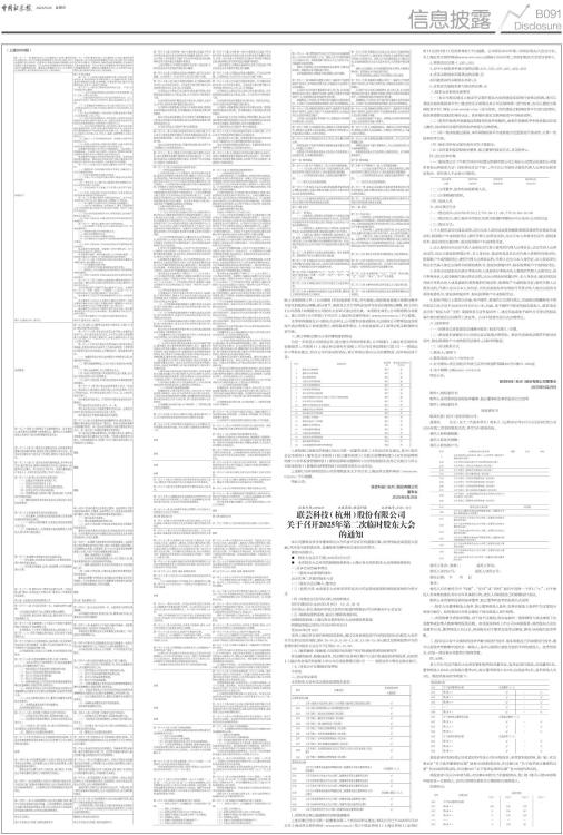 ■ ■ ■ ■ ■ ■ 除上述条款修订外,《公司章程》的其他条款不变,序号顺延;因新增或者减少条款导致序号变化的做相应调整;部分章节、条款及交叉引用所涉及序号变化的做相应调整。修订后的《公司章程》尚需提交公司股东大会审议通过后生效。本章程生效后,公司原章程自动废止。修订后的《公司章程》于同日在上海证券交易所网站(www.sse.com.cn)予以披露。 本事项尚需提交公司股东大会审议,公司董事会提请股东大会授权公司管理层或其授权代表办理相关工商变更登记、章程备案等事宜,上述变更最终以工商登记机关核准的内容为准。 三、修订和制定部分公司治理制度的情况 为进一步促进公司规范运作,建立健全内部治理机制,公司根据《上海证券交易所科创板股票上市规则》《上海证券交易所科创板上市公司自律监管指引第1号一一规范运作》等相关规定,结合公司自身实际情况,修订和制定部分公司治理制度,具体情况如下表: ■ 上述拟修订及制定的制度已经公司第一届董事会第二十次会议审议通过,其中《股东会议事规则》《董事会议事规则》《独立董事制度》《关联交易管理制度》《对外担保管理制度》《对外投资管理制度》《累积投票制实施细则》《防范控股股东及其它关联方占用公司资金制度》《募集资金管理制度》尚需提交股东大会审议。 上述修订后和新制定的公司治理制度全文于同日在上海证券交易所网站(www.sse.com.cn)予以披露。 特此公告。 联芸科技(杭州)股份有限公司 董事会 2025年5月29日 证券代码:688449 证券简称:联芸科技 公告编号:2025-019 联芸科技(杭州)股份有限公司 关于召开2025年第二次临时股东大会的通知 本公司董事会及全体董事保证公告内容不存在任何虚假记载、误导性陈述或者重大遗漏,并对其内容的真实性、准确性和完整性依法承担法律责任。 重要内容提示: ● 股东大会召开日期:2025年6月16日 ● 本次股东大会采用的网络投票系统:上海证券交易所股东大会网络投票系统 一、召开会议的基本情况 (一)股东大会类型和届次 2025年第二次临时股东大会 (二)股东大会召集人:董事会 (三)投票方式:本次股东大会所采用的表决方式是现场投票和网络投票相结合的方式 (四)现场会议召开的日期、时间和地点 召开日期时间:2025年6月16日 14 点 30 分 召开地点:浙江省杭州市滨江区西兴街道阡陌路459号D座聚光中心会议室 (五)网络投票的系统、起止日期和投票时间。 网络投票系统:上海证券交易所股东大会网络投票系统 网络投票起止时间:自2025年6月16日 至2025年6月16日 采用上海证券交易所网络投票系统,通过交易系统投票平台的投票时间为股东大会召开当日的交易时间段,即9:15-9:25,9:30-11:30,13:00-15:00;通过互联网投票平台的投票时间为股东大会召开当日的9:15-15:00。 (六)融资融券、转融通、约定购回业务账户和沪股通投资者的投票程序 涉及融资融券、转融通业务、约定购回业务相关账户以及沪股通投资者的投票,应按照《上海证券交易所科创板上市公司自律监管指引第1号 一一 规范运作》等有关规定执行。 (七)涉及公开征集股东投票权 不涉及 二、会议审议事项 本次股东大会审议议案及投票股东类型 ■ 1、说明各议案已披露的时间和披露媒体 上述议案已经公司第一届董事会第二十次会议审议通过,相关公告已于2025年5月29日在上海证券交易所网站(www.sse.com.cn)及《中国证券报》《上海证券报》《证券时报》《证券日报》《经济参考报》予以披露。公司将在2025年第二次临时股东大会召开前,在上海证券交易所网站(www.sse.com.cn)登载《2025年第二次临时股东大会会议资料》。 2、特别决议议案:1、2.01、2.02 3、对中小投资者单独计票的议案:3.01、3.02、3.03、4.01、4.02、4.03 4、涉及关联股东回避表决的议案:无 应回避表决的关联股东名称:无 5、涉及优先股股东参与表决的议案:无 三、股东大会投票注意事项 (一)本公司股东通过上海证券交易所股东大会网络投票系统行使表决权的,既可以登陆交易系统投票平台(通过指定交易的证券公司交易终端)进行投票,也可以登陆互联网投票平台(网址:vote.sseinfo.com)进行投票。首次登陆互联网投票平台进行投票的,投资者需要完成股东身份认证。具体操作请见互联网投票平台网站说明。 (二)股东所投选举票数超过其拥有的选举票数的,或者在差额选举中投票超过应选人数的,其对该项议案所投的选举票视为无效投票。 (三)同一表决权通过现场、本所网络投票平台或其他方式重复进行表决的,以第一次投票结果为准。 (四)股东对所有议案均表决完毕才能提交。 (五)采用累积投票制选举董事、独立董事的投票方式,详见附件2。 四、会议出席对象 (一)股权登记日下午收市时在中国登记结算有限公司上海分公司登记在册的公司股东有权出席股东大会(具体情况详见下表),并可以以书面形式委托代理人出席会议和参加表决。该代理人不必是公司股东。 ■ (二)公司董事、监事和高级管理人员。 (三)公司聘请的律师。 (四)其他人员 五、会议登记方法 (一)登记时间:2025年6月10日上午9:30-11:30,下午14:00-16:00 (二)登记地点:浙江省杭州市滨江区西兴街道阡陌路459号A座201公司会议室 (三)登记方式: 1、个人股东亲自出席会议的,应出示本人身份证或其他能够表明其身份的有效证件或证明、股票