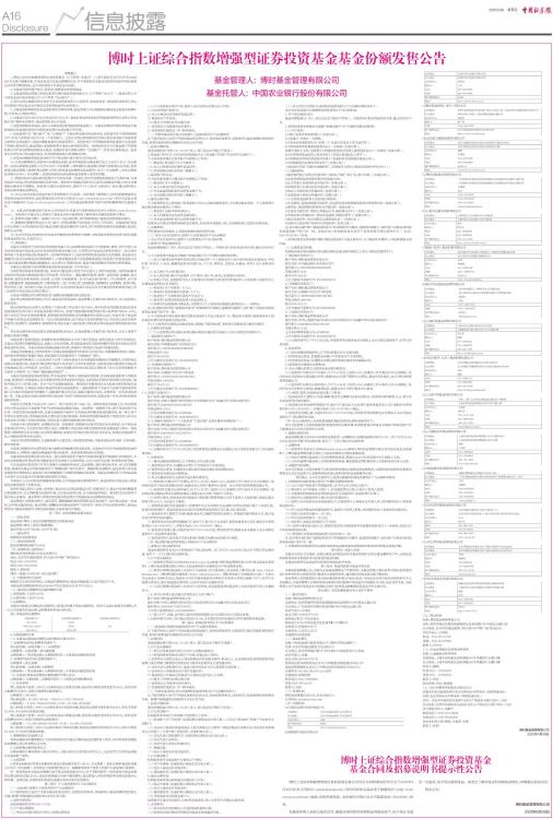 博时上证综合指数增强型证券投资基金基金合同全文和招募说明书全文于2025年5月30日在本公司网站(www.bosera.com)和中国证监会基金电子披露网站(http://eid.csrc.gov.cn/fund)披露,供投资者查阅。如有疑问可拨打本公司客服电话(95105568)咨询。 本基金管理人承诺以诚实信用、勤勉尽责的原则管理和运用基金资产,但不保证本基金一定盈利,也不保证最低收益。请充分了解本基金的风险收益特征,审慎做出投资决定。 特此公告。 博时基金管理有限公司 2025年5月30日