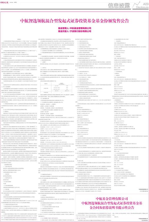 重要提示 1、中航智选领航混合型发起式证券投资基金(以下简称“本基金”)经中国证券监督管理委员会2025年5月13日证监许可[2025] 1025号文注册募集。中国证监会对本基金募集申请的注册,并不表明其对本基金的价值和收益做出实质性判断或保证,也不表明投资于本基金没有风险。中国证监会不对基金的投资价值及市场前景等做出实质性判断或者保证。 2、本基金的基金管理人和登记机构为中航基金管理有限公司(以下简称“本公司”),基金托管人为宁波银行股份有限公司(以下简称“宁波银行”)。 3、本基金为混合型证券投资基金,基金运作方式为契约型开放式。 4、本基金将自2025年6月10日一2025年6月27日通过本公司直销网点及其他基金销售机构的销售网点公开发售。 5、本基金的发售对象包括符合法律法规规定的可投资于证券投资基金的个人投资者、机构投资者、合格境外投资者、发起资金提供方以及法律法规或中国证监会允许购买证券投资基金的其他投资人。 6、认购以金额申请。投资人认购时,需按销售机构规定的方式全额缴款。投资者通过中航基金管理有限公司直销柜台、网上交易平台和其他销售机构首次认购单笔最低限额为人民币1元(含认购费),追加认购单笔最低限额为人民币1元(含认购费),其他销售机构另有规定最低单笔认购金额高于1元的,从其规定。 投资人在募集期内可以多次认购基金份额,认购申请一经受理不得撤销。 如果募集期限届满,单一投资者(基金管理人、基金管理人高级管理人员或基 金经理作为发起资金提供方除外)认购基金份额比例达到或者超过50%,基金管理人有权全部或部分拒绝该投资者的认购申请,以确保其认购基金份额比例低于50%。 7、投资者欲认购本基金,须开立本公司基金账户,已经有该类账户的投资者不须另行开立。 8、投资者应保证用于认购的资金来源合法,投资者应有权自行支配,不存在任何法律上、合约上或其他障碍。 9、基金销售机构对认购申请的受理并不代表该申请一定成功,而仅代表销售机构确实接收到认购申请。认购的确认以登记机构的确认结果为准。对于认购申请及认购份额的确认情况,投资人应及时查询并妥善行使合法权利。 10、本公告仅对本基金发售的有关事项和规定予以说明。投资者欲了解本基金的详细情况,请详细阅读刊登在基金管理人网站(www.avicfund.cn)及中国证监会基金电子披露网站(http://eid.csrc.gov.cn/fund)上的本基金《基金合同》、《招募说明书》、《托管协议》和《基金产品资料概要》。投资者亦可通过本公司网站了解本公司的详细情况和本基金发售的相关事宜。 11、各销售机构的销售网点以及开户、认购等事项的详细情况请向各销售机构咨询。未开设销售网点的地方的投资者,请拨打本公司的客户服务电话400-666-2186 咨询购买事宜。 12、本公司可综合各种情况对本基金的发售安排做适当调整。 13、风险提示: 本基金投资于证券市场,基金净值会因为证券市场波动等因素产生波动,投资人在投资本基金前,需充分了解本基金的产品特性,并承担基金投资中出现的各类风险,包括:因整体政治、经济、社会等环境因素对证券价格产生影响而形成的系统性风险,个别证券特有的非系统性风险,由于基金投资人连续大量赎回基金产生的流动性风险,基金管理人在基金管理实施过程中产生的基金管理风险,本基金的特定风险等。 本基金是混合型证券投资基金,其预期收益及风险水平高于货币市场基金和债券型基金,低于股票型基金。 本基金可参与内地与香港股票市场交易互联互通机制(以下简称“港股通机制”)下港股通相关业务,基金资产若投资于港股,会面临港股通机制下因投资环境、投资标的、市场制度以及交易规则等差异带来的特有风险,包括港股市场股价波动较大的风险(港股市场实行T+0回转交易,且对个股不设涨跌幅限制,港股股价可能表现出比A股更为剧烈的股价波动)、汇率风险(汇率波动可能对基金的投资收益造成损失)、港股通机制下交易日不连贯可能带来的风险(在内地开市香港休市的情形下,港股通不能正常交易,港股不能及时卖出,可能带来一定的流动性风险)等,具体请见本基金招募说明书“风险揭示”章节。 本基金可根据投资策略需要或不同配置的市场环境的变化,选择将部分基金资产投资于港股或选择不将基金资产投资于港股,基金资产并非必然投资港股。 投资有风险,投资人在进行投资决策前,请仔细阅读本基金的《招募说明书》、《基金合同》、基金产品资料概要等信息披露文件,了解基金的风险收益特征,并根据自身的投资目的、投资期限、投资经验、资产状况等判断本基金是否和自身的风险承受能力相适应。投资者承诺不使用贷款、发行债券等筹集的非自有资金投资本基金。 基金的过往业绩并不预示其未来表现。基金管理人管理的其他基金的业绩不构成对本基金业绩表现的保证。基金管理人提醒投资者基金投资的“买者自负”原则,在投资者作出投资决策后,基金运营状况与基金净值变化引致的投资风险,由投资者自行负责。 本基金单一投资者(基金管理人、基金管理人高级管理人员或基金经理等人员作为发起资金提供方的除外)持有基金份额数不得达到或者超过基金份额总数的50%,但在基金运作过程中因基金份额赎回等情形导致被动达