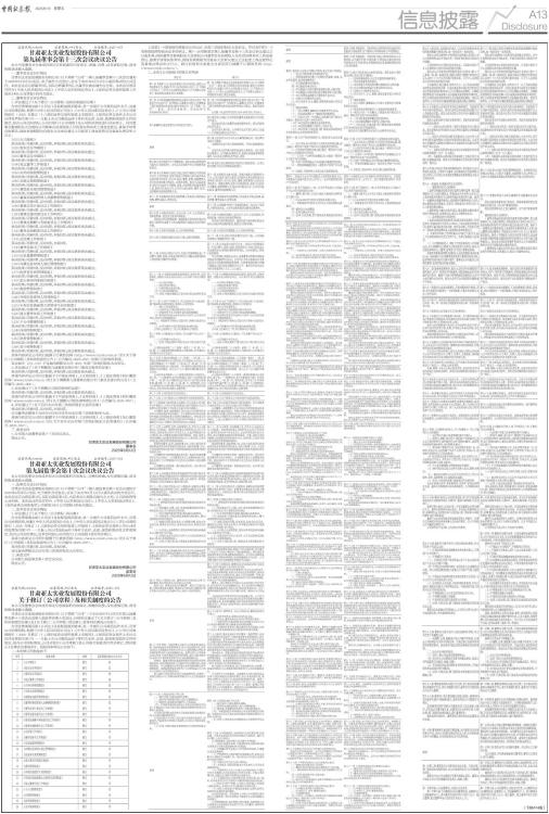 证券代码:000691 证券简称:*ST亚太 公告编号:2025-053 甘肃亚太实业发展股份有限公司 第九届董事会第十三次会议决议公告 本公司及董事会全体成员保证信息披露的内容真实、准确、完整,没有虚假记载、误导性陈述或重大遗漏。 一、董事会会议召开情况 甘肃亚太实业发展股份有限公司(以下简称“公司”)第九届董事会第十三次会议通知于2025年6月9日以电话、电子邮件方式发出,会议于2025年6月12日以通讯表决的方式召开。本次会议应出席董事9名,实际出席董事9名,由董事长陈志健先生主持。本次会议的召开符合《中华人民共和国公司法》、《中华人民共和国证券法》、《深圳证券交易所股票上市规则》和《公司章程》的有关规定。 二、董事会会议审议情况 1、审议通过了《关于修订〈公司章程〉及相关制度的议案》 为全面贯彻落实新《公司法》及其配套规则要求,进一步提升公司规范运作水平,完善公司治理结构,根据《中华人民共和国公司法》、《中华人民共和国证券法》、《上市公司章程指引(2025 年修订)》、《深圳证券交易所股票上市规则》、《深圳证券交易所上市公司自律监管指引第1号一一主板上市公司规范运作》等有关法律、法规、规章和规范性文件的规定,结合公司实际情况,公司对现行《公司章程》及公司相关制度进行同步修订。同时董事会提请股东大会授权公司董事会及其授权人员负责办理本次工商变更登记、备案手续等具体事项,授权有效期限为自股东大会审议通过之日起至工商变更登记及备案办理完毕之日止。 1.01《公司章程》 表决结果:同意9票,反对0票,弃权0票;该议案获表决通过。 1.02《股东会议事规则》 表决结果:同意9票,反对0票,弃权0票;该议案获表决通过。 1.03《董事会议事规则》 表决结果:同意9票,反对0票,弃权0票;该议案获表决通过。 1.04《独立董事工作制度》 表决结果:同意9票,反对0票,弃权0票;该议案获表决通过。 1.05《对外担保管理制度》 表决结果:同意9票,反对0票,弃权0票;该议案获表决通过。 1.06《关联交易管理制度》 表决结果:同意9票,反对0票,弃权0票;该议案获表决通过。 1.07《募集资金使用管理制度》 表决结果:同意9票,反对0票,弃权0票;该议案获表决通过。 1.08《董事和高级管理人员薪酬管理制度》 表决结果:同意9票,反对0票,弃权0票;该议案获表决通过。 1.09《董事会审计委员会工作细则》 表决结果:同意9票,反对0票,弃权0票;该议案获表决通过。 1.10《董事会提名委员会工作细则》 表决结果:同意9票,反对0票,弃权0票;该议案获表决通过。 1.11《董事会薪酬与考核委员会工作细则》 表决结果:同意9票,反对0票,弃权0票;该议案获表决通过。 1.12《董事会战略委员会工作细则》 表决结果:同意9票,反对0票,弃权0票;该议案获表决通过。 1.13《总经理工作细则》 表决结果:同意9票,反对0票,弃权0票。 1.14《董事会秘书工作细则》 表决结果:同意9票,反对0票,弃权0票;该议案获表决通过。 1.15《信息披露管理制度》 表决结果:同意9票,反对0票,弃权0票;该议案获表决通过。 1.16《内幕信息知情人登记管理制度》 表决结果:同意9票,反对0票,弃权0票;该议案获表决通过。 1.17《投资者关系管理制度》 表决结果:同意9票,反对0票,弃权0票;该议案获表决通过。 1.18《重大事项内部报告制度》 表决结果:同意9票,反对0票,弃权0票;该议案获表决通过。 1.19《舆情管理制度》 表决结果:同意9票,反对0票,弃权0票;该议案获表决通过。 1.20《外部信息使用人管理制度》 表决结果:同意9票,反对0票,弃权0票;该议案获表决通过。 1.21《年报信息披露重大差错责任追究制度》 表决结果:同意9票,反对0票,弃权0票;该议案获表决通过。 1.22《独立董事年报工作制度》 表决结果:同意9票,反对0票,弃权0票;该议案获表决通过。 1.23《子公司管理制度》 表决结果:同意9票,反对0票,弃权0票;该议案获表决通过。 1.24《内部控制制度》 表决结果:同意9票,反对0票,弃权0票;该议案获表决通过。 1.25《财务管理制度》 表决结果:同意9票,反对0票,弃权0票;该议案获表决通过。 1.26《会计核算制度》 表决结果:同意9票,反对0票,弃权0票;该议案获表决通过。 具体内容详见公司同日披露于巨潮资讯网(http://www.cninfo.com.cn)的《关于修订〈公司章程〉及相关制度的公告》(公告编号:2025-055)及修订后的相关制度。 本议案中 1.01-1.08 子议案尚需提交公司 2025 年第三次临时股东大会审议。 2、审议通过了《关于调整第九届董事会部分专门委员会委员的议案》 表决结果:同意9票,反对0票,弃权0票;该议案获表决通过。 具体内容详见公司同日披露于《中国证券报》、《证券时报》、《上海证券报》和巨潮资讯网(www.cninfo.com.cn)的《关于调整第九届董事会部分专门委员会委员的公告》(公告编号:2025-056)。 3、审议通过了《关于调整公司组织架构的议案》 表决结果:同意9票,反对0票,弃权0票;该议案获表决通过。 具体内容详见公司同日披露于《中国证券报》、《证券时报》、《上海证券报》和巨潮资讯网(www.cninfo.com.cn)的《关于调整公司组织架构的公告》(公告编号:2025-057)。 4、审议通过了《关于召开2025年第三次临时股东大会的议案》 表决结果:同意9票,反对0票,弃权0票。 公司董事会提请于2025年6月30日召开2025年第三次临时股东大会。 具体内容详见公司同日披露于《中