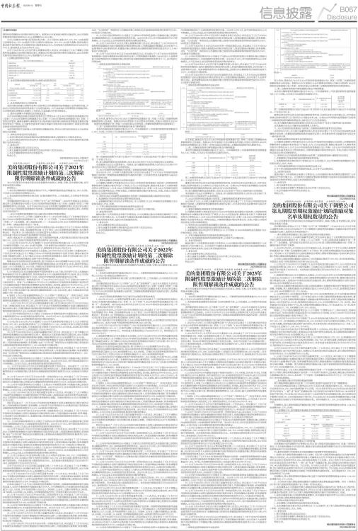 限制性股票激励计划回购价格的议案》,根据2023年度利润分配的实施安排,2023年限制性股票的回购价格将由25.89元/股调整为22.89元/股。 公司已实施2024年度A股利润分配方案,以公司现有A股股本7,026,396,324股剔除已回购股份42,473,844股后可参与分配的A股股本6,983,922,480股为基数,按照每股分配金额不变的原则,向全体股东每10股派发现金35元,本次权益分派股权登记日为2025年6月11日,除权除息日为2025年6月12日。 公司于2025年6月12日召开第五届董事会第九次会议,审议通过了《关于调整公司限制性股票激励计划回购价格的议案》,根据2024年度A股利润分配的实施安排,2023年限制性股票的回购价格将由22.89元/股调整为19.39元/股。 3、回购注销的相关内容 ■ 五、本次回购注销限制性股票后A股股本结构变化表 ■ 六、本次回购注销对公司的影响 本次回购注销部分限制性股票不会影响公司各期限制性股票激励计划草案的实施,不会对公司的财务状况和经营成果产生实质性影响,亦不会影响公司管理团队的勤勉尽职。公司管理团队将继续认真履行工作职责,以创造最大价值回报股东。 七、董事会薪酬与考核委员会的核查意见 公司本次回购注销部分限制性股票符合《管理办法》及《2021年限制性股票激励计划(草案)》《2022年限制性股票激励计划(草案)》《2023年限制性股票激励计划(草案)》的规定和要求,董事会薪酬与考核委员会对拟回购注销的部分限制性股票数量及激励对象的名单进行了核查,认为董事会就本次回购注销履行的程序符合相关规定,同意本次回购注销部分限制性股票事项。 本次回购注销不会影响公司管理团队的勤勉尽职,符合公司的实际情况及公司业务发展的实际需要。 八、律师法律意见的结论性意见 1、本次回购注销已经取得现阶段必要的授权和批准,尚需提交公司股东会审议; 2、本次回购注销的相关事宜符合《管理办法》《公司章程》及公司相关限制性股票激励计划的相关规定。 九、备查文件 1、第五届董事会第九次会议决议; 2、第五届董事会薪酬与考核委员会2025年第三次会议决议; 3、北京市嘉源律师事务所法律意见书。 特此公告。 美的集团股份有限公司董事会 2025年6月13日 证券代码:000333 证券简称:美的集团 公告编号:2025-051 美的集团股份有限公司关于2021年 限制性股票激励计划的第三次解除 限售期解锁条件成就的公告 本公司及董事会全体成员保证信息披露的内容真实、准确、完整,没有虚假记载、误导性陈述或重大遗漏。 特别提示: 1、本次符合解锁条件的激励对象共计87人,可解锁的限制性股票数量为2,283,352股,占目前公司A股股份总额的0.03%; 2、本次限制性股票解锁在相关部门办理完解锁手续、上市流通前,公司将发布相关提示性公告。 美的集团股份有限公司(以下简称“公司”或“美的集团”)2020年年度股东大会审议通过的《美的集团股份有限公司2021年限制性股票激励计划(草案)及摘要》的第三个解锁期解锁条件已经成就,公司于2025年6月12日召开的第五届董事会第九次会议审议通过了《关于2021年限制性股票激励计划的第三次解除限售期解锁条件成就的议案》,现将相关事项说明如下: 一、2021年限制性股票激励计划已履行的决策程序和批准情况 1、2021年4月28日,公司第三届董事会第三十二次会议审议通过了《美的集团股份有限公司2021年限制性股票激励计划(草案)》(以下简称“《2021年限制性股票激励计划(草案)》”)及其摘要。第三届监事会第二十一次会议对公司《2021年限制性股票激励计划(草案)》激励对象名单进行了核查。 2、2021年5月21日,公司召开2020年年度股东大会,审议通过了《关于公司2021年限制性股票激励计划(草案)及其摘要的议案》《关于制定〈2021年限制性股票激励计划实施考核办法〉的议案》《关于提请股东大会授权董事会办理2021年限制性股票激励计划相关事宜的议案》等2021年限制性股票激励计划相关议案。 本次计划拟授予147名激励对象1,057万股限制性股票,占美的集团当时发行股本总额的0.15%,本次计划授予的限制性股票的价格为41.49元/股。 3、公司已经于2021年5月27日披露了《2020年度利润分配实施公告》,以公司现有可参与分配的总股数6,913,968,359股为基数,向全体股东每10股派16.005847元人民币现金。本次权益分派股权登记日为2021年6月1日,除权除息日为2021年6月2日。 4、根据美的集团2020年年度股东大会授权,2021年6月4日公司召开第三届董事会第三十四次会议审议通过《关于调整公司2021年限制性股票激励计划授予价格、激励对象名单及授予数量的议案》、《关于确定公司2021年限制性股票激励计划授予日的议案》和《关于公司2021年限制性股票激励计划授予相关事项的议案》。 根据2020年度利润分配的实施安排,授予价格由41.49元/股调整为39.92元/股。同时因激励对象离职原因,将2021年限制性股票的激励对象由147名变更为145名,限制性股票总量由1,057万股调整为1,041万股,并确定本次限制性股票的授予日为2021年6月4日,同意公司向145名激励对象授予1041万股限制性股票。 5、公司本次拟向145名激励对象授予限制性股票1,041万股,但在授予日后,6名激励对象因离职或主动不认缴等原因,其所获授的合计47万股限制性股票予以取消,故公司实际授予限制性股票的激励对象为139名,实际授予的限制性股票的数量