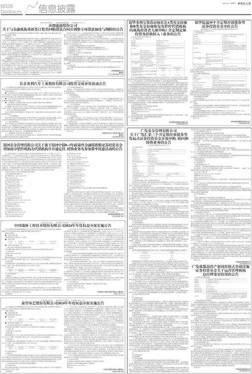 公告送出日期:2025年6月13日 1.公告基本信息 ■ 2.日常申购、赎回(转换)业务的办理时间 本基金本次办理申购、赎回和转换业务的开放期为2025年6月16日至2025年7月11日。自2025年7月12日起至2025年10月12日(含)为本基金的下一个封闭期,封闭期内本基金不办理申购、赎回和转换业务。 本基金开放期内,投资者在开放日办理基金份额的申购和赎回,具体办理时间为上海证券交易所、深圳证券交易所的正常交易日的交易时间,但基金管理人根据法律法规、中国证监会的要求或基金合同的规定公告暂停申购、赎回时除外。 基金合同生效后,若出现新的证券交易市场、证券交易所交易时间变更或其他特殊情况,基金管理人将视情况对前述开放日及开放时间进行相应的调整,但应在实施日前依照《公开募集证券投资基金信息披露管理办法》(以下简称《信息披露办法》)的有关规定在规定媒介上公告。 本基金每个封闭期结束之后第一个工作日起进入开放期,开放期的期限为自封闭期结束之日后第一个工作日起(含该日)不少于一个工作日、不超过二十个工作日的期间,具体期间由基金管理人在封闭期结束前公告说明。 如在开放期内发生不可抗力情形致使基金无法按时开放或需依据《基金合同》暂停申购与赎回业务的,基金管理人有权合理调整申购或赎回业务的办理期间并予以公告,在不可抗力情形影响因素消除之日的下一个工作日起,继续计算该开放期时间。 基金管理人不得在基金合同约定之外的日期或者时间办理基金份额的申购、赎回或者转换。在开放期内,投资者在基金合同约定之外的日期和时间提出申购、赎回或转换申请且登记机构确认接受的,其基金份额申购、赎回价格为该开放期下一开放日各类基金份额申购、赎回的价格;但若投资者在开放期最后一日业务办理时间结束之后提出申购、赎回或者转换申请的,视为无效申请。 3.日常申购业务 3.1申购金额限制 通过代销机构或基金管理人网上交易系统每个基金账户首次最低申购金额为1元(含申购费)人民币;投资人追加申购时最低申购限额及投资金额级差详见各销售机构网点公告。 基金管理人可以规定单个投资人累计持有的基金份额上限,具体规定请参见招募说明书或相关公告。 当接受申购申请对存量基金份额持有人利益构成潜在重大不利影响时,基金管理人应当采取设定单一投资者申购金额上限或基金单日净申购比例上限、拒绝大额申购、暂停基金申购等措施,切实保护存量基金份额持有人的合法权益。基金管理人基于投资运作与风险控制的需要,可采取上述措施对基金规模予以控制。具体见基金管理人相关公告。 基金管理人可以根据市场情况,在法律法规允许的情况下,调整上述规定的数量或比例限制。基金管理人必须在调整前依照《信息披露办法》的有关规定在规定媒介上公告。 3.2申购费率 本基金A类基金份额在申购时收取申购费用,C类基金份额不收取申购费用。本基金A类基金份额对申购设置级差费率。投资者在一天之内如果有多笔申购,适用费率按单笔分别计算。 A类基金份额申购费率最高不高于0.60%,且随申购金额的增加而递减,如下表所示: ■ 基金销售机构可以根据自身情况对申购费用实行一定的优惠,具体以实际收取为准。 本基金对通过本公司直销中心申购本基金A类基金份额的特定投资者与除此之外的其他普通投资者实施差别的申购费率,特定投资者范围及具体费率优惠详见基金管理人于2022年5月19日发布的《关于面向特定投资者通过直销柜台认、申购旗下所有基金实施费率优惠的公告》和2022年9月2日发布的《广发基金管理有限公司关于调整“特定投资群体(养老金客户)”的客户适用范围的公告》及其他相关公告。 (1)申购金额含申购费。本基金A类基金份额的申购费用由A类基金份额申购人承担,不列入基金财产,主要用于本基金的市场推广、销售、注册登记等各项费用。 (2)基金管理人对部分基金持有人费用的减免不构成对其他投资者的同等义务。 (3)基金管理人可以在基金合同约定的范围内调整费率或收费方式,并最迟应于新的费率或收费方式实施日前依照《信息披露办法》的有关规定在规定媒介上公告。 (4)基金管理人可以在不违背法律法规规定及《基金合同》约定及对基金份额持有人利益无实质不利影响的情形下根据市场情况制定基金促销计划,针对特定地域范围、特定行业、特定职业的投资者以及以特定交易方式(如网上交易等)等进行基金交易的投资者定期或不定期地开展基金促销活动。在基金促销活动期间,按相关监管部门要求履行相关手续后基金管理人可以适当调低基金销售服务费率、申购费率和基金赎回费率。 (5)当发生大额申购或赎回情形时,基金管理人可以采用摆动定价机制,以确保基金估值的公平性,具体处理原则与操作规范遵循相关法律法规以及监管部门、自律规则的规定。 3.3其他与申购相关的事项 无。 4.日常赎回业务 4.1赎回份额限制 基金份额持有人在各代销机构的最低赎回、转换转出及最低持有份额为1份基金份额,基金份额持有人当日持有份额减少导致在销售机构同一交易账户保留的基金份额不足1份时,注册登记机构有权将全部剩余份额自动赎回。各基金代理销售机构有不同规定的,投资者在该销售机构办理上述业务时,需同时遵循销