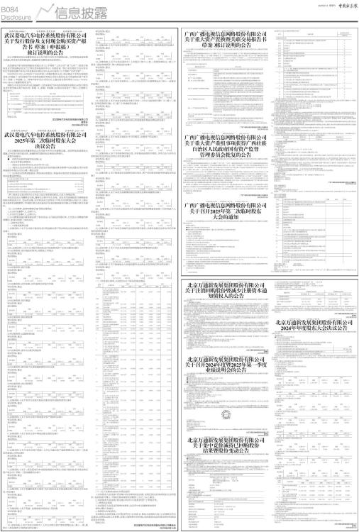 股票简称:广西广电 股票代码:600936 编号:2025-032 广西广播电视信息网络股份有限公司 关于重大资产置换暨关联交易报告书(草案)修订说明的公告 本公司董事会及全体董事保证本公告内容不存在任何虚假记载、误导性陈述或者重大遗漏,并对其内容的真实性、准确性和完整性承担法律责任。 广西广播电视信息网络股份有限公司(以下简称“公司”)于2025年5月29日披露了《广西广播电视信息网络股份有限公司重大资产置换暨关联交易报告书(草案)》(以下简称“重组报告书”),于2025年6月6日收到上海证券交易所《关于对广西广播电视信息网络股份有限公司重大资产置换草案的问询函》(上证公函【2025】0788号)(以下简称“《问询函》”)。公司会同中介机构完成了《问询函》相关问题的核查及回复,并根据相关要求对《问询函》回复内容进行公开披露,同时对重组报告书等相关信息披露文件予以补充更新。 本次补充和修订的主要内容如下: ■ 除上述修订和补充披露之外,公司对重组报告书(草案)全文进行了梳理和自查,完善了少许数字或文字内容,对重组方案无影响。 特此公告。 广西广播电视信息网络股份有限公司董事会 2025年6月13日 股票简称:广西广电 股票代码:600936 编号:2025-033 广西广播电视信息网络股份有限公司 关于重大资产重组事项获得广西壮族自治区人民政府国有资产监督 管理委员会批复的公告 本公司董事会及全体董事保证本公告内容不存在任何虚假记载、误导性陈述或者重大遗漏,并对其内容的真实性、准确性和完整性承担法律责任。 广西广播电视信息网络股份有限公司(以下简称“广西广电”、“公司”)拟将其持有的全资子公司广西广电网络科技发展有限公司(以下简称“广电科技”)100%股权与广西北部湾投资集团有限公司(以下简称“北投集团”)持有的广西交科集团有限公司(以下简称“交科集团”)51%股权进行置换,本次置入资产和置出资产的交易作价不存在差额,不涉及发行股份购买资产,不涉及支付现金对价(以下简称“本次交易”)。本次交易完成后,交科集团将成为公司的控股子公司。 公司于2025年5月29日召开了第六届董事会第十三次会议,审议通过了本次交易相关事项,内容详见公司于2025年5月30日在上海证券交易所网站(www.sse.com.cn)和法定信息披露媒体《中国证券报》《上海证券报》《证券时报》《证券日报》上披露的相关公告。 近日,公司收到控股股东北投集团转发的广西壮族自治区人民政府国有资产监督管理委员会(以下简称“自治区国资委”)出具的《自治区国资委关于广西广电重大资产置换涉及置入置出资产评估结果的批复》(桂国资复〔2025〕32号)及《自治区国资委关于广西广播电视信息网络股份有限公司重大资产置换有关事项的批复》(桂国资复〔2025〕33号),自治区国资委同意广西广播电视信息网络股份有限公司重大资产置换暨关联交易方案,并对相关资产评估结果予以核准。 截至本公告披露日,本次交易尚需提交公司股东大会审议通过后方可实施,能否通过尚存在一定不确定性。公司将根据本次交易的进展情况,严格按照有关法律法规的规定及时履行信息披露义务。公司郑重提醒广大投资者,有关公司信息以公司在上海证券交易所网站(www.sse.com.cn)和法定信息披露媒体《中国证券报》《上海证券报》《证券时报》《证券日报》刊登的相关公告为准,敬请广大投资者理性投资,注意投资风险。 特此公告。 广西广播电视信息网络股份有限公司董事会 2025年6月13日 证券代码:600936 证券简称:广西广电 公告编号:2025-034 广西广播电视信息网络股份有限公司 关于召开2025年第二次临时股东 大会的通知 本公司董事会及全体董事保证本公告内容不存在任何虚假记载、误导性陈述或者重大遗漏,并对其内容的真实性、准确性和完整性承担法律责任。 重要内容提示: ●股东大会召开日期:2025年6月30日 ●本次股东大会采用的网络投票系统:上海证券交易所股东大会网络投票系统 一、召开会议的基本情况 (一)股东大会类型和届次 2025年第二次临时股东大会 (二)股东大会召集人:董事会 (三)投票方式:本次股东大会所采用的表决方式是现场投票和网络投票相结合的方式 (四)现场会议召开的日期、时间和地点 召开的日期时间:2025年6月30日 11点 00分 召开地点:广西南宁市青秀区云景路景晖巷8号广西广电网络公司21楼会议室 (五)网络投票的系统、起止日期和投票时间。 网络投票系统:上海证券交易所股东大会网络投票系统 网络投票起止时间:自2025年6月30日 至2025年6月30日 采用上海证券交易所网络投票系统,通过交易系统投票平台的投票时间为股东大会召开当日的交易时间段,即9:15-9:25,9:30-11:30,13:00-15:00;通过互联网投票平台的投票时间为股东大会召开当日的9:15-15:00。 (六)融资融券、转融通、约定购回业务账户和沪股通投资者的投票程序 涉及融资融券、转融通业务、约定购回业务相关账户以及沪股通投资者的投票,应按照《上海证券交易所上市公司自律监管指引第1号 一 规范运作》等有关规定执行。 (七)涉及公开征集股东投票权 无 二、会议审议事项 本次股东大会审议议案及投票股东类型 ■ 1、各议案已披露的时间和披露媒体 上述议案已经2025年5月29日公司第六届董事会第十三次会议、第六届监事会第十次会议审议