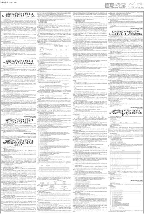证券代码:688271 证券简称:联影医疗 公告编号:2025-019 上海联影医疗科技股份有限公司 第二届监事会第十三次会议决议公告 本公司监事会及全体监事保证本公告内容不存在任何虚假记载、误导性陈述或者重大遗漏,并对其内容的真实性、准确性和完整性依法承担法律责任。 一、监事会会议召开情况 上海联影医疗科技股份有限公司(以下简称“公司”或“联影医疗”)第二届监事会第十三次会议于2025年6月13日在公司会议室召开,会议同时采用了现场与通讯相结合的表决方式,经公司全体监事书面同意,本次监事会临时会议豁免提前5日的通知时限,本次会议通知已于2025年6月10日送达公司全体监事。本次会议由监事会主席万莉娟女士主持,会议应参加表决监事3人,实际参加表决监事3人。本次会议的召集、召开符合《中华人民共和国公司法》(以下简称“《公司法》”)等法律法规以及《上海联影医疗科技股份有限公司章程》(以下简称“《公司章程》”)的相关规定,会议决议合法、有效。 二、监事会会议审议情况 (一)审议通过《关于公司〈2025年限制性股票激励计划(草案)〉及其摘要的议案》 经审议,监事会认为:公司《2025年限制性股票激励计划(草案)》(以下简称“《2025年激励计划(草案)》”)及其摘要的内容符合《公司法》《中华人民共和国证券法》(以下简称“《证券法》”)《上市公司股权激励管理办法》《上海证券交易所科创板股票上市规则》《科创板上市公司自律监管指南第4号一一股权激励信息披露》等相关法律、法规和规范性文件的规定。公司2025年限制性股票激励计划(以下简称“2025年激励计划”)的实施将有利于公司的持续发展,不存在损害公司及全体股东利益的情形。 具体内容详见公司同日在上海证券交易所网站(www.sse.com.cn)披露的《联影医疗2025年限制性股票激励计划(草案)》及《联影医疗2025年限制性股票激励计划(草案)摘要公告》(公告编号:2025-020)。 表决结果:同意3票、反对0票、弃权0票。 本议案尚需提交公司股东会审议,并须经出席股东会的非关联股东所持有效表决权的三分之二以上表决通过。 (二)审议通过《关于公司〈2025年限制性股票激励计划实施考核管理办法〉的议案》 经审议,监事会认为:公司《2025年限制性股票激励计划实施考核管理办法》符合相关法律、法规和规范性文件的规定以及公司的实际情况,能保证2025年激励计划的顺利实施及规范运行,考核体系具有全面性、综合性及可操作性,考核指标设定具有良好的科学性和合理性,同时对激励对象具有约束效果,能够达到2025年激励计划的考核目的。 具体内容详见公司同日在上海证券交易所网站(www.sse.com.cn)披露的《联影医疗2025年限制性股票激励计划实施考核管理办法》。 表决结果:同意3票、反对0票、弃权0票。 本议案尚需提交公司股东会审议,并须经出席股东会的非关联股东所持有效表决权的三分之二以上表决通过。 (三)审议通过《关于核实公司〈2025年限制性股票激励计划首次授予激励对象名单〉的议案》 对2025年激励计划首次授予的激励对象名单进行初步核查后,监事会认为:列入公司2025年激励计划首次授予激励对象名单的人员具备《公司法》《证券法》等法律、法规及规范性文件和《公司章程》规定的任职资格,不存在最近12个月内被证券交易所认定为不适当人选的情形;不存在最近12个月内被中国证监会及其派出机构认定为不适当人选的情形;不存在最近12个月内因重大违法违规行为被中国证监会及其派出机构行政处罚或者采取市场禁入措施的情形;不存在具有《公司法》规定的不得担任公司董事、高级管理人员情形的情形;不存在具有法律法规规定不得参与上市公司股权激励的情形,不存在中国证监会认定的其他情形,符合《管理办法》规定的激励对象条件,符合公司《2025年激励计划(草案)》及其摘要规定的激励对象范围,其作为公司2025年激励计划激励对象的主体资格合法、有效。 公司将在召开股东会前,在公司内部公示激励对象的姓名和职务,公示期不少于10天。监事会将于股东会审议股权激励计划前5日披露对激励对象名单的审核意见及其公示情况的说明。 具体内容详见公司同日在上海证券交易所网站(www.sse.com.cn)披露的《联影医疗2025年限制性股票激励计划首次授予激励对象名单》。 表决结果:同意3票、反对0票、弃权0票。 特此公告。 上海联影医疗科技股份有限公司监事会 2025年6月14日 证券代码:688271 证券简称:联影医疗 公告编号:2025-021 上海联影医疗科技股份有限公司 关于拟为部分客户提供担保的公告 本公司董事会及全体董事保证本公告内容不存在任何虚假记载、误导性陈述或者重大遗漏,并对其内容的真实性、准确性和完整性依法承担法律责任。 重要内容提示: ● 被担保人名称:部分信誉良好但需融资支付货款的客户;上述客户应为通过第三方金融机构审核符合融资条件且与公司不存在关联关系的客户。 ● 本次担保额度及已实际为其提供的担保余额:本次审议的担保额度不超过人民币5亿元(含本数);截至本公告披露日,上海联影医疗科技股份有限公司(以下简称“联影医疗”或“公司”)为客户提供担保余额为0万元。 ● 公司及子公司将要求客户或客户指定的第三方就公司承担的担保责任提供必要的反担保措施。 ● 截至本公
