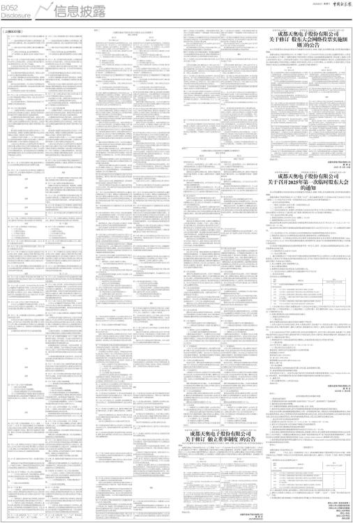 ■ 附件二 《成都天奥电子股份有限公司股东大会议事规则》 修订对照表 ■ ■ ■ 附件三 《成都天奥电子股份有限公司董事会议事规则》 修订对照表 ■ 证券代码:002935 证券简称:天奥电子 公告编号:2025-024 成都天奥电子股份有限公司 关于修订《独立董事制度》的公告 本公司及董事会全体成员保证信息披露的内容真实、准确、完整,没有虚假记载、误导性陈述或重大遗漏。 成都天奥电子股份有限公司(以下简称“公司“)于2025年6月20日召开第五届董事会第十五次会议,审议通过《关于修订〈成都天奥电子股份有限公司独立董事制度〉的议案》,根据《中华人民共和国公司法》、《上市公司独立董事管理办法》等法律、法规和规范性文件及《成都天奥电子股份有限公司章程》的有关规定,结合公司实际情况,公司拟修订《成都天奥电子股份有限公司独立董事制度》,具体修订内容对照如下: ■ 特此公告。 成都天奥电子股份有限公司 董 事 会 2025年6月20日 证券代码:002935 证券简称:天奥电子 公告编号:2025-025 成都天奥电子股份有限公司 关于修订《股东大会网络投票实施细则》的公告 本公司及董事会全体成员保证信息披露的内容真实、准确、完整,没有虚假记载、误导性陈述或重大遗漏。 成都天奥电子股份有限公司(以下简称“公司“)于2025年6月20日召开第五届董事会第十五次会议,审议通过《关于修订〈成都天奥电子股份有限公司股东大会网络投票实施细则〉的议案》,根据《中华人民共和国公司法》、《深圳证券交易所上市公司股东会网络投票实施细则》等法律、法规和规范性文件及《成都天奥电子股份有限公司章程》的有关规定,结合公司实际情况,公司拟修订《成都天奥电子股份有限公司股东大会网络投票实施细则》,具体修订内容对照如下: ■ 特此公告。 成都天奥电子股份有限公司 董 事 会 2025 年 6月 20日 证券代码:002935 证券简称:天奥电子 公告编号:2025-026 成都天奥电子股份有限公司 关于召开2025年第一次临时股东大会的通知 本公司及董事会全体成员保证信息披露的内容真实、准确、完整,没有虚假记载、误导性陈述或重大遗漏。 成都天奥电子股份有限公司(以下简称“公司”)第五届董事会第十五次会议决议于2025年7月9日(星期三)15:00召开2025年第一次临时股东大会,现将会议有关事项通知如下: 一、召开会议的基本情况 (一)股东大会届次:2025年第一次临时股东大会 (二)会议召集人:公司董事会 (三)会议召开的合法、合规性:本次股东大会会议召开符合《中华人民共和国公司法》、《上市公司股东会规则》有关法律、行政法规、部门规章、规范性文件和《公司章程》等的规定。 (四)会议召开的日期、时间: 1、现场会议时间:2025年7月9日(星期三)15:00 2、网络投票时间:2025年7月9日 通过深圳证券交易所交易系统进行网络投票的具体时间为2025年7月9日9:15一9:25,9:30一11:30和13:00一15:00; 通过深圳证券交易所互联网投票系统投票的具体时间为:2025年7月9日9:15一15:00期间的任意时间。 (五)会议的召开方式:本次股东大会采用现场表决与网络投票相结合的方式召开。 1、现场表决:股东本人出席现场会议或者通过授权委托他人出席现场会议; 2、网络投票:公司将通过深圳证券交易所交易系统和深圳证券交易所互联网投票系统(http://wltp.cninfo.com.cn)向公司股东提供网络形式的投票平台,股东可以在网络投票期间内通过上述系统行使表决权。 公司股东只能选择现场表决或网络投票中的一种方式,如同一表决权出现重复投票表决的,以第一次投票表决结果为准。 (六)股权登记日:2025年7月2日 (七)会议出席对象: 1、截止股权登记日下午收市时在中国证券登记结算有限责任公司深圳分公司登记在册的本公司全体股东;上述本公司全体股东均有权出席股东大会,并可以书面形式委托代理人出席会议和参加表决,该股东代理人不必是本公司股东; 2、本公司董事、监事、高级管理人员; 3、本公司聘请的律师; 4、根据相关法规应当出席股东大会的其他人员。 (八)会议召开地点:成都市金牛区盛业路66号107会议室 二、会议审议事项 本次股东大会提案编码表: ■ 1、上述议案已经公司第五届董事会第十五次会议审议通过,具体内容详见公司于2025年6月21日在《证券时报》、《中国证券报》、《上海证券报》、《证券日报》和巨潮资讯网(http://www.cninfo.com.cn)刊登的相关公告。 2、议案1需经股东大会以特别决议审议通过。 三、现场会议的登记方法 (一)登记方式: 股东办理参加现场会议登记手续时应提供下列材料: 1、自然人股东亲自出席会议的,持本人身份证原件、股东账户卡、持股凭证进行登记;委托代理人出席会议的,持本人身份证原件、委托人身份证、授权委托书(附件2)、委托人股东账户卡、持股凭证进行登记; 2、法人股东由法定代表人出席会议的,持营业执照复印件、法定代表人身份证明、股东账户卡、持股凭证进行登记;由法定代表人委托的代理人出席会议的,持本人身份证、营业执照复印件、授权委托书、股东账户卡、持股凭证进行登记。 3、异地股东可以书面信函或传真办理登记,信函或传真以抵达公司的时间为准。 (二)登记时间: 2025年7月4日(星期五:9:30-11:30,13:30-15:30) (三)登记地点及会议联系方式: 联系地址:成都市金牛区盛业路66号证券事务部 邮政